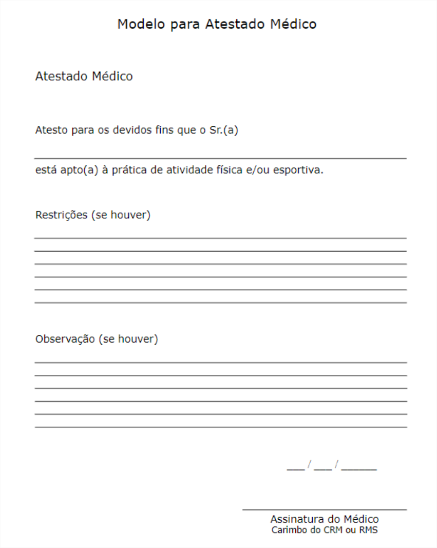 <p>Modelo para Atestado Médico Atestado Médico Atesto para os devidos fins que o Sr.(a) está apto(a) à prática de atividade física e/ou esportiva. Restrições (se houver) Observação (se houver) / / Assinatura do Médico Carimbo do CRM ou RMS</p>
