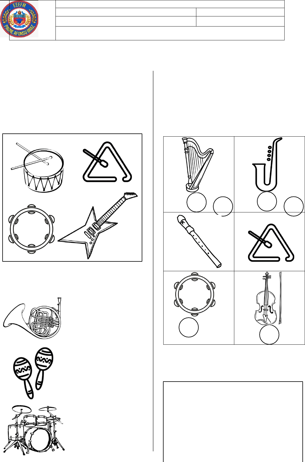 <p>Escola: E E E F M “PADRE AFONSO BRAZ”</p><p>Disciplina: ARTE</p><p>Data: / / 2024</p><p>Professora: CLAUDENIZE G J DE MOURA</p><p>Turma: ano</p><p>Nome:</p><p>1. Os instrumentos de percussão englobam uma variedade de aparelhos, como baterias, tambores, pandeiros, triângulos, chocalhos, entre outros. Pinte o instrumento não faz parte da família de percussões.</p><p>2. Ligue os instrumentos musicais aos nomes corretos.</p><p>Chocalho</p><p>Bateria</p><p>Trompa</p><p>3.</p><p>Enumere os instrumentos musicais conforme sua classificação.</p><p>1. Sopro</p><p>2. Corda</p><p>3. Percussão</p><p>4. Desenhe abaixo um instrumento de percussão.</p><p>image6.jpeg</p><p>image7.jpeg</p><p>image8.jpeg</p><p>image9.jpeg</p><p>image10.png</p><p>image11.png</p><p>image12.png</p><p>image13.jpeg</p><p>image14.jpeg</p><p>image1.jpeg</p><p>image2.jpeg</p><p>image3.jpeg</p><p>image4.jpeg</p><p>image5.png</p>