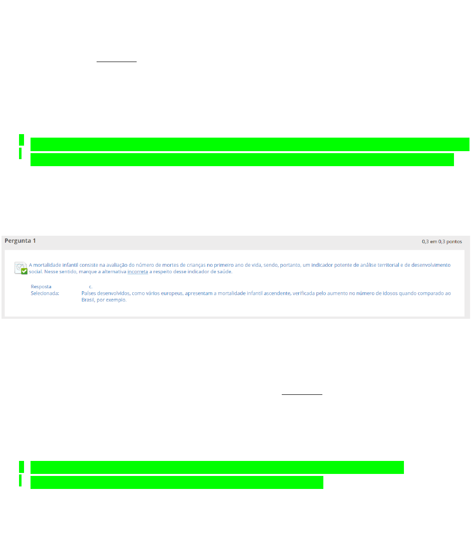 <p>POLÍTICA DE ATENÇÃO À SAÚDE DA CRIANÇA E DO ADOLESCENTE</p><p>UNIDADE 1</p><p>PERGUNTA 1</p><p>A mortalidade infantil consiste na avaliação do número de mortes de crianças no primeiro ano de vida,</p><p>sendo, portanto, um indicador potente de análise territorial e de desenvolvimento social. Nesse sentido,</p><p>marque a alternativa incorreta a respeito desse indicador de saúde.</p><p>a</p><p>.</p><p>Países desenvolvidos tendem a apresentar os melhores resultados do indicador de mortalidade</p><p>infantil.</p><p>b</p><p>.</p><p>Países em desenvolvimento tendem a apresentar taxas de mortalidade infantil maiores.</p><p>c</p><p>.</p><p>Países desenvolvidos, como vários europeus, apresentam a mortalidade infantil ascendente,</p><p>verificada pelo aumento no número de idosos quando comparado ao Brasil, por exemplo.</p><p>d</p><p>.</p><p>O território de nascimento de uma criança influencia diretamente nas taxas de mortalidade infantil.</p><p>e</p><p>.</p><p>O continente africano apresenta diversos países com a taxa de mortalidade infantil alarmante,</p><p>demonstrando as escassas condições sociais e econômicas desses territórios.</p><p>PERGUNTA 2</p><p>Atualmente o Brasil possui cerca de 60,5 milhões de crianças e adolescentes (de 0 a 19 anos), que estão</p><p>concentrados demograficamente na região Sudeste do País, chegando ao total de 18,6 milhões. As</p><p>regiões Norte e Nordeste superam o número de crianças e adolescentes quando comparadas às outras</p><p>regiões do país. A partir dessa afirmação, assinale a alternativa incorreta.</p><p>a</p><p>.</p><p>O crescimento e desenvolvimento nas regiões Norte e Nordeste brasileiras é bastante desafiador,</p><p>principalmente relacionado aos indicadores sociais.</p><p>b</p><p>.</p><p>A região Sudeste apresenta desafios como a violência e o trabalho infantil, que prejudicam o</p><p>crescimento e o desenvolvimento das crianças e adolescentes.</p><p>c</p><p>.</p><p>Quanto maior o desenvolvimento social local, maiores serão as dificuldades de</p><p>desenvolvimento enfrentadas pela população infanto-juvenil.</p><p>d</p><p>.</p><p>Nas áreas rurais as concentrações de crianças e adolescentes são inferiores às áreas urbanas.</p><p>e</p><p>.</p><p>Os dados estatísticos revelam aumento no número de crianças indígenas, ou seja, há uma</p><p>preocupação com a assistência adequada a estes povos de maneira equitativa.</p><p>PERGUNTA 3</p><p>A vulnerabilidade infantil demonstra situações que determinam socialmente o processo saúde-doença de</p><p>crianças e jovens em fase de desenvolvimento. Muitas vezes, os serviços de saúde não conseguem</p><p>responder adequadamente às necessidades dessa população. A partir desse cenário, analise as</p><p>assertivas e assinale a resposta correta.</p><p>I. O desenvolvimento infantil está intimamente ligado à interação entre a aprendizagem e a maturação,</p><p>aos níveis físico, social, emocional e intelectual.</p><p>II. Podemos entender a vulnerabilidade como sendo uma maior exposição dos indivíduos a problemas</p><p>relacionados com a ausência do suprimento de algumas necessidades básicas, como segurança, contexto</p><p>familiar, alimentação saudável.</p><p>III. Crianças indígenas possuem maior vulnerabilidade se comparadas àquelas que vivem na zona urbana,</p><p>onde os índices regionais de mortalidade infantil também são maiores.</p><p>IV. A vulnerabilidade infantil está atrelada às condições raciais, sociais, econômicas e educacionais,</p><p>contudo, essas condições não expõem os indivíduos ao adoecimento, pois a presença de agentes</p><p>etiológicos como vírus, bactérias, protozoários e fungos é essencial para o aumento da mortalidade</p><p>infantil.</p><p>a.</p><p>Todas as afirmativas estão corretas.</p><p>b.</p><p>Apenas as afirmativas I e II estão corretas.</p><p>c.</p><p>As afirmativas II, III e IV estão corretas.</p><p>d.</p><p>A afirmativa IV é a única incorreta.</p><p>e.</p><p>As afirmativas I e IV estão incorretas.</p><p>PERGUNTA 4</p><p>A alta taxa de homicídios de adolescentes no Brasil traduz as condições sociais vulneráveis em que</p><p>nossas crianças e adolescentes se encontram. Segundo a UNICEF (2014), em 2014, a cada dia, 30 crianças</p><p>e adolescentes foram assassinados. As vítimas têm cor, classe social e endereço. São em sua maioria</p><p>meninos negros, pobres, que vivem nas periferias e áreas metropolitanas das grandes cidades. Diante</p><p>essa informação, analise as assertivas a seguir e assinale a alternativa correta.</p><p>Estes apontamentos não deixam dúvida do abismo social existente no Brasil e como nossas crianças e</p><p>adolescentes são amplamente atingidos por estes aspectos (sociais, econômicos, raciais, entre outros).</p><p>PORQUE</p><p>As políticas sociais e de saúde necessitam trabalhar os aspectos de vulnerabilidade de forma</p><p>intersetorial, abrangendo o levantamento das necessidades de acordo com a realidade de cada região</p><p>brasileira.</p><p>a.</p><p>As duas assertivas são verdadeiras, mas a segunda não justifica a primeira.</p><p>b.</p><p>As duas assertivas são verdadeiras, sendo que a segunda justifica a primeira.</p><p>c.</p><p>A primeira assertiva é falsa e, portanto, não é justificada pela segunda.</p><p>d.</p><p>As duas assertivas são faltas, pois não detalham a questão da marginalidade</p><p>infantil.</p><p>e.</p><p>A primeira assertiva é verdadeira e a segunda é falsa.</p><p>PERGUNTA 5 ERRADA</p><p>Analisando o gráfico a seguir a respeito da proporção de óbitos em crianças de 0 a 5 anos de idade por</p><p>doença diarreica aguda segundo as Grandes Regiões brasileiras, entre 1991 a 2011, assinale a alternativa</p><p>INCORRETA.</p><p>a</p><p>.</p><p>Observa-se que em 20 anos este indicador diminuiu consideravelmente, passando de 9,3% dos</p><p>óbitos de crianças menores de 5 anos, em 1991, para 1,6% em 2011.</