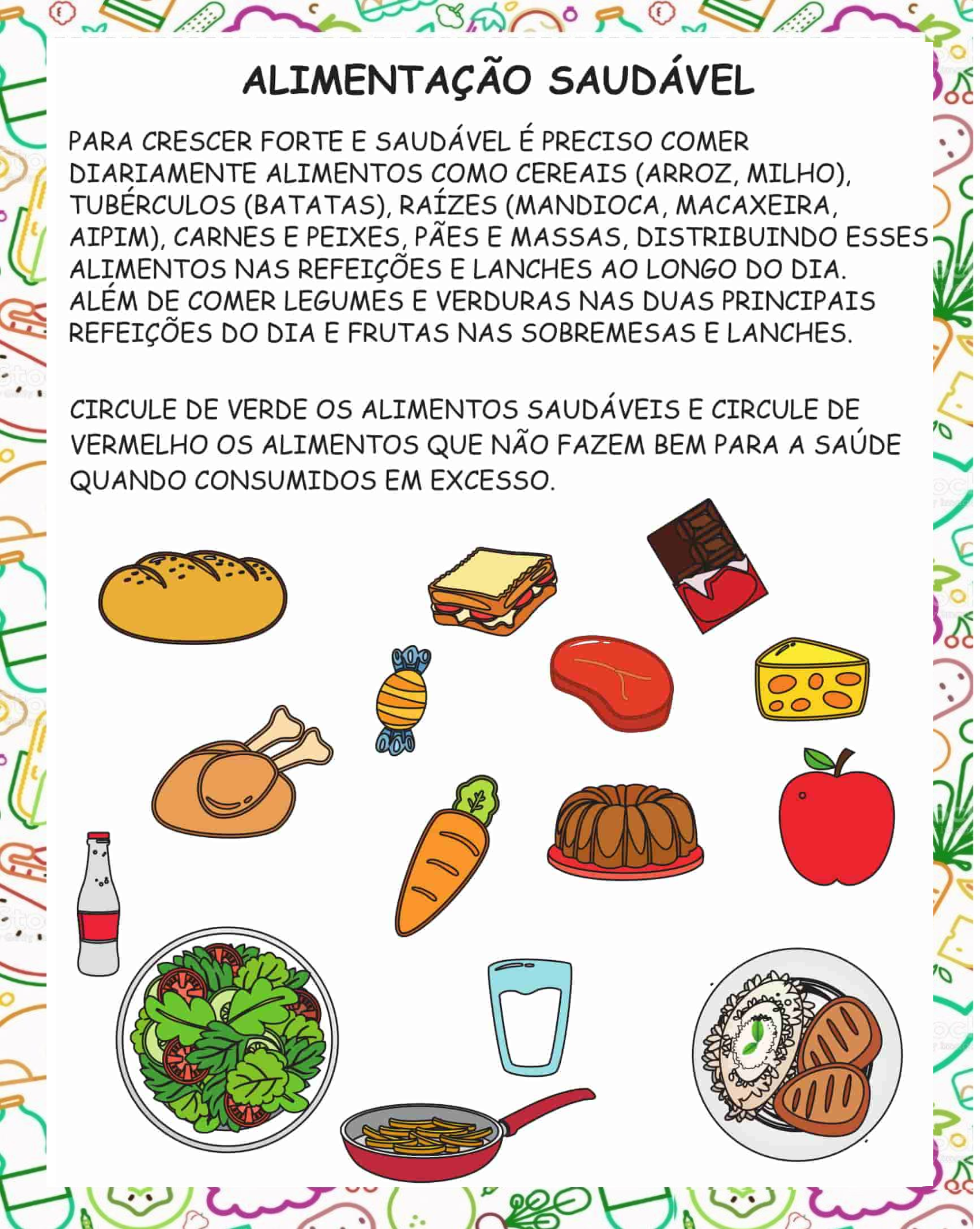 <p>ALIMENTAÇÃO SAUDÁVEL PARA CRESCER FORTE E SAUDÁVEL É PRECISO COMER DIARIAMENTE ALIMENTOS COMO CEREAIS (ARROZ, MILHO), TUBERCULOS (BATATAS), RAIZES (MANDIOCA, MACAXEIRA, AIPIM), CARNES E PEIXES, E MASSAS, DISTRIBUINDO ESSES ALIMENTOS NAS REFEIÇÕES E LANCHES AO LONGO DO DIA. ALEM DE COMER LEGUMES E VERDURAS NAS DUAS PRINCIPAIS REFEIÇÕES DO DIA E FRUTAS NAS SOBREMESAS E LANCHES. CIRCULE DE VERDE os ALIMENTOS SAUDÁVEIS E CIRCULE DE VERMELHO os ALIMENTOS QUE NÃO FAZEM BEM PARA A SAÚDE QUANDO CONSUMIDOS EM EXCESSO.</p>