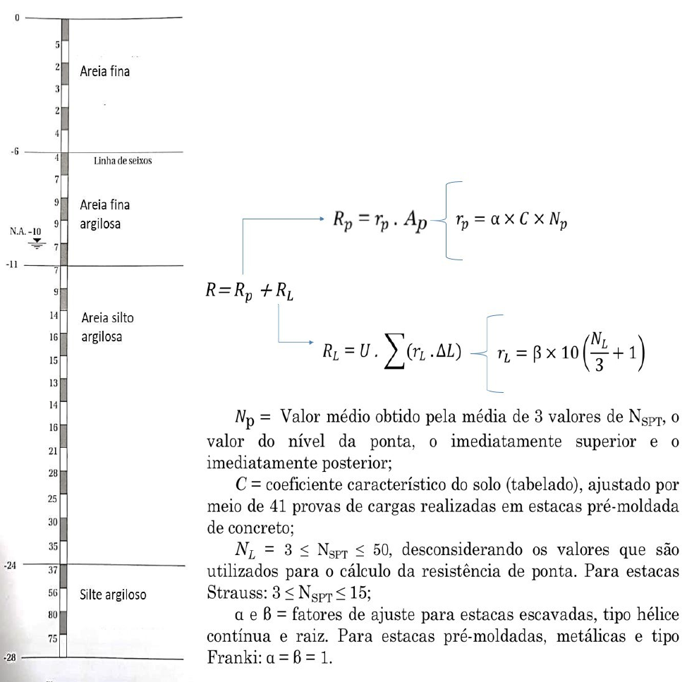 <p>CENTRO DE ENSINO SUPER</p><p>IOR DO AMAPÁ</p><p>DEPARTAMENTO DE ENGENH</p><p>ARIA CIVIL</p><p>CENTRO DE ENSINO SUPER</p><p>IOR DO AMAPÁ</p><p>DEPARTAMENTO DE ENGENH</p><p>ARIA CIVIL</p><p>Nega brix</p><p>e = Q² . p . h/ 5P (Q+p)²</p><p>onde:</p><p>e = nega em centimetro;</p><p>Q = peso do martelo em tonelada;</p><p>p = peso da estaca, em tonelada;</p><p>h = altura de queda em centímetro;</p><p>P = carga de trabalho da estaca, em tonelada;</p><p>Unidade 07 - Capacidade de Carga Geotécnica de Estacas em Solos - Exercício Prático - Método de Décourt & Quaresma</p><p>Considerando estacas pré</p><p>-</p><p>moldadas de concreto com</p><p>diâmetro de 33</p><p>c</p><p>m, carga de catálogo de</p><p>750</p><p>kN e</p><p>comprimento de 12 m, cravadas em local cuj</p><p>a so</p><p>ndagem</p><p>com N</p><p>SPT</p><p>é representada pela figura, com a ponta à cota</p><p>-</p><p>24</p><p>m, fazer a previsão de capacidade de carga dessa fundação</p><p>utilizando o método de</p><p>Décourt & Q</p><p>uaresma</p><p>.</p><p>Roteiro de resolução:</p><p>Sabemos que para calcular a capacidade geotécnica de uma estaca precisamos calcular em duas etapas, a resistência de ponta e a resistênica lateral.</p><p>1) Resistência de ponta, Rp:</p><p>Precisamos verificar o tipo de estaca, que neste caso é uma estaca pré-moldada de concreto, portanto uma estca cravada. Precisamos também avaliar o solo abaixo da estaca, onde sua ponta está apoiada. A estaca está apoiada a 24 metros de profundidade, sobre uma camada de ‘Silte argiloso’. O valor de α para estaca cravada em solo argiloso é 1,0 e o valor de ‘C’, para um solo silto argiloso, é de 200 kN/m2.</p><p>rP = α.C.NP</p><p>NP = (35 + 37 + 56))/3 NP = 42,66</p><p>rP = 1,0 . 200 kN/m2. 42,66 rP = 8532 kN/m2</p><p>AP = π.r2 AP = (π.d2)/4 AP = (π.0,332)/4 AP = 0,0855 m2</p><p>RP = rP . AP RP = 8532 kN/m2. 0,0855 m2 RP = 729,49 kN</p><p>2) Resistência lateral, RL:</p><p>Para o cálculo da resistência lateral precisamos avaliar o tipo de estaca e as camadas de solo a estaca está atravessando e suas propriedade β (1,0) e NL. E para o cálculo da resutante lateral ainda multiplicamos o valo de rL pelo perímetro ‘U’ (π.D) e pela espessura das camadas, ΔL.</p><p>Neste caso como temos uma estaca cravada e os valores de β são os mesmos para qualquer tipo de solo vamos considerar apenas uma camada de solo do topo do terreno até a ponta da estaca.</p><p>NL = (5+2+3+2+4+4+7+9+9+7+7+9+14+16+15+13+14+16+21+28+25+30)/22 NL = 11,81</p><p>Neste caso não há a necessidade de utilização de tabela para os cálculos.</p><p>rL = β . 10 . [(NL/3)+ 1]</p><p>rL = 1,0 . 10 . [(11,81/3)+ 1] rL = 49,37 kN/m2</p><p>U = π.D U = π . 0,33m U = 1,037 m</p><p>RL = (1,037 m) . 49,37 kN/m2 . 22 m RL = 1126.33 kN</p><p>3) Resistência total:</p><p>R = (RP/4,0) + (RL/1.3) R = (729,49 kN/4,0) + (1126.33 kN/1.3) R = 1048,78 kN</p><p>Se comparmos com a capacidade de carga estrutural vemos que esta é bem inferior, 750 kN, logo não poderíamos utilizar toda a capacidade de carga geotécnica desta estaca senão ela romperia, dependendo da carga do pilar em questão, que não é fornecida, poderia se pensar em diminuir a profundidade de e aumentar o diâmetro, ou realizar um estaqueamento.</p><p>Questões extras:</p><p>1) Caso resolvamos colocar a estaca a partir da cota – 1m, o que mudaria?</p><p>Caso a estaca inicie na conta -1 m e termine na conta -24 m teremos uma mudança apenas na área lateral, que passará de ΔL = 22,0 m para ΔL = 21,0 m.</p><p>2) Caso fixemos o tamanho da estaca a ser cravada em 24 m, mas consideremos a cota de partida da estaca em -1m, o que mudaria?</p><p>Caso a estaca na conta -1 m e tenha o tamanho fixo de 24 m além das observações levantadas na questão anterior, precisaríamos considerar que a ponta da estaca agora estaria na cota -25m, mudando o valor do NSPT médio da ponta. Neste caso os valores de resistência de ponta e lateral iriam mudar.</p><p>Nossa Missão é: “Educar com excelência, para transformar pessoas comprometidas com a sustentabilidade, a cultura amazônica e a qualidade de vida.”.</p><p>Nossa Missão é: “Educar com excelência, para transformar pessoas comprometidas com a sustentabilidade, a cultura amazônica e a qualidade de vida.”.</p><p>image4.jpeg</p><p>image5.jpeg</p><p>image6.jpeg</p><p>image7.png</p><p>image8.jpg</p><p>image9.png</p><p>image10.png</p><p>image11.jpg</p><p>image12.png</p><p>image1.jpg</p><p>image2.jpg</p><p>image3.jpg</p><p>image13.png</p><p>image14.png</p>