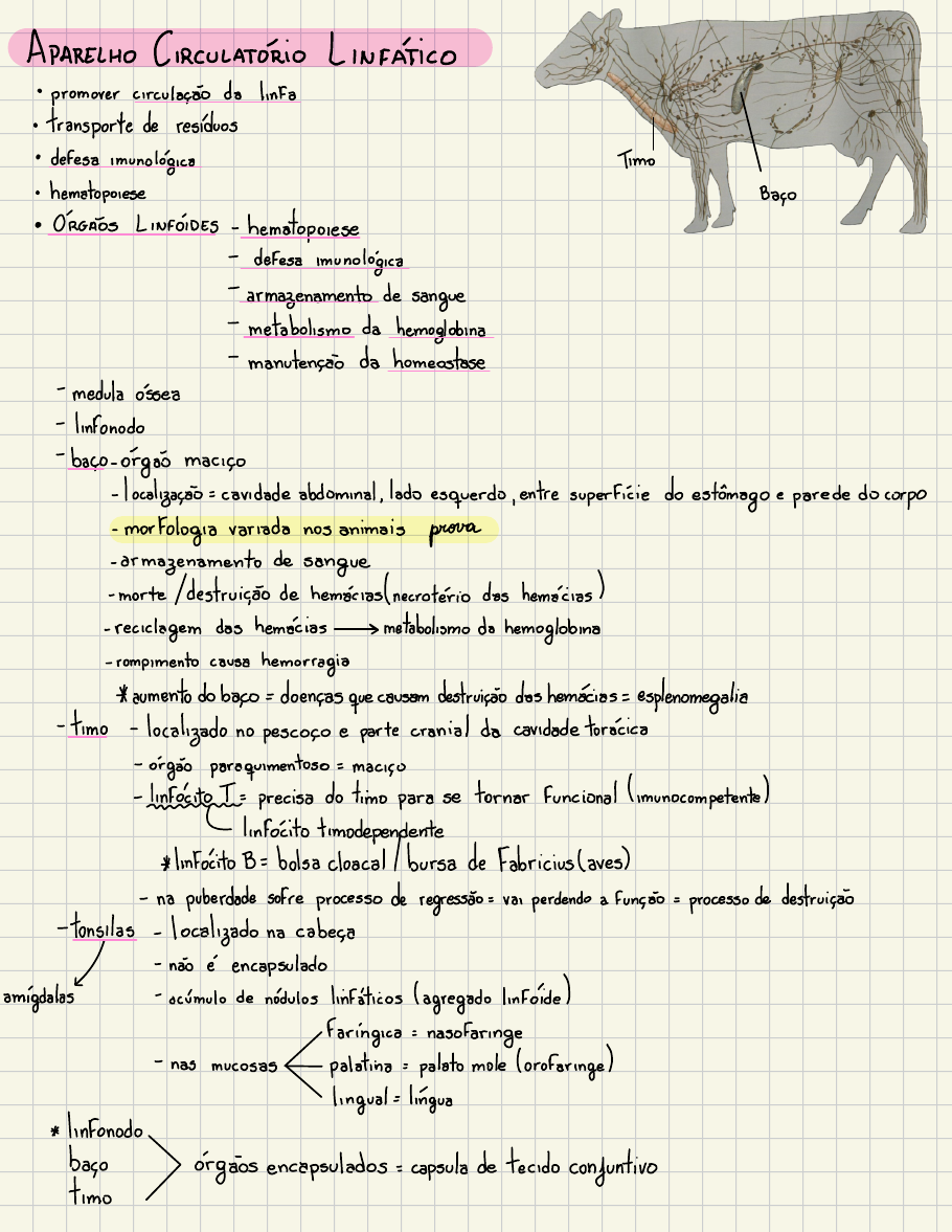 <p>Aparelho Circulatório Linfático</p><p>·</p><p>promover circulação da linfa</p><p>· transporte de resíduos</p><p>· defesa imunológica Timo</p><p>· hematopoiese Baço</p><p>· Órgãos Linfodes - hematopoiese</p><p>- defesa imunológica</p><p>-</p><p>armazenamento de sangue</p><p>- metabolismo da hemoglobina</p><p>- manutenção da homeostase</p><p>- medula óssea</p><p>- linfonodo</p><p>-</p><p>baço-órgão maciço</p><p>- localização = cavidade abdominal , lado esquerdo, entre superfície do estômago e parede do corpo</p><p>- morfologia variada nos animais prova</p><p>- armazenamento de sangue</p><p>- morte/destruição de hemácias/ necrotério das hemácias</p><p>- reciclagem das hemácias metabolismo da hemoglobina</p><p>- rompimento causa hemorragia</p><p>* aumento do baço= doenças que carsam destruição das hemácias = esplenomegalia</p><p>- timo - localizado no pescoço e parte cranial da cavidade torácica</p><p>- órgão paraquimentoso = maciço</p><p>-matoT= precisa do timo para se tornar Funcional limunocompetente)</p><p>linfócito timodependente</p><p>* linfócito B = bolsa cloacal/bursa de Fabriciuslaves)</p><p>- na puberdade sofre processo de regressão = vai perdendo a Função = processo</p><p>de destruição</p><p>- tonsilas</p><p>- localizado na cabeça</p><p>- não é encapsulado</p><p>amigdalas - acúmulo de nódulos linfáticos (agregado /infoide)</p><p>Faringica = nasofaringe</p><p>-</p><p>nas mucosas palatina= palato mole Corofaringe</p><p>lingual = Língua</p><p>* linfonodo</p><p>baço órgãos encapsulados = capsula de tecido conjuntivo</p><p>timo</p><p>· Linfonodo</p><p>vaso eferente</p><p>-</p><p>órgão paraquimentoso = maciço</p><p>Vaso</p><p>-</p><p>processo inflamatório = percebido na apalpação pois há aumento de tamanho</p><p>aferente - células de defesa</p><p>- localizado de Forma generalizada pelo corpo</p><p>- não possuem formato definida = nodular ou achatado</p><p>- tamanho é variado</p><p>· Vasos LINFÁTICOS</p><p>- capilares linfáticos permeabilidade dos capilares sanguíneos permeabilidade</p><p>recolhe a linfa dos tecidos dos órgãos</p><p>início da circulação linfática se da pelos capilares&</p><p>estrutura em Fundo</p><p>cego = rua sem saída as substâncias entram no vaso por</p><p>permeabilidade vascular = transporte</p><p>passivo</p><p>microorganismos</p><p>(bactérias)</p><p>conseguem ser absorvidas pelo capilar</p><p>capilares linfáticos</p><p>vasos linfáticos maiores</p><p>-</p><p>vasos linfáticos maiores = união de capilares</p><p>possui estrutura semelhante as veia sanguínea</p><p>linfonodo regional vaso linfático maior veia jugular externa</p><p>linfa é recolhida dos tecidos</p><p>e levada a corrente sanguínea</p><p>LINFA</p><p>líquido intersticial líquido que fica entre as células</p><p>(LEC) Had + nutriente do sangue</p><p>resíduo da célula também vão pra esse líquido</p><p>m</p><p>peso molecular = absorvidos pela corrente sanguínea</p><p>peso molecular = corrente sanguínea não consegue absorver</p><p>elevada pressão osmótica</p><p>aos linfonodos lipídios</p><p>líquido intersticial em excesso vai pro vaso linfático</p><p>regionassentimo</p><p>edema/retenção de líquido consegue absorver moléculas</p><p>maiores e até bactérias</p><p>linfonodo-formado por células de defesa</p><p>-corrente linfática leva infa</p><p>quando infectada ativa células</p><p>de defesa = há aumento dos linfonodos</p><p>(presença de processo</p><p>inflamatório</p>