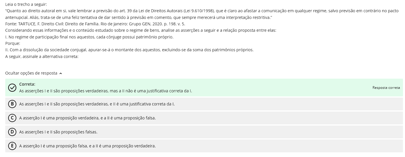 <p>Lela trecno a seguir: "Quanto ao direito autoral em si, vale lembrar a previsão do art. 39 da Lei de Direitos Autorais (Lei 9.610/1998), que é claro ao afastar a comunicação em qualquer salvo previsão em contrário no pacto Aliás, trata-se de uma feliz tentativa de dar sentido à previsão em comento, que sempre merecerá uma interpretação restritiva." Fonte: F. Direito Civil: Direito de Família. Rio de Janeiro: Grupo GEN, 2020. p. 198. V. 5. Considerando essas informações e conteúdo estudado sobre o regime de bens, analise as asserções a seguir e a relação proposta entre elas: I. No regime de participação final nos aquestos, cada cônjuge possui patrimônio próprio Porque: II. Com a dissolução da sociedade apurar-se-á montante dos aquestos, excluindo-se da soma dos patrimônios próprios. A seguir, assinale a alternativa correta: Ocultar opções de resposta Correta: Resposta correta As asserções I e II são proposições verdadeiras, mas a II não é uma justificativa correta da I. B As asserções I e II são proposições verdadeiras, e II é uma justificativa correta da I. C A asserção I é uma proposição verdadeira, e a II é uma proposição falsa. D As asserções I e são proposições falsas. E A asserção I é uma proposição falsa, e a II é uma proposição verdadeira.</p>
