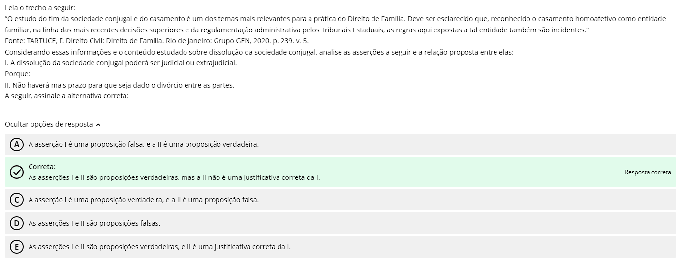 <p>"O estudo do fim da sociedade conjugal e do casamento é um dos temas mais relevantes para a prática do Direito de Família. Deve ser esclarecido que, reconhecido casamento homoafetivo como entidade na linha das mais recentes decisões superiores e da regulamentação administrativa pelos Tribunais Estaduais, as regras aqui expostas a tal entidade também são incidentes." Fonte: F. Direito Civil: Direito de Família. Rio de Grupo GEN, 2020. p. 239. 5. Considerando essas informações e conteúdo estudado sobre dissolução da sociedade analise as asserções a seguir e a relação proposta entre elas: I. A dissolução da sociedade conjugal poderá ser judicial ou extrajudicial. Porque: II. Não haverá mais prazo para que seja dado o divórcio entre as partes. A seguir, assinale a alternativa correta: Ocultar opções de resposta A A asserção I é uma proposição falsa, e a é uma proposição verdadeira. Correta: Resposta correta As asserções e II são proposições verdadeiras, mas a II não é uma justificativa correta da I. C A asserção I é uma proposição e a II é uma proposição falsa. D As asserções I e são proposições falsas. E As asserções I e II são proposições verdadeiras, e II é uma justificativa correta da I.</p>