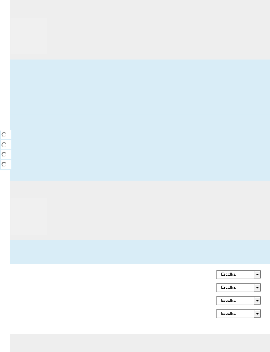 <p>Pergunta 1</p><p>Resposta pendente</p><p>Nota: 1,00</p><p>Marcar pergunta</p><p>Texto da pergunta</p><p>Que tipo de recurso linguístico utiliza o professor que participa na sequência de ensino e de aprendizagem</p><p>seguinte, para facilitar a construção conjunta do conhecimento? Selecione a resposta correta.</p><p>Professor: De acordo, é a gravidade que puxa para baixo. O que é que faz que volte a subir pelo outro</p><p>lado?</p><p>Aluno: a linha… faz subir a linha… ao baixar</p><p>Professor: aumenta a velocidade ao baixar… e é a… energia, a força que acumula que a faz subir pelo</p><p>outro lado.</p><p>Selecione uma opção de resposta:</p><p>a. Recapitulação.</p><p>b. Paráfrase.</p><p>c. Implicações.</p><p>d. Exemplificação.</p><p>Remover a resposta assinalada.</p><p>Pergunta 2</p><p>Resposta pendente</p><p>Nota: 1,00</p><p>Marcar pergunta</p><p>Texto da pergunta</p><p>Que demandas cognitivas costumam ser apresentadas nas seguintes tarefas de avaliação? Relacione cada</p><p>tarefa com as demandas correspondentes.</p><p>Apresentações públicas apoiadas com imagens (Pôster, Slides,</p><p>etc.). Resposta 1</p><p>…</p><p>Pasta ou Portefólio de aprendizagem. Resposta 2</p><p>…</p><p>Observação da prática (Diários ou outros registros</p><p>sistemáticos). Resposta 3</p><p>…</p><p>Estudo de caso.</p><p>Resposta 4</p><p>…</p><p>Remover a resposta</p><p>assinalada.</p><p>Pergunta 3</p><p>Resposta pendente</p><p>Nota: 1,00</p><p>Marcar pergunta</p><p>Texto da pergunta</p><p>Que tipo de estratégias considera que se trabalham principalmente na atividade seguinte? Selecione a</p><p>resposta correta.</p><p>Antes de ler</p><p>____ Ativar conhecimentos prévios.</p><p>____ Gerar previsões sobre o conteúdo do texto.</p><p>____ Extrair vocabulário.</p><p>____ Elaborar perguntas.</p><p>Selecione uma opção de resposta:</p><p>a. Estratégias metacognitivas.</p><p>b. Estratégias cognitivas.</p><p>c. Estratégias afetivo-motivacionais.</p><p>d. Estratégias de apoio ao processo instrucional.</p><p>Remover a resposta assinalada.</p><p>Pergunta 4</p><p>Resposta pendente</p><p>Nota: 1,00</p><p>Marcar pergunta</p><p>Texto da pergunta</p><p>Assinale quais das seguintes afirmações se relacionam com a avaliação autêntica.</p><p>É uma experiência de aprendizagem transferível.</p><p>Resposta 1</p><p>…</p><p>Desafio cognitivo significativo para o estudante.</p><p>Resposta 2</p><p>…</p><p>O docente decide o que e como avaliar.</p><p>Resposta 3</p><p>…</p><p>As tarefas de avaliação autêntica devem derivar do currículo.</p><p>Resposta 4</p><p>…</p><p>A resposta ao exercício de avaliação não se concebe como</p><p>independente do conteúdo ao qual faz referência.</p><p>Resposta 5</p><p>…</p><p>Contém demandas executivas de complexidade crescente.</p><p>Resposta 6</p><p>…</p><p>Refletir sobre o que se conhece é mais importante que a</p><p>demonstração do conhecimento em questão.</p><p>Resposta 7</p><p>…</p><p>Permite tomar decisões e supõe manter um diálogo “negociador”.</p><p>Resposta 8</p><p>…</p><p>A avaliação das respostas é responsabilidade exclusiva do docente.</p><p>Resposta 9</p><p>…</p><p>Exige o trabalho conjunto e a comunicação com o entorno social.</p><p>Resposta 10</p><p>…</p><p>Remover a resposta</p><p>assinalada.</p><p>Pergunta 5</p><p>Resposta pendente</p><p>Nota: 1,00</p><p>Marcar pergunta</p><p>Texto da pergunta</p><p>Relacione cada proposição com a resposta correta.</p><p>Revisar sistematicamente o que se escreve, comparando o</p><p>texto com o que poderia requerer o leitor potencial.</p><p>Resposta 1</p><p>…</p><p>Recuperar na memória o que se sabe sobre um tema e</p><p>expressá-lo no papel.</p><p>Resposta 2</p><p>…</p><p>Ter em conta a perspectiva e o contexto do destinatário.</p><p>Resposta 3</p><p>…</p><p>Antecipar as expectativas dos destinatários.</p><p>Resposta 4</p><p>…</p><p>Atender às potencialidades informativas do potencial leitor.</p><p>Resposta 5</p><p>…</p><p>Centrar-se em seu próprio ponto de vista.</p><p>Resposta 6</p><p>…</p><p>Modificar através da escrita o que previamente se sabe</p><p>sobre um tema.</p><p>Resposta 7</p><p>…</p><p>Problematizar o escrito da perspectiva de uma possível</p><p>audiência.</p><p>Resposta 8</p><p>…</p><p>Respeitar os limites do conhecimento disponível.</p><p>Resposta 9</p><p>…</p><p>Remover a resposta assinalada.</p><p>Pergunta 6</p><p>Resposta pendente</p><p>Nota: 1,00</p><p>Marcar pergunta</p><p>Texto da pergunta</p><p>Relacione um elemento da coluna da direita com outro da esquerda. Só há uma opção correta.</p><p>Explicit</p><p>ar o</p><p>ponto</p><p>de vista</p><p>próprio.</p><p>Resposta 1</p><p>…</p><p>Conver</p><p>sa</p><p>explorat</p><p>ória.</p><p>Resposta 2</p><p>…</p><p>Ajuste</p><p>das</p><p>ajudas.</p><p>Resposta 3</p><p>…</p><p>Constru</p><p>ção de</p><p>conheci</p><p>mentos</p><p>de</p><p>maneir</p><p>a</p><p>conjunt</p><p>a.</p><p>Resposta 4</p><p>…</p><p>Remover a resposta assinalada.</p><p>Pergunta 7</p><p>Resposta pendente</p><p>Nota: 1,00</p><p>Marcar pergunta</p><p>Texto da pergunta</p><p>Assinale quais dos seguintes aspectos correspondem ao marco teórico do enfoque estratégico da</p><p>aprendizagem.</p><p>A importância da metacognição.</p><p>Resposta 1</p><p>…</p><p>A influência dos conhecimentos específicos do domínio de</p><p>aprendizagem correspondente.</p><p>Resposta 2</p><p>…</p><p>A influência social dos cenários educativos na aprendizagem e no</p><p>uso das estratégias.</p><p>Resposta 3</p><p>…</p><p>Solução de problemas.</p><p>Resposta 4</p><p>…</p><p>O estudo das diferentes formas de processar a informação.</p><p>Resposta 5</p><p>…</p><p>A relevância do controle dos próprios processos cognitivos.</p><p>Resposta 6</p><p>…</p><p>Tomar decisões ajustadas às mudanças que se produzem durante a</p><p>solução das tarefas de aprendizagem.</p><p>Resposta 