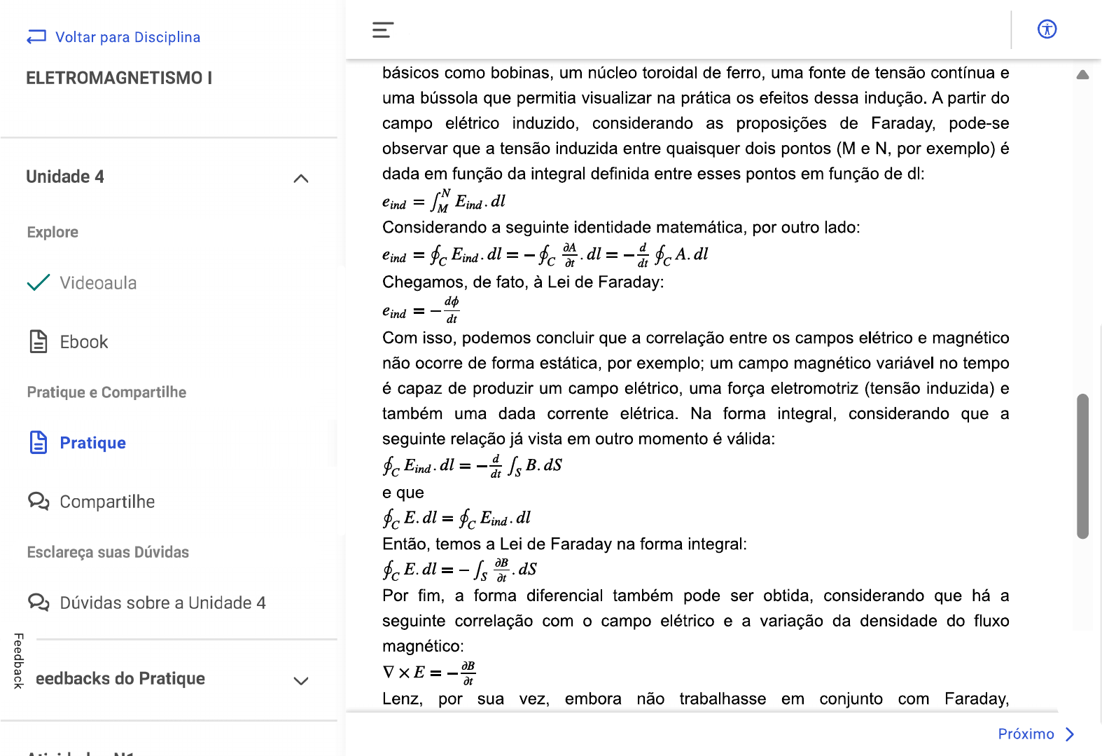 <p>Voltar para Disciplina ELETROMAGNETISMO I básicos como bobinas, um núcleo toroidal de ferro, uma fonte de tensão contínua e uma bússola que permitia visualizar na prática os efeitos dessa indução. A partir do campo elétrico induzido, considerando as proposições de Faraday, pode-se observar que a tensão induzida entre quaisquer dois pontos (M e N, por exemplo) é Unidade 4 dada em função da integral definida entre esses pontos em função de dl: = Explore Considerando a seguinte identidade matemática, por outro lado: at = d Videoaula Chegamos, de fato, à Lei de Faraday: do = dt Ebook Com isso, podemos concluir que a correlação entre os campos elétrico e magnético não ocorre de forma estática, por exemplo; um campo magnético variável no tempo Pratique e Compartilhe é capaz de produzir um campo elétrico, uma força eletromotriz (tensão induzida) e também uma dada corrente elétrica. Na forma integral, considerando que a Pratique seguinte relação já vista em outro momento é válida: Eind. dl = Compartilhe e que Esclareça suas Dúvidas Então, temos a Lei de Faraday na forma integral: Dúvidas sobre a Unidade 4 Por fim, a forma diferencial também pode ser obtida, considerando que há a seguinte correlação com o campo elétrico e a variação da densidade do fluxo magnético: eedbacks do Pratique OB at Lenz, por sua vez, embora não trabalhasse em conjunto com Faraday, Próximo ></p>