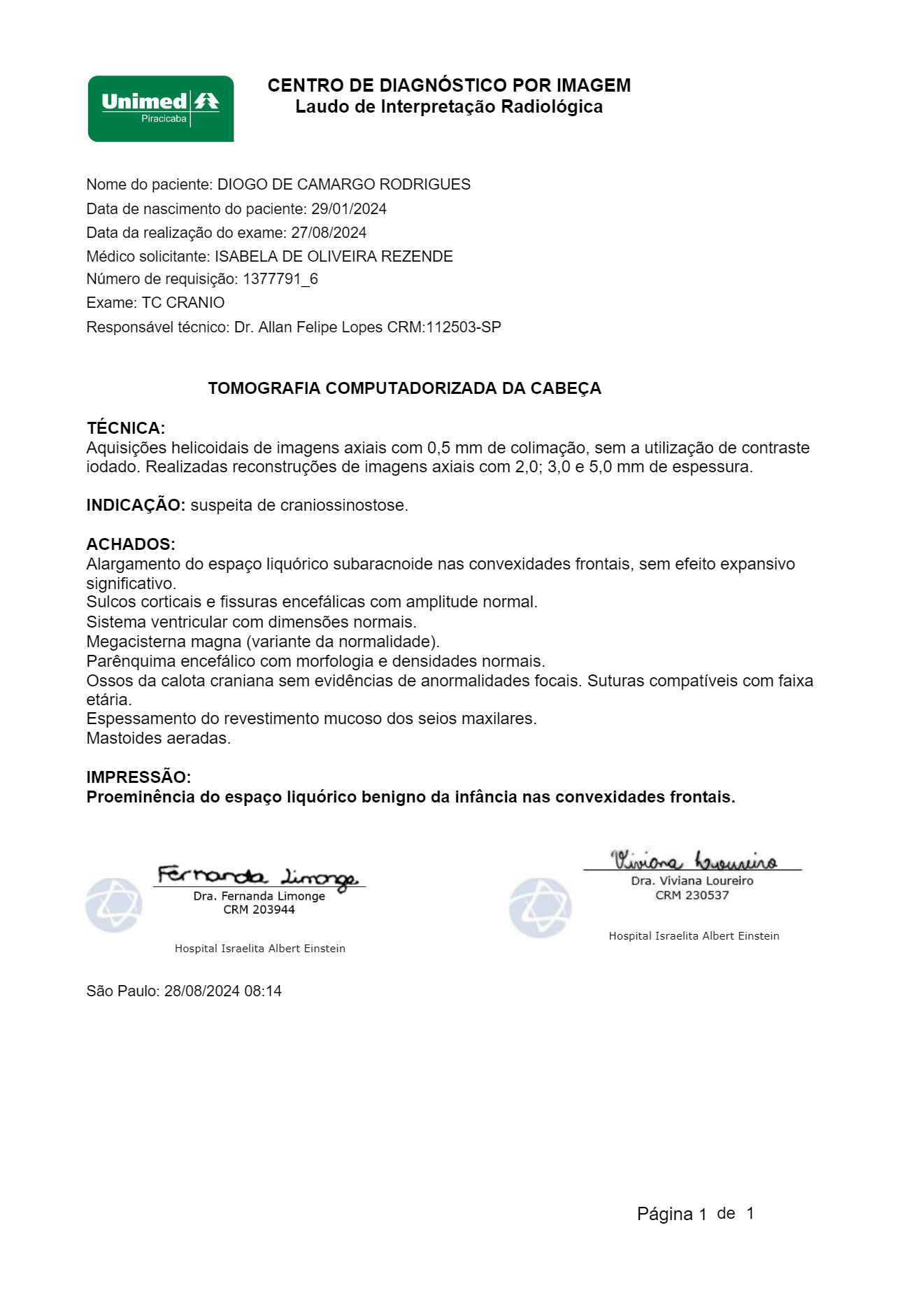 <p>CENTRO DE DIAGNÓSTICO POR IMAGEM Unimed Laudo de Interpretação Radiológica Piracicaba Nome do paciente: DIOGO DE CAMARGO RODRIGUES Data de nascimento do paciente: 29/01/2024 Data da realização do exame: 27/08/2024 Médico solicitante: ISABELA DE OLIVEIRA REZENDE Número de requisição: 1377791 6 Exame: TC CRANIO Responsável técnico: Dr. Allan Felipe Lopes CRM:112503-SP TOMOGRAFIA COMPUTADORIZADA DA CABEÇA TÉCNICA: Aquisições helicoidais de imagens axiais com 0,5 mm de colimação, sem a utilização de contraste iodado. Realizadas reconstruções de imagens axiais com 2,0; 3,0 e 5,0 mm de espessura. INDICAÇÃO: suspeita de craniossinostose. ACHADOS: Alargamento do espaço liquórico subaracnoide nas convexidades frontais, sem efeito expansivo significativo. Sulcos corticais e fissuras encefálicas com amplitude normal. Sistema ventricular com dimensões normais. Megacisterna magna (variante da normalidade). Parênquima encefálico com morfologia e densidades normais. Ossos da calota craniana sem evidências de anormalidades focais. Suturas compatíveis com faixa etária. Espessamento do revestimento mucoso dos maxilares. Mastoides aeradas. IMPRESSÃO: Proeminência do espaço liquórico benigno da infância nas convexidades frontais. Fernanda Dra. Viviana Loureiro Dra. Fernanda Limonge CRM 230537 CRM 203944 Hospital Israelita Albert Einstein Hospital Israelita Albert Einstein São Paulo: 28/08/2024 08:14 Página 1 de 1</p>