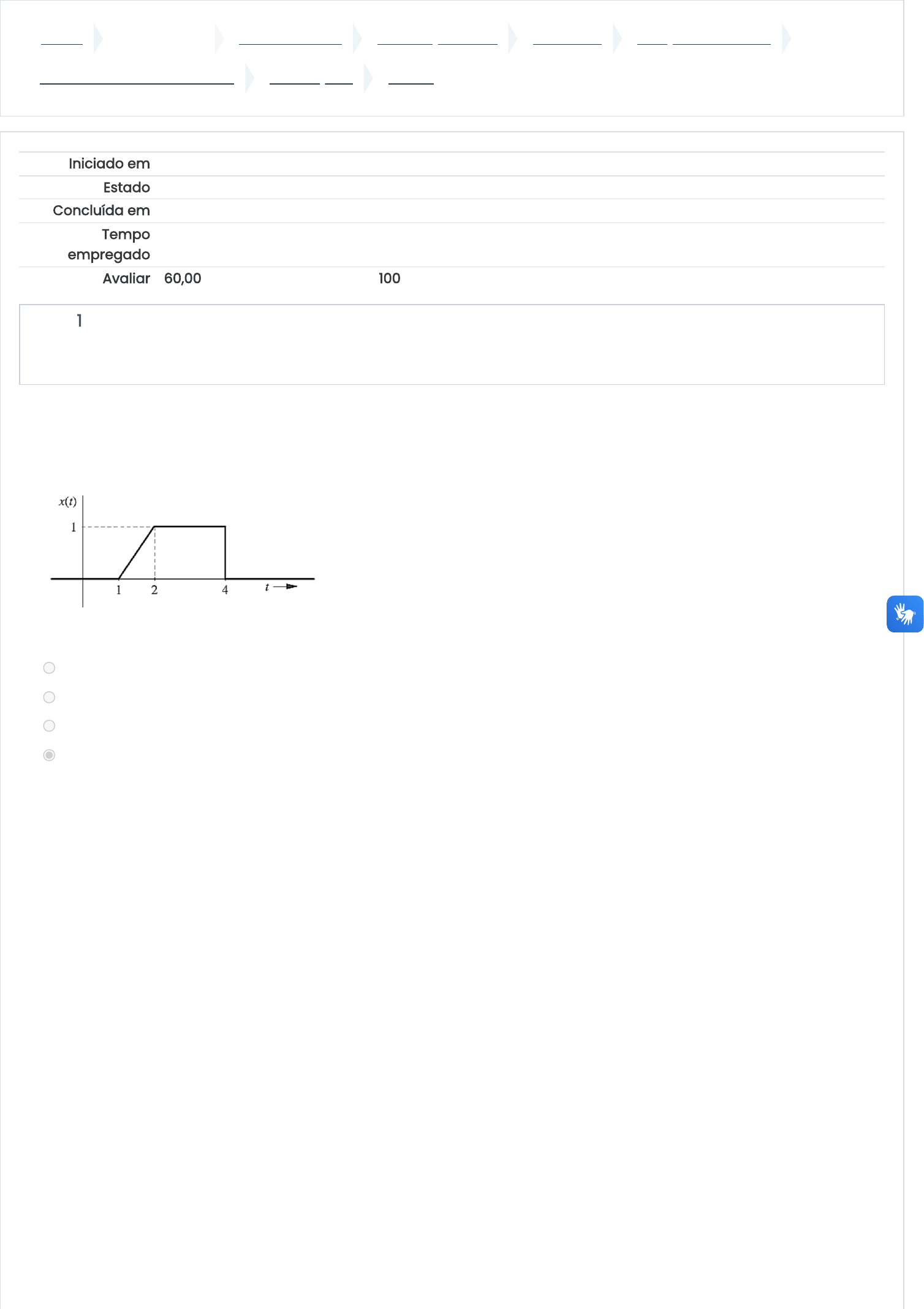 <p>Painel Meus cursos CURSOS FUNEC Graduação - EAD Aluno EAD JUNÇÕES DE TURMA</p><p>Análise de Sinais e Sistemas AVALIAÇÕES PROVA</p><p>Iniciado em Friday, 27 Sep 2024, 12:29</p><p>Estado Finalizada</p><p>Concluída em Friday, 27 Sep 2024, 13:01</p><p>Tempo</p><p>empregado</p><p>32 minutos 11 segundos</p><p>Avaliar 60,00 de um máximo de 60,00(100%)</p><p>Questão 1</p><p>Completo</p><p>Atingiu 3,00 de 3,00</p><p>A função degrau unitário pode ser utilizada para descrever funções matemáticas em diferentes segmentos de tempo</p><p>em uma única expressão válida para todo tempo. Dessa forma, o sinal x(t), representado na figura a seguir, pode ser</p><p>descrito pela função:</p><p>Escolha uma opção:</p><p>a. x(t)=(t-1)u(t-2)-(t-1)u(t-3)-u(t-4)</p><p>b. x(t)=(t-2)u(t-1)-(t-4)u(t-3)-u(t-4)</p><p>c. x(t)=(t-4)u(t-3)-(t-2)u(t-2)-u(t-4)</p><p>d. x(t)=(t-1)u(t-1)-(t-2)u(t-2)-u(t-4)</p><p>https://ava.funec.br/my/</p><p>https://ava.funec.br/course/index.php?categoryid=10</p><p>https://ava.funec.br/course/index.php?categoryid=17</p><p>https://ava.funec.br/course/index.php?categoryid=19</p><p>https://ava.funec.br/course/index.php?categoryid=77</p><p>https://ava.funec.br/course/view.php?id=2012</p><p>https://ava.funec.br/course/view.php?id=2012#section-6</p><p>https://ava.funec.br/mod/quiz/view.php?id=25154</p><p>Questão 2</p><p>Completo</p><p>Atingiu 3,00 de 3,00</p><p>Questão 3</p><p>Completo</p><p>Atingiu 3,00 de 3,00</p><p>A figura a seguir ilustra um sistema massa-mola-amortecedor:</p><p>O funcionamento do sistema mostrado é representado pela equação diferencial:</p><p>Considerando que no instante inicial a massa está parada a uma distância z da posição de repouso da mola, a</p><p>transformada de Laplace do sistema é:</p><p>Escolha uma opção:</p><p>a. Ms(sZ(s)-z )+C(sZ(s)-z )+K(sZ(s)-z )=0</p><p>b. Ms(sZ(s)-z )+C(sZ(s)-z )+KZ(s)=0</p><p>c. MsZ(s)+CsZ(s)+KZ(s)=0</p><p>d. Ms Z(s)+CsZ(s)+KZ(s)=0</p><p>M +C +Kz (t) = 0z(t)d2</p><p>dt2</p><p>dz(t)</p><p>dt</p><p>0</p><p>0 0 0</p><p>0 0</p><p>2</p><p>A figura a seguir mostra um sinal digital em tempo discreto:</p><p>O sinal mostrado na figura pode ser representado através da função de impulso δ[n] unitário  da seguinte forma:</p><p>Escolha uma opção:</p><p>a. Impulso unitário adiantado δ[n+5]</p><p>b. Impulso unitário adiantado δ[n-5]</p><p>c. Impulso unitário atrasado δ[n+5]</p><p>d. Impulso unitário atrasado δ[n-5]</p><p>Questão 4</p><p>Completo</p><p>Atingiu 3,00 de 3,00</p><p>Questão 5</p><p>Completo</p><p>Atingiu 3,00 de 3,00</p><p>Assinale a alternativa INCORRETA sobre sinais e sistemas:</p><p>Escolha uma opção:</p><p>a. Os sinais podem ser representados por funções de uma ou mais variáveis independentes.</p><p>b. Um sinal é um conjunto de dados ou informações sobre o comportamento ou natureza de algum fenômeno.</p><p>c. Um sistema é o conjunto de elementos que são capazes de processar ou modificar os sinais aplicados em sua</p><p>entrada, produzindo outros sinais na saída.</p><p>d. Um sistema instantâneo, também chamado de sistema com memória, é um sistema cuja saída independe do</p><p>tempo e de todo o histórico das entradas fornecidas.</p><p>Assinale a alternativa CORRETA sobre os sinais e sistemas:</p><p>Escolha uma opção:</p><p>a. Um sistema linear atende a propriedade da homogeneidade, enquanto um sistema não linear atende a</p><p>propriedade da aditividade.</p><p>b. Os sinais de tempo contínuo são também chamados de sinais analógicos.</p><p>c. Os sinais de tempo discreto são aqueles cuja amplitude pode assumir apenas um número finitos de valores,</p><p>como, por exemplo, o sistema binário.</p><p>d. Um sistema causal é aquele cujo valor de saída no instante presente depende apenas do valor presente e</p><p>passado das entradas.</p><p>Questão 6</p><p>Completo</p><p>Atingiu 3,00 de 3,00</p><p>Questão 7</p><p>Completo</p><p>Atingiu 3,00 de 3,00</p><p>No circuito representado na figura a seguir, a chave ideal tem estado aberta por um longo período de tempo, até que,</p><p>em t = 0 s, ela é fechada instantaneamente:</p><p>Assim, a transformada de Laplace da função da tensão V após o fechamento da chave é dada por:</p><p>Escolha uma opção:</p><p>a.</p><p>b.</p><p>c.</p><p>d.</p><p>o</p><p>8(S+1)</p><p>S²+S+1</p><p>8S+4)</p><p>S²+4S+1</p><p>8S+4)</p><p>S²+S+1</p><p>8(S+1)</p><p>S²+4S+1</p><p>Considere um sistema onde a modelagem matemática é dada pela equação diferencial:</p><p>Se y(t) representa o sinal de saída e  representa o sinal de entrada, considerando as condições iniciais nulas, marque a</p><p>opção que representa corretamente a função de transferência deste sistema:</p><p>Escolha uma opção:</p><p>a.</p><p>b.</p><p>c.</p><p>d.</p><p>30 + 10 + 4y(t) + 2 y(t)dt = 10u(t)d²y(t)</p><p>dt²</p><p>dy(t)</p><p>dt</p><p>∫ t</p><p>0</p><p>G(s) = 5</p><p>15s²+5s+2</p><p>G(s) = 10</p><p>30s³+10s²+4s+2</p><p>G(s) = 5s</p><p>15s³+5s²+2s+1</p><p>G(s) = 10s</p><p>30s²+10s+4</p><p>Questão 8</p><p>Completo</p><p>Atingiu 3,00 de 3,00</p><p>Questão 9</p><p>Completo</p><p>Atingiu 3,00 de 3,00</p><p>Em relação aos sinais que possuem unicamente a variável independente tempo, é CORRETO afirmar que:</p><p>Escolha uma opção:</p><p>a. Um sinal analógico não pode ser de tempo discreto.</p><p>b. Um sinal com energia finita possui potência nula.</p><p>c. Um sinal com potência finita possui energia nula.</p><p>d. Um sinal digital não pode ser de tempo contínuo.</p><p>Analise o circuito RL série, mostrado na figura a seguir, onde um sinal de tensão x(t) é aplicado ao circuito:</p><p>Marque a opção que contém a equação diferencial que representa corretamente o sistema, relacionando o sinal de</p><p>corrente y(t), com o sinal de entrada x(t):</p><p>Escolha uma opção:</p><p>a.</p><p>b.</p><p>c.</p><p>d.</p><p>+ 3y(t) =dy(t)</p><p>dt</p><p>dx(t)</p><p>dt</p><p>+ 3y(t) = x(t)dy(t)</p><p>dt</p><p>+ + 3y(t) = x(t)y(t)d2</p><p>dt2</p><p