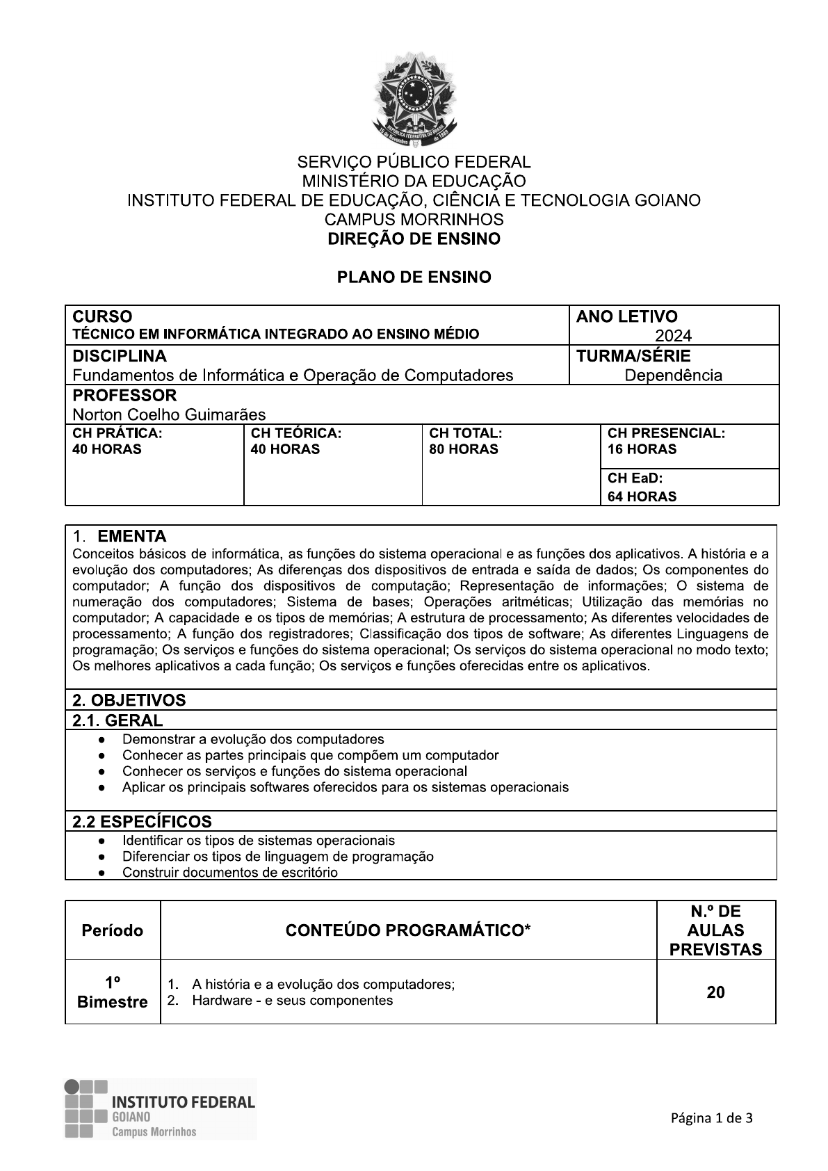 <p>SERVIÇO PÚBLICO FEDERAL MINISTÉRIO DA EDUCAÇÃO INSTITUTO FEDERAL DE EDUCAÇÃO, CIÊNCIA E TECNOLOGIA GOIANO CAMPUS MORRINHOS DIREÇÃO DE ENSINO PLANO DE ENSINO CURSO ANO LETIVO TÉCNICO EM INFORMÁTICA INTEGRADO AO ENSINO MÉDIO 2024 DISCIPLINA TURMA/SÉRIE Fundamentos de Informática e Operação de Computadores Dependência PROFESSOR Norton Coelho Guimarães CH PRÁTICA: CH TEÓRICA: CH TOTAL: CH PRESENCIAL: 40 HORAS 40 HORAS 80 HORAS 16 HORAS CH EaD: 64 HORAS 1. EMENTA Conceitos básicos de informática, as funções do sistema operacional e as funções dos aplicativos. A história e a evolução dos computadores; As diferenças dos dispositivos de entrada e saída de dados; Os componentes do computador; A função dos dispositivos de computação; Representação de informações; O sistema de numeração dos computadores; Sistema de bases; Operações aritméticas; Utilização das memórias no computador; A capacidade e os tipos de memórias; A estrutura de processamento; As diferentes velocidades de processamento; A função dos registradores; Classificação dos tipos de software; As diferentes Linguagens de programação; Os serviços e funções do sistema operacional; Os serviços do sistema operacional no modo texto; Os melhores aplicativos a cada função; Os serviços e funções oferecidas entre os aplicativos. 2. OBJETIVOS 2.1. GERAL Demonstrar a evolução dos computadores Conhecer as partes principais que compõem um computador Conhecer os serviços e funções do sistema operacional Aplicar os principais softwares oferecidos para os sistemas operacionais 2.2 ESPECÍFICOS Identificar os tipos de sistemas operacionais Diferenciar os tipos de linguagem de programação Construir documentos de escritório DE Período CONTEÚDO PROGRAMÁTICO* AULAS PREVISTAS 1° 1. A história e a evolução dos computadores; 20 Bimestre 2. Hardware e seus componentes INSTITUTO FEDERAL GOIANO Página 1 de 3 Campus Morrinhos</p><p>3. Representação de informações; 4. Operações aritméticas; 2° 5. Memórias no computador, capacidade e os tipos; 20 Bimestre 6. Processador e as diferentes velocidades; 7. Registradores e suas funções; 8. Tipos de software; 3° 9. Os paradigmas das linguagens de programação; 10. Sistema operacional e suas funções; 20 Bimestre 11. Modo texto; 4° 12. Aplicativos de mercado Bimestre 13. Aplicativos Web Google App e Office 365 20 *Esses conteúdos poderão ser modificados, considerando a necessidade de cada turma e/ou o andamento do ano letivo. 4. METODOLOGIA DE ENSINO 1. Ensino à distância, via ambiente virtual de aprendizagem (moodle), em concordância com Normas para oferta de Carga Horária Semipresencial em Cursos Presenciais do IF Goiano e Regulamento de Oferta de Carga Horária Semipresencial em Cursos Presenciais do IF Goiano Campus Morrinhos; 2. Aulas práticas em laboratórios de computadores; 3. Uso da Sala de Aula Invertida com apoio da plataforma AVA Moodle do IF Goiano. 5. CRONOGRAMA DE ATIVIDADES Conforme Calendário de Dependência 2024 6. MECANISMOS DE ATENDIMENTO INDIVIDUALIZADO AOS ESTUDANTES 1. Atendimento nos horários de ATEC, previamente agendado com o professor da disciplina 2. Chat e fórum no ambiente virtual de aprendizagem (Moodle) 7. FORMA, NÚMERO E CRITÉRIOS DE AVALIAÇÃO* 1° Bimestre: Avaliação bimestral 1 com questões objetivas = 30,0 pontos Trabalhos, avaliações mensais, atividade prática, relatórios = 70,0 pontos 100,0 pontos 2° Bimestre: Avaliação bimestral 2 com questões objetivas = 30,0 pontos Trabalhos, avaliações mensais, atividade prática, relatórios = 70,0 pontos 100,0 pontos 3° Bimestre: Avaliação bimestral 3 com questões objetivas e/ou subjetivas = 30,0 pontos Trabalhos, avaliações mensais, atividade prática, relatórios = 70,0 pontos 100,0 pontos 4° Bimestre: Avaliação bimestral 4 com questões objetivas = 30,0 pontos Trabalhos, avaliações mensais, atividade prática, relatórios = 70,0 pontos 100,0 pontos RECUPERAÇÃO FINAL: Avaliação objetiva 10,0 pontos (todo o conteúdo) Total: 100 pontos lançamento das avaliações no sistema acadêmico será realizado por meio da forma de "soma" para o cálculo da média do bimestre; Ao final do ano letivo, será feito uma "média aritmética" da soma de cada bimestre. *Essas avaliações poderão ser modificadas, considerando a necessidade de cada turma e/ou o andamento do ano letivo, desde que devidamente esclarecidas para a turma. INSTITUTO FEDERAL GOIANO Página 2 de 3 Campus Morrinhos</p><p>8. REFERÊNCIAS: 8.1. BÁSICA: CRUMLISH. Internet para Pessoas Ocupadas. São Paulo: Makron Books, 1997. Edison. Montagem, Manutenção e Configuração de Computadores Pessoais. São Paulo: Érica, 1997. MACHADO, Francis. Arquitetura de Sistemas Operacionais. Rio de Janeiro: LTC, 2002. MATTOS, Frank. Office 2000 Fundamental. São Paulo: Brasport, 2000. NASCIMENTO / HELLER. Introdução à Informática. São Paulo: Makron Books, 1990. NORTON, Peter. Introdução à Informática. São Paulo: Makron Books, 1997. 8.2. COMPLEMENTAR GONICK, L. Introdução Ilustrada à Computação. São Paulo: Harper do Brasil, 1984. NORTON, Peter. Desvendando Periféricos e Extensões. Rio de Janeiro: Campus, 1993. Galvin & GAGNE. Sistemas Operacionais: Conceitos e Aplicações. Rio de Janeiro: Campus, 2001 YOUNG, Michael. Microsoft Office 2000 Professional Guia Autorizado. São Paulo: Pearson Education, 2001. 8.3 SUGESTÃO ORSO, João Paulo Colet e RESENDE, Luiz. Informática de A a Z. Ucrânia, AlfaCon, Morrinhos (GO), 23 de Setembro de 2024. Norton Coelho Mestrado em Ciência da Computação Hiury Luiz dos Santos Coordenador do Curso Técnico em Informática INSTITUTO FEDERAL GOIANO Página 3 de 3 Campus Morrinhos</p>