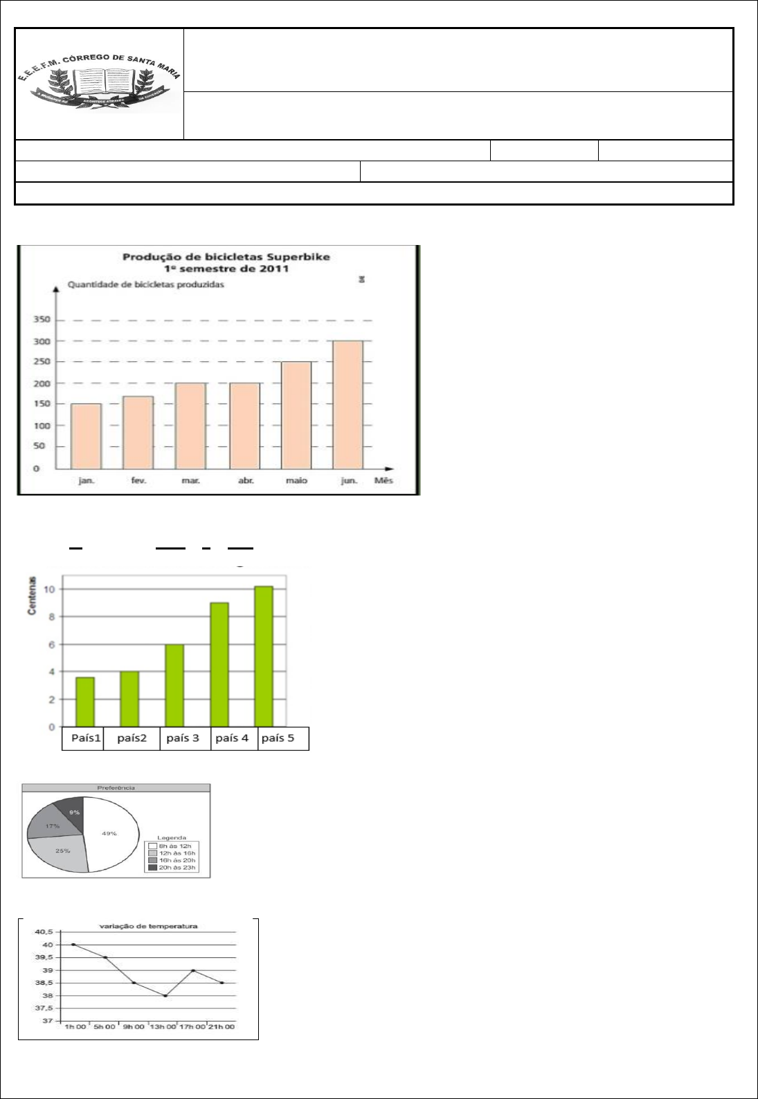 <p>QUESTÃO 01: Observe o gráfico abaixo e responda:</p><p>QUESTÃO 02: O gráfico abaixo representa a população de 5 países fictícios. A escala foi a centena, ou</p><p>seja: O 2 equivale a 200, o 4 a 400 e assim por diante.</p><p>Analise atentamente este gráfico de colunas e responda as perguntas:</p><p>QUESTÃO 03: Que tipo de gráfico está sendo representado na figura abaixo?</p><p>QUESTÃO 04: Que tipo de gráfico está sendo representado na figura abaixo?</p><p>EEEFM “CÓRREGO DE SANTA MARIA”</p><p>Rua São Domingos, s/nº - Santa Maria – São Mateus – E.S. – CEP 29.947-510.</p><p>Verificação de Aprendizagem – 3º Trimestre</p><p>Geografia</p><p>Nome: Série: Turma:</p><p>Professora: Cida Data:</p><p>Conteúdo: Elaborar e interpretar gráficos</p><p>a) Qual é o país que possui a maior população?</p><p>b) Qual é o país que possui a menor população?</p><p>c) Qual é a população do país 3?</p><p>d) Qual é a população do país 2?</p><p>e) O país 1 possui 40 habitantes a menos do que o país 2.</p><p>Qual é a população do país um?</p><p>a) Qual é o título do gráfico?</p><p>b) Quantas bicicletas foram produzidas em</p><p>janeiro?</p><p>c) Em que mês a produção de bicicleta foi</p><p>maior?</p><p>d) Quantas bicicletas foram produzidas em</p><p>maio?</p><p>a) ( ) gráfico de colunas</p><p>b) ( ) gráfico de linha</p><p>c) ( ) gráfico de barras</p><p>d) ( ) gráfico de setores ou circulares</p><p>a) ( ) gráfico de colunas</p><p>b) ( ) gráfico de linha</p><p>c) ( ) gráfico de barras</p><p>d) ( ) gráfico de setores ou circulares</p><p>QUESTÃO 05: AGORA A SUA VEZ DE ELABORAR UM GRÁFICO.</p><p>Siga as instruções.</p><p>1- Construa seu gráfico no espaço abaixo.</p><p>2- O tema do gráfico é a população urbana por regiões brasileiras em 2010. Ele será também o título do</p><p>gráfico e a fonte do gráfico é do IBGE.</p><p>3- No eixo vertical será representada a população em milhões de habitantes.</p><p>4- No eixo horizontal cada uma das cinco regiões brasileiras (Centro-Oeste, Nordeste, Norte, Sudeste e</p><p>Sul)</p><p>5- Dados que devem ser representados.</p><p>a) Após construir o gráfico, identifique em qual região se concentram a maior parte das populações</p><p>urbanas no Brasil?</p><p>QUESTÃO 06: Responda:</p><p>a) Cite 02 exemplos de tipos de gráficos.</p><p>b) Cite os principais elementos de um gráfico.</p><p>QUESTÃO 07: Agora, com base na tabela a seguir, elabore um gráfico de setor, utilizando o círculo das</p><p>porcentagens ao lado.</p>