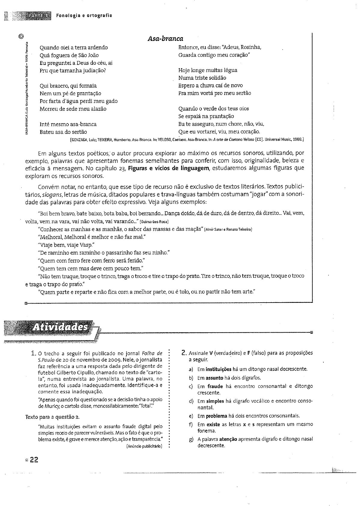 <p>PARTE 1 Fonologia e ortografia Asa-branca Quando oiei a terra ardendo Entonce, eu disse: "Adeus, Rosinha, Quá foguera de São João Guarda contigo meu coração" Eu preguntei a Deus do céu, ai Pru que tamanha judiação? Hoje longe muitas légua Numa triste solidão Qui brazero, qui fornaia Espero a chuva caí de novo Nem um pé de prantação Pra mim vortá pro meu sertão Por farta d'água perdi meu gado Morreu de sede meu alazão Quando verde dos teus oios Se na prantação Inté mesmo asa-branca Eu te asseguro, num chore, não, viu, Bateu asa do sertão Que eu vortarei, viu, meu coração. (GONZAGA, Luiz; TEIXEIRA, VELOSO, Caetano. In: A arte de Caetano Veloso Universal Music, 1988.) Em alguns textos poéticos, o autor procura explorar ao máximo os recursos sonoros, utilizando, por exemplo, palavras que apresentam fonemas semelhantes para conferir, com isso, originalidade, beleza e eficácia à mensagem. No capítulo 23, Figuras e vícios de linguagem, estudaremos algumas figuras que exploram os recursos sonoros. Convém notar, no entanto, que esse tipo de recurso não é exclusivo de textos literários. Textos publici- tários, slogans, letras de música, ditados populares e trava-línguas também costumam "jogar" com a sonori- dade das palavras para obter efeito expressivo. Veja alguns exemplos: "Boi bem bravo, bate baixo, bota baba, boi Dança doido, dá de duro, dá de dentro, dá direito.. Vai, vem, volta, vem na vara, vai não volta, vai varando..." Rosa] "Conhecer as manhas e as manhãs, o sabor das massas e das maçãs" (Almir Sater e Renato "Melhoral, Melhoral é melhor e não faz mal." "Viaje bem, viaje Vasp." "De raminho em raminho o passarinho faz seu ninho." "Quem com ferro fere com ferro será ferido." "Quem tem cem mas deve cem pouco tem." "Não tem truque, troque o trinco, traga o troco e tire o trapo do prato. Tire o trinco, não tem truque, troque o troco e traga o trapo do prato." "Quem parte e reparte e não fica com a melhor parte, ou é tolo, ou no partir não tem arte." Atividades 1. trecho a seguir foi publicado no jornal Folha de 2. Assinale V (verdadeiro) e (falso) para as proposições S.Paulo de 20 de novembro de 2009. Nele, o jornalista a seguir. faz referência a uma resposta dada pelo dirigente de a) Em instituições há um ditongo nasal decrescente. futebol Gilberto Cipullo, chamado no texto de "carto- numa entrevista ao jornalista. Uma palavra, no b) Em assunto há dois dígrafos. entanto, foi usada inadequadamente. Identifique-a e c) Em fraude há encontro consonantali e ditongo comente essa inadequação. crescente. "Apenas quando foi questionado se a decisão tinha o apoio d) Em simples há dígrafo vocálico e encontro conso- de Muricy, cartola disse, nantal. Texto para a questão 2. e) Em problema há dois encontros consonantais. "Muitas instituições evitam o assunto fraude digital pelo f) Em existe as letras e S representam um mesmo fonema. simples receio de parecer vulneráveis. Mas o fato é que o pro- blema existe, é grave e merece atenção, ação e transparência." g) A palavra atenção apresenta e ditongo nasal (Anúncio publicitário) decrescente. 22</p><p>Capítulo 1 Fonologia 3. Leia em alta os pares de palavras apresentados a 9. Em qual alternativa todas as palavras apresentam dígra- seguir e indique aqueles em que a letra em destaque fos vocálicos? representa fonemas distintos. Lembre-se de que uma a) Antártica - grandioso - tempo científica mesma letra pode representar fonemas diferentes. b) tanto - primeira visitantes desembarque a) medo - mesa g) loja - moça c) intervalo - planeta - durante - apenas b) berra - gelo h) sala - casa d) gigantesca - permitido - missões - tempo c) terra - queda i) mesa - sapato e) - intervalo - tanto apenas d) cedo - belo j) roda barato 10. Leia em alta as palavras das alternativas deste exer- e) homem mole k) rato - caro cício e, a seguir, responda: em qual alternativa as letras f) modo - hora I) rápido - raposa em destaque representam um mesmo fonema? a) exagero - grandioso 4. Leia em alta as palavras das alternativas a seguir e d) países - superlativo indique em quais alternativas as letras em destaque b) superlativo - visitantes e) exploração exagero estão representado o mesmo c) décadas científicas a) sabão - asa h) portuguesa - certeza Texto para as questões de 11 a 14. b) exagero - correnteza i) marquês - altivez solitário solidário soli ário c) jeito - gente j) analisar - atualizar solitário solitário soli ário d) lousa magreza k) diversão - exceção solidário solitário soli ário e) enxame - texto I) efetue possui solidário solidário soli ário f) gaveta - geleia m) cenoura - secador (AZEREDO, Ronaldo. In: AZEVEDO FILHO, Leodegário Amarante de. g) máximo - maço n) fase - amizade Poetas do Modernismo: antologia Brasília: INL, 1972.) 5. Pronuncie em alta as palavras da relação a seguir e 11. As palavras solitário e solidário distinguem-se por um depois transcreva aquelas em que aparece dígrafo único Que nome ele recebe? consonantal SC. 12. Divida as de solidário e solitário. nascimento - descobrir - crescer - descida - acrescentar fresco crepúsculo - - piscina - discutir 13. Classifique encontro vocálico existente nessas palavras. Texto para as questões de 6 a 10. 14. Na palavra que nome recebe primeiro i? E segundo? "Tudo na Antártica parece exagero, grandioso e superlati- 15. No trecho a seguir, destaque os e classifi- Até há pouco tempo, ir até lá era um relato quase de que-os em átonos ou ficção científica. Tanto que a primeira leva de visitantes só teve desembarque permitido em 1960. Nesse intervalo, "Fazendo teatro a gente experimenta ser o que não é, e continente com 29 milhões de metros cúbicos de gelo tem ideia de como seria a vida se a gente fosse outra (90% do gelo e cerca de 65% das reservas de água potável pessoa, fazendo coisas diferentes das coisas que a gente do planeta) passou a receber, durante quatro décad