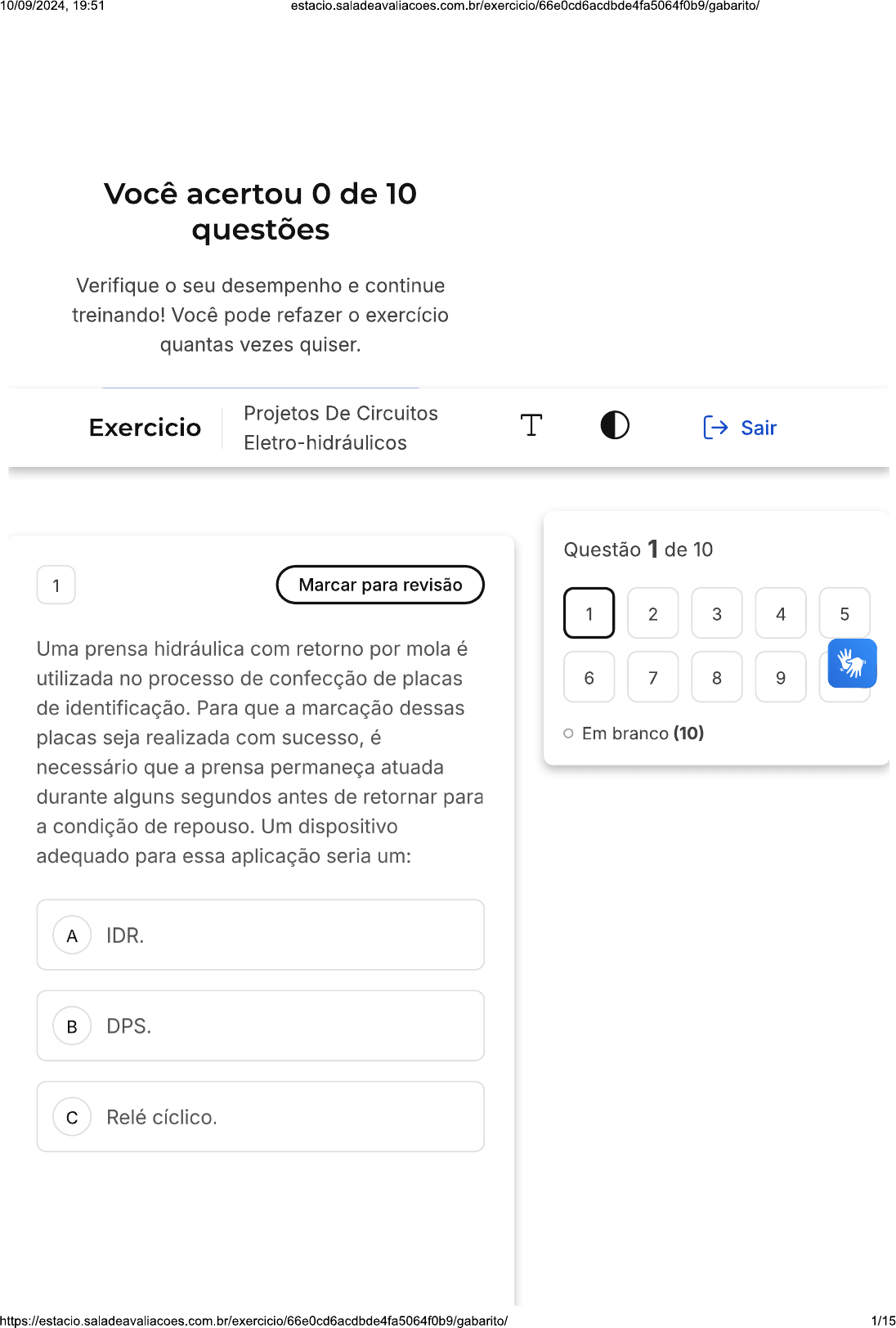 <p>10/09/2024, 19:51 Você acertou o de 10 questões Verifique o seu desempenho e continue treinando! Você pode refazer o exercício quantas vezes Projetos De Circuitos Exercicio T Sair Eletro-hidráulicos Questão 1 de 10 1 Marcar para revisão 1 2 3 4 5 Uma prensa hidráulica com retorno por mola é utilizada no processo de confecção de placas 6 7 8 9 de identificação. Para que a marcação dessas placas seja realizada com sucesso, é Em branco (10) necessário que a prensa permaneça atuada durante alguns segundos antes de retornar para a condição de repouso. Um dispositivo adequado para essa aplicação seria um: A IDR. B DPS. C Relé cíclico. 1/15</p><p>10/09/2024, 19:51 Relé de tempo com retardo na D desenergização. E Contador de pulsos. Questão não respondida i Opa! A alternativa correta é a letra D. Confira o gabarito comentado! Gabarito Comentado relé de tempo com retardo na desenergização é o dispositivo mais adequado para a situação descrita no enunciado. Isso ocorre porque a prensa hidráulica utilizada possui um retorno por mola, que faz com que ela retorne à sua condição de repouso quando a energização é interrompida. Portanto, um relé com retardo na desenergização permitiria que a prensa permanecesse atuada durante o tempo necessário para a marcação das placas de identificação, antes de retornar à condição de repouso. Esse relé proporciona um atraso controlado na desenergização, garantindo que a prensa permaneça atuada pelo tempo necessário para a realização do processo. 2 Marcar para revisão Se um sistema recebe uma potência útil igual a 10J/s, é possível afirmar que esse sistema recebeu uma potência equivalente, em HP, igual a: 2/15</p><p>10/09/2024, 19:51 A 10 B 1, 3 C 0,99 D 13, 3 E 0, 134x10-3 Questão não respondida i Opa! A alternativa correta é a letra D. Confira o gabarito comentado! Gabarito Comentado A questão envolve a conversão de unidades de potência. Sabemos que 1 Joule por segundo (J/s) é equivalente a Horse Power (HP). Portanto, se o sistema recebe uma potência de 10J/s, precisamos multiplicar esse valor pela equivalência em HP para encontrar a potência em HP. Assim, temos: 3 1 = 3 HP Portanto, a potência recebida pelo sistema, em HP, é de o que corresponde à alternativa D. 3/15</p><p>10/09/2024, 19:51 estacio.saladeavaliacoes.com.br/exercicio/66e0cd6acdbde4fa5064f0b9/gabarito/ 3 Marcar para revisão De acordo com o diagrama abaixo, caso o cilindro esteja avançado e o botão Ligar_1 não esteja pressionado, é possível afirmar que ao acionar o botão Ligar_2 : +24V 2 3 3 3 A B 0 E LIGAR 1 LIGAR 2 K1 / K2 4 4 T 1 3 S2 S1 1 4 2 4 A1 A1 S1 K1 K2 S2 A2 A2 OV A será possível recuar o cilindro B será possível avançar o cilindro C não será possível recuar o cilindro D não será possível avançar o cilindro o cilindro permanecerá avançando e E recuando indefinidamente i Questão não respondida 4/15</p><p>10/09/2024, 19:51 Opa! A alternativa correta é a letra C. Confira o gabarito comentado! Gabarito Comentado Gabarito: não será possível recuar o cilindro Justificativa: Como o contato auxiliar S1 é do tipo normalmente aberto, caso o botão Ligar_1 não esteja pressionado, o botão Ligar_2 não poderá acionar o solenóide K2 e promover o recuo do cilindro. 4 Marcar para revisão Observando o diagrama do circuito eletro- hidráulico da figura, é possível afirmar que: +24V 1 3 A B LIGAR_1 K1 4 P T K1 0V 5/15</p><p>10/09/2024, 19:51 o cilindro permanecerá recuado até A que o botão Ligar_ seja acionado. o cilindro permanecerá avançado até que o botão Ligar_1 seja acionado. o cilindro não pode avançar pois a C mola garante sua condição de recuo. o cilindro avançará com o D acionamento do botão Ligar_1 o cilindro não pode recuar pois a mola E garante sua condição de avanço. i Questão não respondida Opa! A alternativa correta é a letra B. Confira o gabarito comentado! Gabarito Comentado Gabarito: o cilindro permanecerá avançado até que o botão Ligar_1 seja acionado. Justificativa: a posição inicial do válvula eletro-hidráulica garante o avanço do cilindro que só conseguirá recuar quando o botão Lihar_1 for acionado. 5 Marcar para revisão Para proteger seu sistema eletro-hidráulico, uma empresa decidiu investir em dispositivos de proteção contra sobrecargas. Como a rede elétrica dessa empresa oscila muito, picos de corrente (variações instantâneas de corrente) 6/15</p><p>10/09/2024, 19:51 são comuns e os riscos de sobrecargas frequentes. Para proteger seu sistema eletro- hidráulico contra correntes excessivas um dispositivo de resposta rápida adequado para essa instalação seria um: A Disjuntor térmico B Disjuntor magnético C Relé térmico D IDR E Fusível i Questão não respondida Opa! A alternativa correta é a letra B. Confira o gabarito comentado! Gabarito Comentado O disjuntor magnético é a resposta correta. Este dispositivo é conhecido por sua capacidade de resposta rápida a picos de corrente, que são variações instantâneas de corrente. Isso é especialmente útil em situações onde a rede elétrica oscila muito, como no caso da empresa mencionada no enunciado. A atuação rápida do disjuntor magnético permite que ele proteja efetivamente o sistema eletro-hidráulico contra correntes excessivas, minimizando o risco de sobrecargas frequentes. 7/15</p><p>10/09/2024, 19:51 6 Marcar para revisão Ao acionar um cilindro eletro-hidráulico, é esperado que uma contagem seja iniciada (começando no 10 e finalizando no 0) para que o sistema efetivamente atue. Isso é importante para garantir que o operador consiga se afastar do maquinário e se posicionar de forma segura. Um dispositivo adequado para essa finalidade seria um: A contador progressivo. B fusível. C contato normalmente aberto. D relé magnético. E contador regressivo. i Questão não respondida Opa! A alternativa correta é a letra E. Confira o gabarito comentado! Gaba