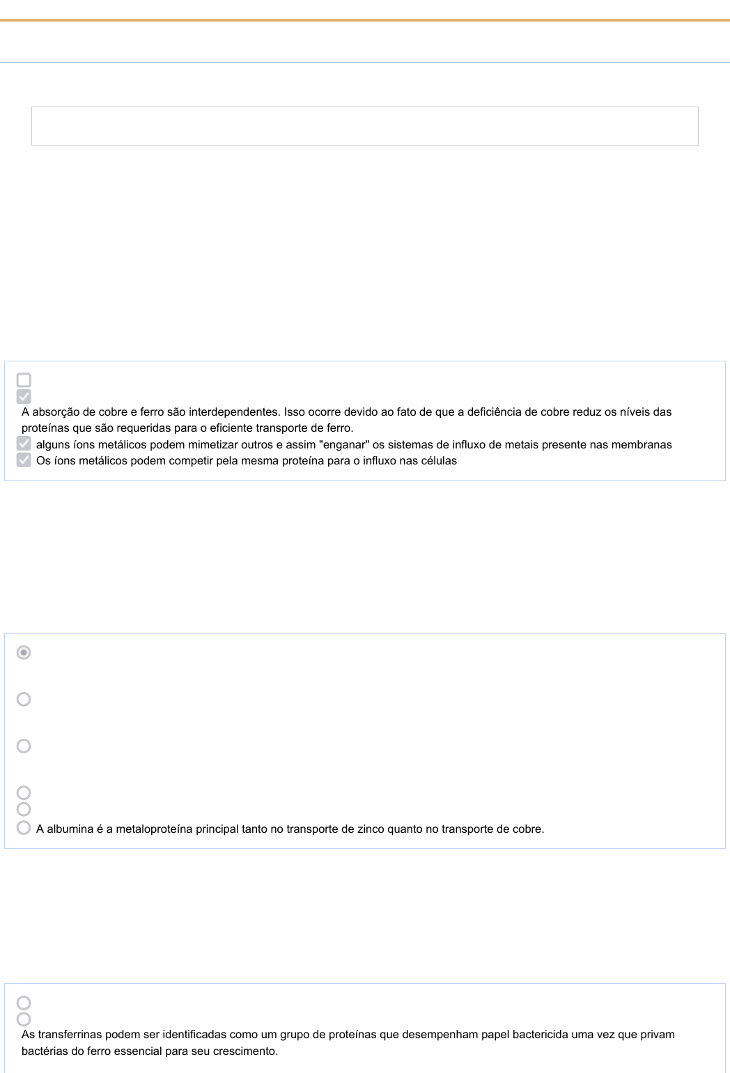 <p>Sistema Integrado de Gestão de Atividades AcadêmicasCEFET-MG - SIGAA -</p><p>Turma: PPGMQMG0011 - BIOINORGÂNICA (2022.2 - T01)</p><p>Questionário 1</p><p>Conteúdo Fe, Zn, Cu e transportadores de oxigênio</p><p>Acerto: 47%</p><p>Feedback geral:</p><p>Horário de Envio: 19/09/2022 às 13:48</p><p>Respostas enviadas</p><p>1. Alguns metais podem interferir na biodisponibilidade de outros. Marque a(s) assertativa(s) verdadeiras.</p><p>Porque a presença de um determinado metal no sistema biológico pode diminuir a solubilidade de outro.</p><p>A absorção de cobre e ferro são interdependentes. Isso ocorre devido ao fato de que a deficiência de cobre reduz os níveis das</p><p>proteínas que são requeridas para o eficiente transporte de ferro.</p><p>alguns íons metálicos podem mimetizar outros e assim "enganar" os sistemas de influxo de metais presente nas membranas</p><p>Os íons metálicos podem competir pela mesma proteína para o influxo nas células</p><p>2. Sobre as proteínas envolvidas no metabolismo de cobre e ferro, marque a alternativa FALSA:</p><p>Os níveis de cobre nas células são tão rigorosamente controlados que praticamente não existe cobre sem estar complexado. O</p><p>desequilíbrio nos níveis de cobre está associado a graves problemas de saúde, tais como as doenças de Menkes (deficiência de cobre)</p><p>e de Wilson (acumulação de cobre).</p><p>A metalotioneína é uma proteína rica em resíduo cisteína que contém o grupo tiolato que coordena-se bem ao Cu(I) e Zn(II), pois</p><p>ambos são considerados ácidos de fronteira e podem coordenar-se bem a bases macias.</p><p>A coordenação do Cu(I) à metalotioneína é mais efetiva que a do Zn(II), dado que o átomo tem mais características de ácido macio</p><p>que o zinco devido a carga menor.</p><p>A creuloplasmina é uma proteína essencial no metabolismo ferro, pois ela atua como uma enzima (ferroxidase) que catalisa a</p><p>oxidação do íon ferroso a férrico e assim permite seu transporte no plasma sanguíneo pela transferrina.</p><p>Embora a ceruplasmina seja uma proteína que complexa-se ao cobre, a deficiência dessa vitamina causa deficiência de ferro.</p><p>Uma metalotioneína pode quelar até sete átomos de zinco formando aglomerados metálicos do tipo Zn S e Zn S4 11 3 9</p><p>A albumina é a metaloproteína principal tanto no transporte de zinco quanto no transporte de cobre.</p><p>3. As transferrinas são proteínas encontradas no plasma sanguíneo (sorotransferrina), na clara de ovo (ovotransferrina) e no leite</p><p>(lactotransferrina). A respeito dessas proteínas marque a alternativa FALSA.</p><p>As transferrinas são um grupo de proteínas que possuem em comum a função de carrear íons ferro.</p><p>As transferrinas podem ser identificadas como um grupo de proteínas que desempenham papel bactericida uma vez que privam</p><p>bactérias do ferro essencial para seu crescimento.</p><p>SIGAA - Sistema Integrado de Gestão de Atividades Acadêmicas https://sig.cefetmg.br/sigaa/ava/QuestionarioTurma/visualizarTentati...</p><p>1 of 13 27/09/2022 19:39</p><p>Eduardo Amaral</p><p>Realce</p><p>Eduardo Amaral</p><p>Realce</p><p>Eduardo Amaral</p><p>Realce</p><p>Respostas enviadas</p><p>A lactoferrina (ou lactotransferrina) tem a função de nutrir o neonato com demanda de ferro.</p><p>A ovotransferrina tem função de transportar o ferro da clara para a gema.</p><p>4. Marque a(s) alternativa(s) VERDADEIRA(S)</p><p>É bem conhecido que o monóxido de carbono (CO) é um forte inibidor da ligação do dioxigênio (O2) com a mioglobina e a hemoglobina,</p><p>embora, relativamente ao dioxigênio, sua ligação seja muito mais fraca na proteína, quanto comparada com um simples complexo de Fe-</p><p>porfirina. Esta supressão da ligação com o CO é importante, pois, de outra forma, mesmo traços de CO poderiam causar sérias</p><p>consequências para os tecidos.</p><p>A ligação do CO é energeticamente favorecida em relação ao O2 por conta do efeito de retrodoação.</p><p>A ligação do CO na proteína é menos favorecida que no complexo livre devido a um resíduo de histidina que impedem a ligação do</p><p>CO ao Fe com um ângulo de 180º</p><p>O cianeto age no nosso organismo de forma similar ao CO</p><p>Assim como o O2, o CO e outros ligantes podem ligar-se à hemoglobina de forma reversível.</p><p>5. Indique a assertiva FALSA a respeito da homeostase do ferro nos seres humanos.</p><p>A ingestão diária de ferro é importante para reposição da perda férrea por descamação do epitélio (epiderme) e as outras</p><p>demandas de ferro são supridas pelo processo de reciclagem de ferro no organismo.</p><p>A absorção do ferro orgânico é mais fácil em relação ao ferro inorgânico, visto que o primeiro encontra-se no estado de oxidação</p><p>+3 possibilitando sua captação e internalização na membrana apical do enterócito (célula intestinal).</p><p>Uma vez que o ferro-heme é absorvido pelas células intestinais, há a necessidade da atuação da enzima hemoxigenase para</p><p>disponibilização do ferro.</p><p>A maior parte do ferro que usamos nos processos metabólicos essenciais são oriundos de eritrócitos (glóbulos vermelhos)</p><p>senescentes.</p><p>6. Com base no texto abaixo, a toxicidade do cádmio em sua forma iônica é consequência de esse elemento</p><p>Ca 197pm/ Ca2+ 100pm</p><p>Na 191pm/ Na+ 102pm</p><p>Cd 152pm/ Cd2+ 103pm</p><p>Al 143pm / Al3+ 53pm</p><p>Zn 137 pm/ Zn2+ 83pm</p><p>O cádmio, presente nas baterias, pode chegar ao solo quando esses materiais são descartados de maneira irregular no meio ambiente</p><p>ou quando são incinerados. Diferentemente da forma metálica, os íons Cd2+ são extremamente perigosos para o organismo, pois eles</p><p>podem substituir íons Ca2+, ocasionando uma doença degenerativa nos ossos, tornando-os muito porosos e causando dores intensas</p><p>nas articulações. Podem ainda inibir enzimas ativadas pelo cá