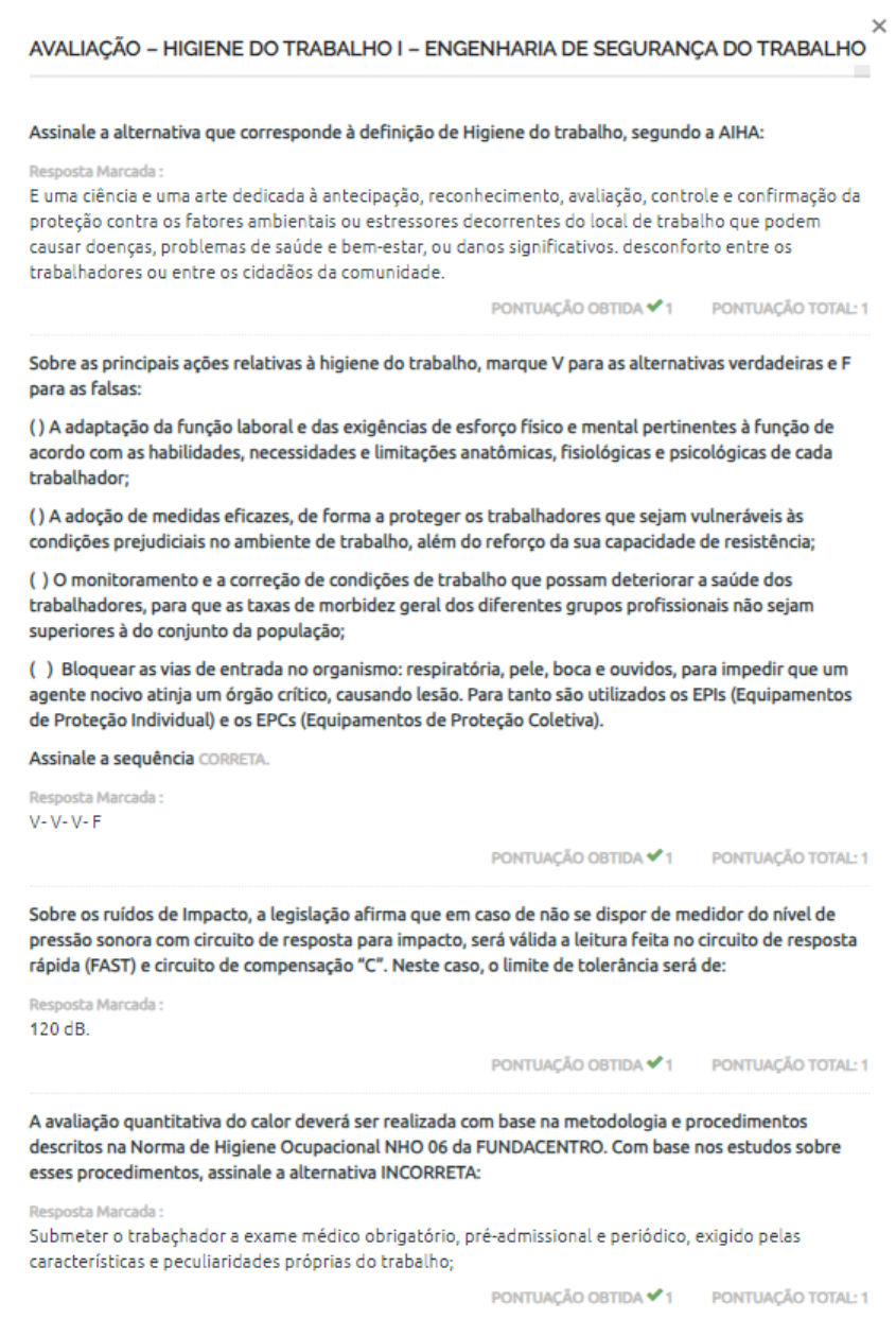 <p>AVALIAÇÃO HIGIENE DO TRABALHO ENGENHARIA DE SEGURANÇA DO TRABALHO Assinale a alternativa que corresponde à definição de Higiene do trabalho, segundo a AIHA: Resposta Marcada E uma ciência e uma arte dedicada à antecipação, reconhecimento, avaliação, controle e confirmação da proteção contra os fatores ambientais ou estressores decorrentes do local de trabalho que podem causar doenças, problemas de saúde e bem-estar, ou danos significativos. desconforto entre os trabalhadores ou entre os cidadãos da comunidade. PONTUAÇÃO OBTIDA 1 PONTUAÇÃO TOTAL: 1 Sobre as principais ações relativas à higiene do trabalho, marque para as alternativas verdadeiras e F para as falsas: () A adaptação da função laboral e das exigências de esforço físico e mental pertinentes à função de acordo com as habilidades, necessidades e limitações anatômicas, fisiológicas e psicológicas de cada trabalhador; () A adoção de medidas eficazes, de forma a proteger os trabalhadores que sejam vulneráveis às condições prejudiciais no ambiente de trabalho, além do reforço da sua capacidade de resistência; o monitoramento e a correção de condições de trabalho que possam deteriorar a saúde dos trabalhadores, para que as taxas de morbidez geral dos diferentes grupos profissionais não sejam superiores à do conjunto da população; ( ) Bloquear as vias de entrada no organismo: respiratória, pele, boca e ouvidos, para impedir que um agente nocivo atinja um órgão crítico, causando lesão. Para tanto são utilizados os EPIs (Equipamentos de Proteção Individual) e os EPCs (Equipamentos de Proteção Coletiva). Assinale a sequência Resposta Marcada V-V-V-F PONTUAÇÃO OBTIDA 1 PONTUAÇÃO TOTAL: 1 Sobre os ruídos de Impacto, a legislação afirma que em caso de não se dispor de medidor do nível de pressão sonora com circuito de resposta para impacto, será válida a leitura feita no circuito de resposta rápida (FAST) e circuito de compensação "C". Neste caso, o limite de tolerância será de: Resposta Marcada 120 dB. PONTUAÇÃO OBTIDA 1 PONTUAÇÃO TOTAL: 1 A avaliação quantitativa do calor deverá ser realizada com base na metodologia e procedimentos descritos na Norma de Higiene Ocupacional NHO 06 da FUNDACENTRO. Com base nos estudos sobre esses procedimentos, assinale a alternativa INCORRETA: Resposta Marcada Submeter o trabachador a exame médico obrigatório, pré-admissional e periódico, exigido pelas características e peculiaridades próprias do trabalho; PONTUAÇÃO OBTIDA 1 PONTUAÇÃO TOTAL: 1</p><p>Assinale a alternativa que expressa as principais alterações na saúde do trabalhador, em decorrência da exposição à radiação não ionizante: Resposta Marcada : Envelhecimento precoce e dermatites; PONTUAÇÃO OBTIDA 1 PONTUAÇÃO TOTAL: 1 Sobre o trabalho em condições hiperbáricas (Pressões anormais), assinale a alternativa CORRETA : Resposta Marcada : trabalhador deve ser submetido a exame médico obrigatório, pré-admissional e periódico, exigido pelas características e peculiaridades próprias do trabalho; PONTUAÇÃO OBTIDA PONTUAÇÃO 1 A higiene ocupacional tem como objetivo prevenir riscos e doenças ocupacionais. Isso é feito em quatro etapas. Sobre esse assunto, assinale a alternativa CORRETA : Resposta Marcada : Controle, Avaliação, Antecipação e Reconhecimento; PONTUAÇÃO OBTIDA 1 PONTUAÇÃO 1 Leia o texto abaixo: "[...] não é um organismo normativo, ou seja, não se pode dizer que as publicações dessa entidade sejam normas internacionais, pois não o são: suas publicações são referências técnicas, cuja observância pelos órgãos reguladores dos diversos países é facultativa, e não obrigatória. Entretanto, a importância e a qualidade de suas publicações são reconhecidas internacionalmente, sendo suas recomendações seguidas pela maioria das agências e órgãos reguladores internacionais. De acordo com o que foi lido, podemos dizer que o texto faz referência à organização: Resposta : ACGIH (American Conference of Governmental Industrial Hygienists); PONTUAÇÃO OBTIDA 1 PONTUAÇÃO TOTAL: 1 Analise as afirmações abaixo sobre a ABHO (Associação Brasileira de Higienistas Ocupacionais): - Foi constituída em 1994 para fins de estudos e ações relativas à higiene ocupacional e representação de interesses individuais ou coletivos dos higienistas. - Desempenhar trabalhos nas diversas áreas do conhecimento e da saúde em III - É objetivo da ABHO promover a formação, qualificação e aperfeiçoamento profissional. De acordo com a leitura das afirmações, podemos considerar que: Resposta : I e III estão corretas. PONTUAÇÃO OBTIDA 1 PONTUAÇÃO 1</p><p>A partir das recomendações da Organização Mundial de Saúde (OMS), podemos listar as principais ações relativas à higiene do trabalho. Assinale a alternativa CORRETA: Resposta Marcada : A aplicação de programas periódicos de ação sanitária para a consolidação de normas e cuidados relativos à saúde, de modo a contribuir na elevação do nível sanitário da coletividade. PONTUAÇÃO OBTIDA 1 PONTUAÇÃO TOTAL: 1 Total Número de retomadas : 3 de 10 REFAZER QUESTIONÁRIO</p>