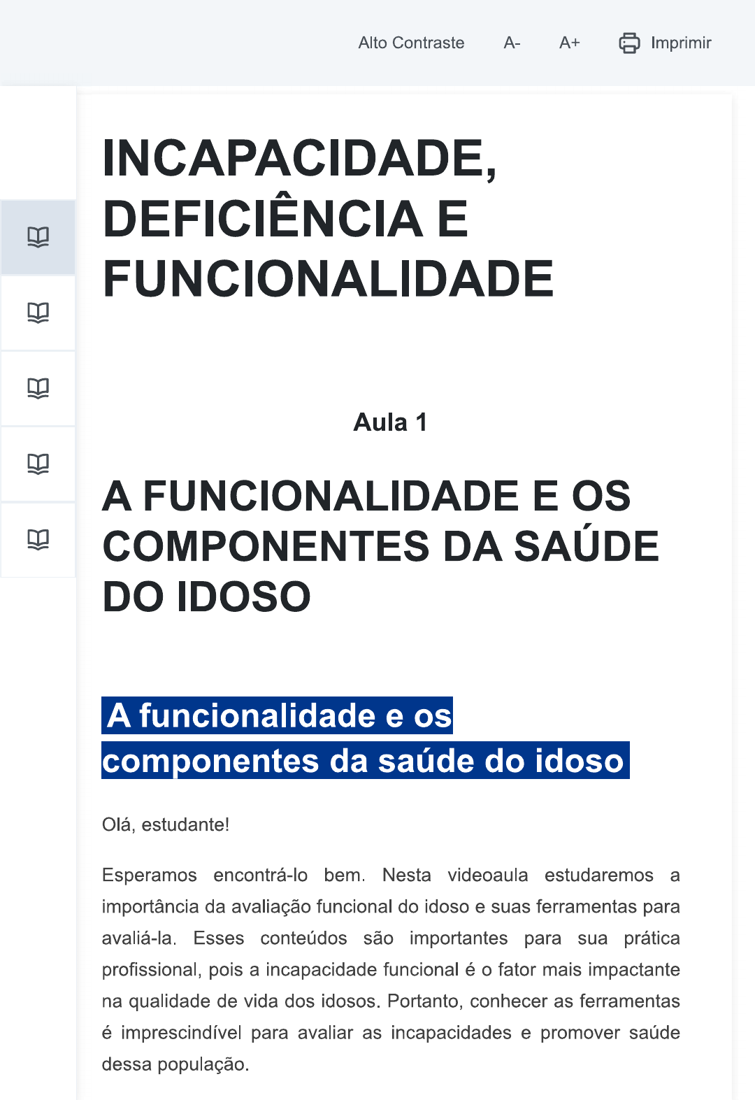 <p>Alto Contraste A- A+ Imprimir INCAPACIDADE, DEFICIÊNCIA E FUNCIONALIDADE Aula 1 A FUNCIONALIDADE E os COMPONENTES DA SAÚDE DO IDOSO A funcionalidade e os componentes da saúde do idoso Olá, estudante! Esperamos encontrá-lo bem. Nesta videoaula estudaremos a importância da avaliação funcional do idoso e suas ferramentas para avaliá-la. Esses conteúdos são importantes para sua prática profissional, pois a incapacidade funcional é o fator mais impactante na qualidade de vida dos idosos. Portanto, conhecer as ferramentas é imprescindível para avaliar as incapacidades e promover saúde dessa população.</p><p>Ponto de Partida O aumento progressivo e acelerado de idosos no mundo constitui um processo de transição demográfica, no qual as projeções estatísticas apontam que, em 2050, o Brasil terá a sexta maior população de idosos do mundo. Junto com essa transição também enfrentamos o aumento das doenças e agravos relacionados ao envelhecimento, tornando-se um problema de saúde pública devido aos altos custos gerados aos serviços de saúde. objetivo primordial do envelhecimento é o aumento da expectativa de uma vida saudável e com qualidade. Em relação à promoção do envelhecimento, o maior desafio dos profissionais de saúde é prevenir incapacidades e evitar o agravamento daquelas previamente instaladas, para que, assim, essa população possa suas possibilidades de viver com a máxima qualidade possível. Enquanto futuros técnicos em gerontologia, como poderemos atuar para garantir qualidade na assistência e, principalmente, para produzirmos ações efetivas e capazes de modificar a realidade?</p><p>funcional do idoso sobre diferentes aspectos: cognitivo, emocional, comportamental e competência física. O conteúdo foi organizado para que você tenha uma formação de destaque e alinhada com o mercado de trabalho. Bons estudos! Vamos Começar! Nas últimas décadas, o Brasil e o mundo vivenciam importantes mudanças nos padrões demográficos e de saúde que, entre várias consequências, conduz ao progressivo aumento da população idosa. Segundo o último censo divulgado em 2022, o total de pessoas com 65 anos ou mais no país chegou a 10,9% da população, com alta de 57,4% comparando-se a 2010. O índice de envelhecimento passou de 30,7, em 2010, para 55,2, em 2022, indicando que há 55,2 pessoas com mais de 65 anos para cada 100 crianças de 0 a 14 anos. Apesar do fato de as pessoas viverem por mais anos ser considerado um triunfo da humanidade, um ponto de reflexão levantado é: Será que a maior longevidade está relacionada com um aumento na qualidade de vida (QV)? Essa reflexão tem sido alvo de intensa preocupação nos diferentes níveis de saúde em relação às incapacidades que acompanham o envelhecimento fisiológico, prejudicando a independência dos idosos, inclusive nas atividades de vida diárias (AVD). Funcionalidade O envelhecimento é um processo natural da vida, e, à medida que avançamos em idade, é essencial promover a funcionalidade para</p><p>necessárias para conservar sua autonomia e independência. É vista como um item primordial na atenção à saúde do idoso, uma vez que expande o campo e a visão acerca do processo de avaliação saúde- doença. A funcionalidade pode ser avaliada considerando dois aspectos: atividades instrumentais de vida diária (AIVD) e atividades básicas de vida diária (ABVD). As AIVD correspondem às ações mais complexas que se referem à capacidade de ter independência na sociedade, tais como: fazer compras, usar o telefone, dirigir, usar transporte coletivo, manusear o próprio dinheiro ou administrar seus remédios. Já as ABVD são aquelas relativas ao autocuidado, como banhar-se, vestir-se, alimentar-se, caminhar da sala para a cozinha ou transferir-se da cama para a cadeira. Dessa forma, a avaliação da capacidade funcional tornou-se fundamental para a elaboração das condutas terapêuticas, visando à individualidade e, assim, possibilitando o melhor acompanhamento da situação clínica funcional do idoso, uma vez que fornece dados fundamentais para a assistência multiprofissional, que pode minimizar ou evitar a perda da capacidade funcional e prevenir complicações. Uma boa funcionalidade proporciona aos idosos melhor qualidade de vida, aumentando a autoestima e reduzindo a dependência de outros indivíduos para executar tarefas básicas. Além disso, a funcionalidade está diretamente relacionada à prevenção de doenças e à promoção do envelhecimento ativo. Por isso a avaliação funcional dos idosos é necessária, pois já existe evidência da relação entre a redução de medidas funcionais e o desenvolvimento da síndrome da fragilidade do idoso. A avaliação funcional procura observar em qual nível as doenças ou os agravos impedem a execução das atividades do dia a dia de forma independente e autônoma, isto é, sem o auxílio de outra</p><p>idoso. Existem algumas ferramentas utilizadas para avaliação da funcionalidade (avaliação de ABVD e AIVD), em que podem ser utilizados como instrumentos os seguintes questionários: Índice de Katz, Escala de Lawton, Escala de Barthel, entre outros. Os instrumentos de avaliação de equilíbrio/quedas também auxiliam na avaliação da funcionalidade, sendo eles o Timed Up and Go (TUG), Índice de Tinetti e a Escala de Berg, testes que iremos estudar mais adiante. Siga em Frente... Avaliação funcional Segundo a Política Nacional de Saúde da Pessoa Idosa (PNSPI), os idosos compõem um grupo de maior vulnerabilidade e, por isso, é necessária a incorporação de ferramentas, principalmente, no que tange à atenção básica, para melhoria da qualidade e resolutividade da atenção. Para isso, é importante uma abordagem multidimensional, com instrumentos técnicos, para avaliação funcional e psicossocial e o rastreio de fatores de risco a eventos adversos, bem como o desenvolvimento de ações preventivas o