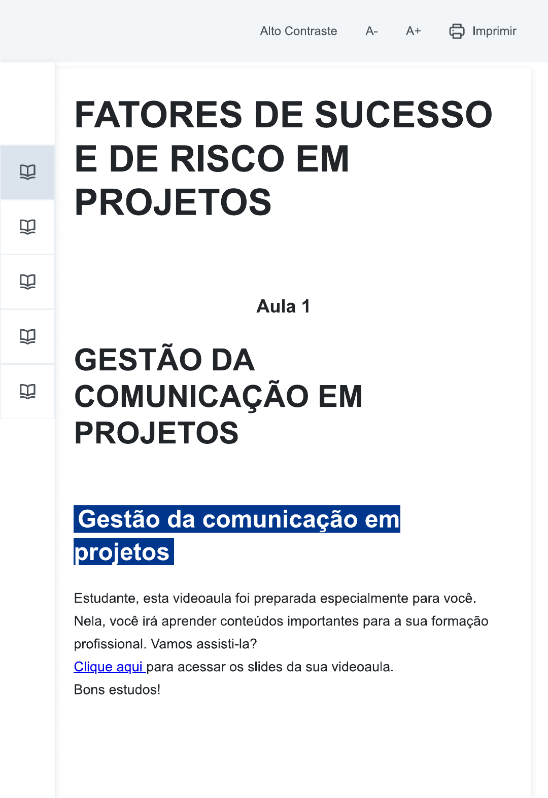 <p>Alto Contraste A- A+ Imprimir FATORES DE SUCESSO E DE RISCO EM PROJETOS Aula 1 GESTÃO DA COMUNICAÇÃO EM PROJETOS Gestão da comunicação em projetos Estudante, esta videoaula foi preparada especialmente para você. Nela, você irá aprender conteúdos importantes para a sua formação profissional. Vamos assisti-la? Clique aqui para acessar os slides da sua videoaula. Bons estudos!</p><p>Ponto de Partida Olá, estudante! Desejamos boas-vindas a você na primeira aula de mais uma unidade de ensino. Neste momento, vamos explorar os fatores responsáveis pelo sucesso do projeto ou, em contrapartida, pelo seu insucesso, desviando-o do foco inicial e impedindo o alcance de resultados efetivos. Dentre os diversos fatores que podem impactar positivamente ou não o projeto, tem-se a comunicação, importante para toda e qualquer organização justamente por viabilizar a visão sistêmica e a sinergia entre áreas. Nesse contexto, colocamos alguns questionamentos importantes como norteadores do nosso estudo: como gerenciar a comunicação de forma que ela otimize as atividades inerentes ao projeto? Como gerenciar o fluxo de comunicação de modo a viabilizar a interconexão entre os membros da equipe do projeto, permitindo uma gestão fluida, dinâmica e integrada? que comunicar e como comunicar? Nosso ponto de partida, então, além de compreender a importância da comunicação na gestão de projetos, consiste também em identificar processos e práticas, bem como ferramentas capazes de</p><p>Para facilitar a compreensão dos conceitos desta aula, vamos considerar o seguinte cenário: você faz parte de uma equipe de projeto contratada para gerenciar a revitalização de um parque público em sua cidade. Os objetivos da revitalização do parque abarcam as necessidades específicas da comunidade e das condições do parque, envolvendo, por exemplo, uma substituição das instalações existentes, como as áreas de recreação infantil e de convivência coletiva. A revitalização ainda envolverá a renovação da paisagem com a plantação de árvores, arbustos e flores. Garantir que o parque seja acessível a todos, incluindo pessoas com deficiência, por meio da instalação de rampas, calçadas acessíveis e sinalização adequada, também são itens pontuados no projeto. No geral, a revitalização do parque será realizada em etapas, com prioridade para áreas críticas ou com maior necessidade. As estratégias de implementação começam com o envolvimento da comunidade, buscando a participação dos moradores locais no processo de revitalização, solicitando feedback, ideias e apoio para o projeto. Serão estabelecidas parcerias público-privadas, colaborando com empresas locais, organizações sem fins lucrativos e outras entidades para obter financiamento, recursos e assistência na implementação do projeto. Será formada uma equipe dedicada para gerenciar o projeto, incluindo a coordenação de contratantes, supervisão do cronograma e orçamento, e comunicação com todas as partes interessadas. Além disso, serão estabelecidos mecanismos para monitorar o progresso do projeto, avaliar a eficácia das intervenções e fazer ajustes conforme necessário ao longo do tempo. Partindo do exposto, como gerenciar o fluxo de comunicação de todas as partes envolvidas neste projeto?</p><p>Boa aula! Vamos Começar! Gestão da comunicação em projetos: por onde começar? Segundo o Guia de Conhecimento em Gerenciamento de Projetos (PMBOK), a gestão da comunicação engloba os processos necessários para assegurar que as informações do projeto sejam planejadas, coletadas, distribuídas, armazenadas, recuperadas, controladas, monitoradas e, finalmente, dispostas de maneira apropriada e oportuna. Mas por qual motivo a gestão da comunicação é tão importante? De maneira geral, os gerentes de projetos e também os demais membros da equipe - passam a maior parte do tempo se comunicando entre si e com as outras partes interessadas do projeto a fim de viabilizar a execução das atividades. A comunicação, quando efetiva, cria uma ponte entre os envolvidos no projeto, tanto frente às questões operacionais quanto às questões mais subjetivas como, por exemplo, diferenças culturais e organizacionais, diferentes níveis de conhecimento e diversas perspectivas e interesses que podem impactar ou influenciar a execução ou resultado do projeto. Sabendo, então, de tal importância, para melhor organizar os processos e práticas capazes de permitir uma gestão mais eficaz da comunicação, o Project Management Institute (PMI) lista três atividades centrais:</p><p>partes interessadas e nos ativos organizacionais disponíveis. 2. Gerenciar as comunicações: diz respeito ao processo de criar, coletar, distribuir, armazenar, recuperar e de dispor as informações do projeto de acordo com o plano de gerenciamento das comunicações elaborado anteriormente. 3. Controlar as comunicações: engloba o processo de monitorar e controlar as comunicações no decorrer de todo o ciclo de vida do projeto a fim de assegurar que a necessidade de informação das partes interessadas do projeto sejam atendidas. É importante, ademais, destacar que essas três atividades abrangem diferentes dimensões: operacionais, táticas, estratégicas, instrumentais etc. O planejamento das informações, por exemplo, precisa envolver tanto a perspectiva interna do projeto quanto externa (clientes, fornecedores, organizações, público-alvo etc.), do mesmo modo que a forma como essa comunicação será instrumentalizada poderá envolver aspectos formais (relatórios, manuais) e/ou informais (discussões, e-mails, mensagens etc.). Ainda nesse contexto, em uma perspectiva estratégica, é preciso alinhar os fluxos de comunicação verticais e horizontais. Ou seja, como os níveis superiores e demais níveis funcionais do projeto se comunicam e interagem (fluxo vertical) e como os colegas de equipe e de diferentes ár