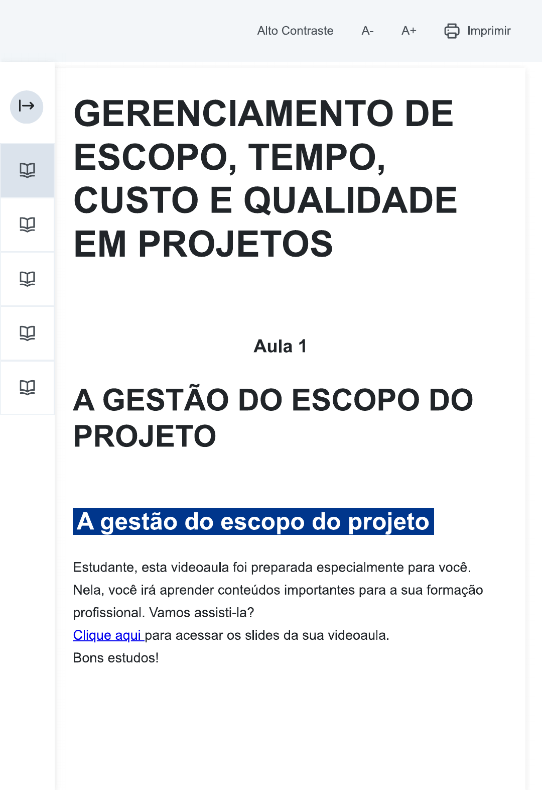 <p>Alto Contraste A- A+ Imprimir GERENCIAMENTO DE ESCOPO, TEMPO, CUSTO E QUALIDADE EM PROJETOS Aula 1 A GESTÃO DO ESCOPO DO PROJETO A gestão do escopo do projeto Estudante, esta videoaula foi preparada especialmente para você. Nela, você irá aprender conteúdos importantes para a sua formação profissional. Vamos assisti-la? Clique aqui para acessar os slides da sua videoaula. Bons estudos!</p><p>Ponto de Partida Olá, estudante! Seja bem-vindo! Considerando os conhecimentos adquiridos e desenvolvidos anteriormente, a saber, o cerne do gerenciamento de projetos a partir de um olhar introdutório, é chegado o momento de nos debruçarmos sobre alguns pontos importantes para otimizar resultados e potencializar nossa atuação na área. A gestão de escopo desempenha um papel vital na determinação do sucesso de qualquer projeto, independentemente de sua escala ou complexidade. É ela quem define as fronteiras do que deve ser feito, o que deve ser entregue e quais são os requisitos a serem atendidos. Nesta aula, então, você conhecerá conceitos, técnicas e práticas que o ajudarão a dominar tais habilidades. Como definir claramente os objetivos de um projeto? Como controlar as mudanças no escopo? Como garantir que as entregas atenderão às expectativas do cliente? Esses questionamentos são cruciais para o sucesso do projeto. Ademais, discutiremos como a gestão de escopo está intrinsecamente ligada a outras áreas de gerenciamento de projetos, como o controle de qualidade, a alocação de recursos e a gestão de</p><p>Agora, vamos imaginar um cenário onde você é um membro da equipe de projetos contratada para gerenciar um evento acadêmico, um ciclo de palestras de profissionais de diferentes áreas, destinado a estudantes que buscam aprimorar seus conhecimentos e habilidades. Este evento acontece anualmente em uma universidade renomada na sua região e é muito aguardado pela comunidade acadêmica. Lembre-se: o sucesso de um projeto começa com uma compreensão clara do que precisa ser feito, e é isso o que a gestão de escopo oferece. Desejamos a você, portanto, uma experiência de aprendizado enriquecedora e produtiva. Boa aula! Vamos Começar! Gestão do escopo do projeto: por onde começar? Como discutimos anteriormente, a gestão do escopo desempenha um papel fundamental no sucesso de projetos, independentemente de seu tamanho ou complexidade. O escopo de um projeto refere-se ao conjunto de atividades, objetivos, entregas e requisitos que precisam ser alcançados para atender aos objetivos do projeto. Logo, por qual motivo gerenciar o escopo é importante? Podemos associar sua importância a alguns pontos, notadamente: Clarificação de objetivos: a gestão do escopo ajuda a definir e comunicar claramente os objetivos do projeto. Isso assegura que todas as partes interessadas tenham uma compreensão</p><p>processos para lidar com mudanças ao longo do projeto. Alterações no escopo são inevitáveis, mas devem ser gerenciadas de forma controlada para evitar impactos negativos no cronograma e no orçamento. Previsão de recursos: ao definir o escopo de forma detalhada, é mais fácil estimar os recursos necessários, como pessoal, tempo e custos, o que auxilia na alocação eficiente de recursos e na prevenção de despesas desnecessárias. Aderência ao orçamento e prazo: a gestão do escopo ajuda a manter o projeto dentro dos limites orçamentários e prazos estabelecidos. Evita que o projeto se expanda descontroladamente, o que pode resultar em custos excessivos e atrasos. Melhoria da qualidade: um escopo bem definido permite um foco claro nas entregas do projeto. Isso, por sua vez, contribui para a qualidade das entregas, pois a equipe pode concentrar seus esforços em atender aos requisitos específicos. Satisfação do cliente: um escopo claro e bem gerenciado aumenta a probabilidade de satisfazer as expectativas do cliente, o que é essencial para a reputação da organização e a construção de relacionamentos sólidos com os clientes. Redução de riscos: uma gestão de escopo eficaz ajuda a identificar e mitigar riscos associados ao projeto. A compreensão detalhada do que deve ser entregue permite a implementação de estratégias de gestão de riscos mais eficientes. Melhor comunicação: a gestão do escopo envolve a comunicação eficaz com todas as partes interessadas, garantindo que todos estejam alinhados quanto às metas e limites do projeto.</p><p>reduzindo o risco de distrações. Documentação e histórico: a gestão do escopo produz documentação que serve como registro histórico do projeto. Isso é valioso para futuros projetos semelhantes e para a revisão pós-projeto, que permite aprender com sucessos e erros passados. Partindo do exposto, é possível inferir que a gestão do escopo fornece um roteiro claro para todas as partes interessadas, minimiza riscos, melhora a qualidade das entregas e ajuda a atender às expectativas do cliente. Uma gestão eficaz do escopo é, portanto, uma das chaves para o gerenciamento bem-sucedido de projetos. Mas por onde começar ou como operacionalizar a gestão do escopo? De maneira geral, um dos primeiros pontos na definição do escopo consiste na identificação das partes interessadas. Ou seja, comece identificando todas as partes interessadas no projeto. Isso inclui clientes, membros da equipe, patrocinadores, usuários finais e outros envolvidos. Compreender as necessidades e expectativas de todos é fundamental para definir um escopo eficaz. Na sequência, documentar o propósito do projeto e seus objetivos é muito importante. Nesta etapa, cabe, então, a criação de um relatório ou declaração concisa do propósito e dos objetivos do projeto. Essa declaração deve responder às seguintes perguntas: "por que estamos fazendo este projeto?" e "o que esperamos alcançar com ele?". Definir os objetivos ajuda a manter o foco no que é mais importante. Tendo os objetivos definidos, é preciso