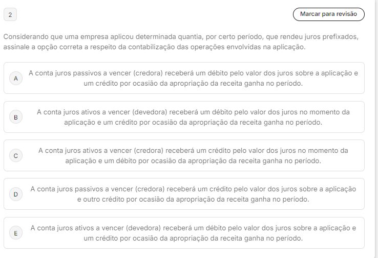 <p>2 Marcar para revisão Considerando que uma empresa aplicou determinada quantia, por certo que rendeu juros prefixados, assinale a opção correta a respeito da contabilização das operações envolvidas na aplicação. A conta juros passivos a vencer (credora) receberá um débito pelo valor dos juros sobre a aplicação e A um crédito por ocasião da apropriação da receita ganha no período. A conta juros ativos a vencer (devedora) receberá um débito pelo valor dos juros no momento da B aplicação e um crédito por ocasião da apropriação da receita ganha no período. A conta juros ativos a vencer (credora) receberá um crédito pelo valor dos juros no momento da C aplicação e um débito por ocasião da apropriação da receita ganha no A conta juros passivos a vencer (credora) receberá um crédito pelo valor dos juros sobre a aplicação D e outro crédito por ocasião da apropriação da receita ganha no A conta juros ativos a vencer (devedora) receberá um débito pelo valor dos juros sobre a aplicação e E um crédito por ocasião da apropriação da receita ganha no período.</p>
