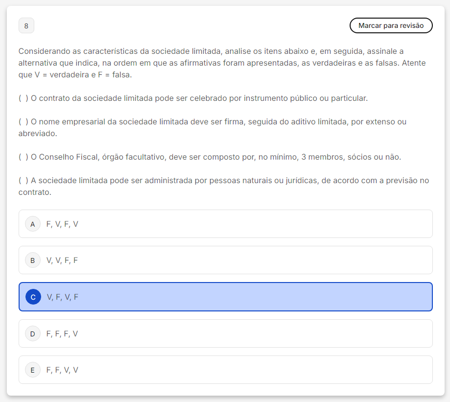 <p>8 Marcar para revisão Considerando as características da sociedade limitada, analise os itens abaixo e, em seguida, assinale a alternativa que indica, na ordem em que as afirmativas foram apresentadas, as verdadeiras e as falsas. Atente que V = verdadeira e F = falsa. ( ) contrato da sociedade limitada pode ser celebrado por instrumento público ou particular. ( ) nome empresarial da sociedade limitada deve ser firma, seguida do aditivo limitada, por extenso ou abreviado. ( ) Conselho Fiscal, órgão facultativo, deve ser composto por, no mínimo, 3 membros, sócios ou não. ( ) A sociedade limitada pode ser administrada por pessoas naturais ou jurídicas, de acordo com a previsão no contrato. A F, V, F, V B V, V, F, F C V, F, V, F D F, F, F, V E F, F, V, V</p>