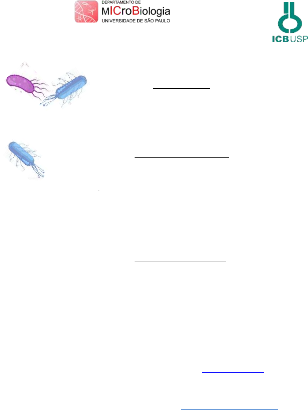 <p>1</p><p>DISCIPLINA BACTERIOLOGIA</p><p>BMM 0584</p><p>DOCENTES COORDENADORES:</p><p>Profs. Rita C. Café Ferreira ritacafe@usp.br</p><p>Jorge Timenesky joti@usp.br</p><p>Luís C. S. Ferreira lcsf@usp.br</p><p>DOCENTES COLABORADORES:</p><p>Profs. Luiziana Ferreira lukneif@icb.usp.br</p><p>Gabriel Padilha gpadilla@icb.usp.br</p><p>Robson F. de Souza rfsouza@usp.br</p><p>Técnico Bacteriologia</p><p>Eduardo Gimenes Martins egimenes@usp.br</p><p>Monitora PAE</p><p>Bárbara R. C. Armellini barbara.armellini@usp.br</p><p>mailto:egimenes@usp.br</p><p>2</p><p>Prática 1 - Microscopia - Morfologia e Citologia Bacteriana</p><p>Material: lâminas com esfregaços de diferentes espécimes, já coradas, e óleo de imersão.</p><p>Observação ao microscópio ótico, objetiva de 100X (as lâminas já estarão focadas!).</p><p>2a. Depositar uma gota de óleo de imersão no centro do esfregaço corado</p><p>2b. Colocar a lâmina no microscópio</p><p>2c. Imergir a lente da objetiva de imersão (100X) no óleo, até encostá-la na lâmina</p><p>2d. Levantar ao máximo o condensador e abrir totalmente o diafragma</p><p>2e. Focalizar com o macrométrico até notar o campo e, a seguir, aperfeiçoar o foco com o</p><p>micrométrico</p><p>2f. Terminada a observação, retirar a lâmina</p><p>2g. Limpar a objetiva com lenço de papel e desligar o microscópio</p><p>Observação das formas bacterianas, arranjos e estruturas:</p><p>3a. Cocos Gram-positivos em cadeias (estreptococos)</p><p>3b. Cocos Gram-positivos em cachos (estafilococos)</p><p>3c. Bacilos Gram-positivos</p><p>3d. Cocobacilos Gram-negativos</p><p>3e. Cocos Gram-negativos (Neisseria gonorrhoeae) em secreção uretral</p><p>3f. Esporos (coloração de Wirtz)</p><p>3g. Espiralados (técnica de Fontana-Tribondeau, impregnação com sais de prata)</p><p>3h. Cápsula (coloração negativa da cápsula)</p><p>4. Desenhar a morfologia, arranjo e coloração das bactérias focalizadas e suas estruturas.</p><p>5. Qual o aumento final das bactérias observadas?</p><p>3</p><p>Prática 2: Técnicas de Semeadura e Isolamento</p><p>Esta prática consiste em três atividades complementares:</p><p>1- Coleta de micro-organismos do ambiente</p><p>2- Método da estria em placa ou esgotamento</p><p>3- Método do Espalhamento com alça de Drigalsky.</p><p>Semeadura de cultura bacteriana: Conceitos Gerais</p><p>Toda vez que se fizer uma semeadura, os seguintes procedimentos devem ser observados:</p><p>A. As alças de vidro (Drigalsky) e de platina deverão ser flambadas antes e depois de</p><p>qualquer operação de semeadura. A alça de Drigalsky deverá ser esterilizada</p><p>mergulhando a mesma em uma placa de Petri ou Becker com álcool e, em seguida,</p><p>levada rapidamente à chama do bico de Bunsen por tempo suficiente para iniciar a</p><p>combustão do álcool. Cuidado! Não manter a alça sobre o fogo para que não se</p><p>quebre.</p><p>B. A alça de platina, deverá ser colocada na chama do bico de Bunsen, em um ângulo de</p><p>450C, até incandescer.</p><p>C. A alça de platina deverá ser esfriada na parede interna do tubo ou, se for o caso, no</p><p>meio da placa de Petri ainda não inoculada. A alça de Drigalsky deve ser esfriada na</p><p>face interna da tampa da placa de Petri antes de entrar em contato com a amostra.</p><p>D. Toda a vez que se fizer uma semeadura em tubos de ensaio, deve-se flambar a boca</p><p>dos mesmos, imediatamente após a retirada das tampas ou do algodão. A tampa</p><p>deverá ser retirada com o dedo mínimo da mão que estiver segurando a alça de platina</p><p>ou a pipeta. Após a retirada da amostra com as células, flambar novamente a boca do</p><p>tubo, antes de recolocar a tampa.</p><p>E. Não esquecer de identificar as culturas com o número do grupo de trabalho, seja no</p><p>fundo da placa ou nas paredes dos tubos. Não marcar as tampas, pois elas podem ser</p><p>trocadas acidentalmente, o que dificultará a posterior identificação do material.</p><p>F. As placas de Petri e os tubos de ensaio deverão ser abertos e semeados próximo ao</p><p>bico de Bunsen, para evitar contaminações com microrganismos presentes no ar. Em</p><p>seguida, colocar o material na estufa a 370C com a parte semeada voltada para baixo</p><p>(no caso de placas), para evitar que a água que irá se condensar na tampa caia sobre</p><p>as colônias.</p><p>Princípio</p><p>Estudos envolvendo a análise de materiais, como alimentos, leite, água e em alguns</p><p>casos o ar, requerem o conhecimento da quantidade de microrganismos presentes nesses</p><p>materiais. Diferentes métodos foram desenvolvidos para a quantificação de bactérias, como</p><p>a contagem direta das bactérias em microscópio ou contadores eletrônicos. Outras</p><p>abordagens incluem medição da massa celular; medida da turbidimetria da cultura e</p><p>método da diluição seriada de uma cultura celular, seguida de semeadura em meio sólido</p><p>(contagem de células viáveis ou unidades formadoras de colônias - U.F.C.).</p><p>Técnica de Isolamento de Culturas Puras</p><p>Na natureza, as populações microbianas não são homogêneas, porém contêm</p><p>misturas de várias espécies de bactérias e demais microrganismos. No laboratório, tais</p><p>culturas mistas podem ser separadas em culturas puras. Estas últimas, contendo um só</p><p>4</p><p>tipo de bactéria, são indispensáveis para a identificação e o estudo das propriedades</p><p>morfológicas, genéticas e bioquímicas da espécie estudada. Nesta prática, utilizaremos</p><p>técnicas cuja finalidade é produzir colônias individuais. Estas colônias, visíveis</p><p>macroscopicamente, são massas de bactérias, que resultaram da multiplicação de uma</p><p>única bactéria depositada na superfície do meio sólido no momento da semeadura. Uma</p><p>vez que as colônias foram individualizadas e identificadas, elas podem ser transferidas</p><p>assepticamente para outra placa com meio sólido e ass