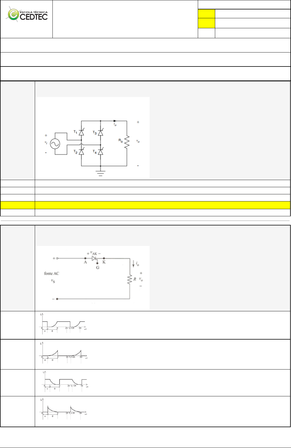 <p>Pincel Atômico - 23/09/2024 06:28:44 1/2</p><p>NILTON THIAGO</p><p>MARTINS CASTRO</p><p>Exercício Caminho do Conhecimento - Etapa 6 (27273)</p><p>Atividade finalizada em 23/09/2024 06:21:25 (2693036 / 1)</p><p>LEGENDA</p><p>Resposta correta na questão</p><p># Resposta correta - Questão Anulada</p><p>X Resposta selecionada pelo Aluno</p><p>Disciplina:</p><p>ELETRÔNICA DE POTÊNCIA [1029165] - Avaliação com 4 questões, com o peso total de 6,50 pontos [capítulos - 113]</p><p>Turma:</p><p>Curso Técnico: Eletrotécnica - Grupo: EAD - 02/24 - EAD ELE [113127]</p><p>Aluno(a):</p><p>91166439 - NILTON THIAGO MARTINS CASTRO - Respondeu 3 questões corretas, obtendo um total de 4,88 pontos como nota</p><p>[350057_188721]</p><p>Questão</p><p>001</p><p>Considerando o circuito da Figura e que a fonte de alimentação seja de 16 V (eficazes). Os Tiristores são ideais com ângulo de</p><p>condução de 45o e a carga tem resistência de 5 Ω, determine:</p><p>• A potência média na carga.</p><p>Po = 49,51W</p><p>Po = 56,51W</p><p>Po = 40,51W</p><p>X Po = 46,51W</p><p>Po = 76,51W</p><p>[350058_188715]</p><p>Questão</p><p>002</p><p>O circuito da figura abaixo é de um retificador monofásico controlado de meia onda sendo alimentado por uma fonte de tensão (Vs) AC,</p><p>a qual possui semiciclo positivo no intervalo de 0 a π e de 2π a 3π e semiciclo negativo no intervalo de π a 2π. Sabendo que α é o ângulo</p><p>de disparo do SCR e θ é o ângulo de condução, assinale a alternativa que mostra a forma de onda referente ao comportamento da</p><p>corrente i.</p><p>X</p><p>Pincel Atômico - 23/09/2024 06:28:44 2/2</p><p>[350058_188713]</p><p>Questão</p><p>003</p><p>A respeito do SCR, dispositivo de potência de estado sólido muito utilizado na eletrônica industrial, analise as afirmativas a seguir.</p><p>I. O SCR possui sua construção realizada em 4 camadas tipo p e n, resultando em PNPN.</p><p>II. Para que o SCR entre em condução, além de estar diretamente polarizado, um pulso de tensão positiva deve ser aplicado no gatilho.</p><p>III. O gatilho deve permanecer com corrente para manter o SCR conduzindo.</p><p>Está CORRETO o que se apresenta em:</p><p>II, somente.</p><p>II e III, somente.</p><p>X I e II, somente</p><p>I, somente</p><p>III, somente</p><p>[350059_188717]</p><p>Questão</p><p>004</p><p>Considere a curva característica representada abaixo.</p><p>Esta curva refere-se ao dispositivo:</p><p>PUT</p><p>SBS</p><p>DIAC</p><p>X SCR</p><p>PTC</p>