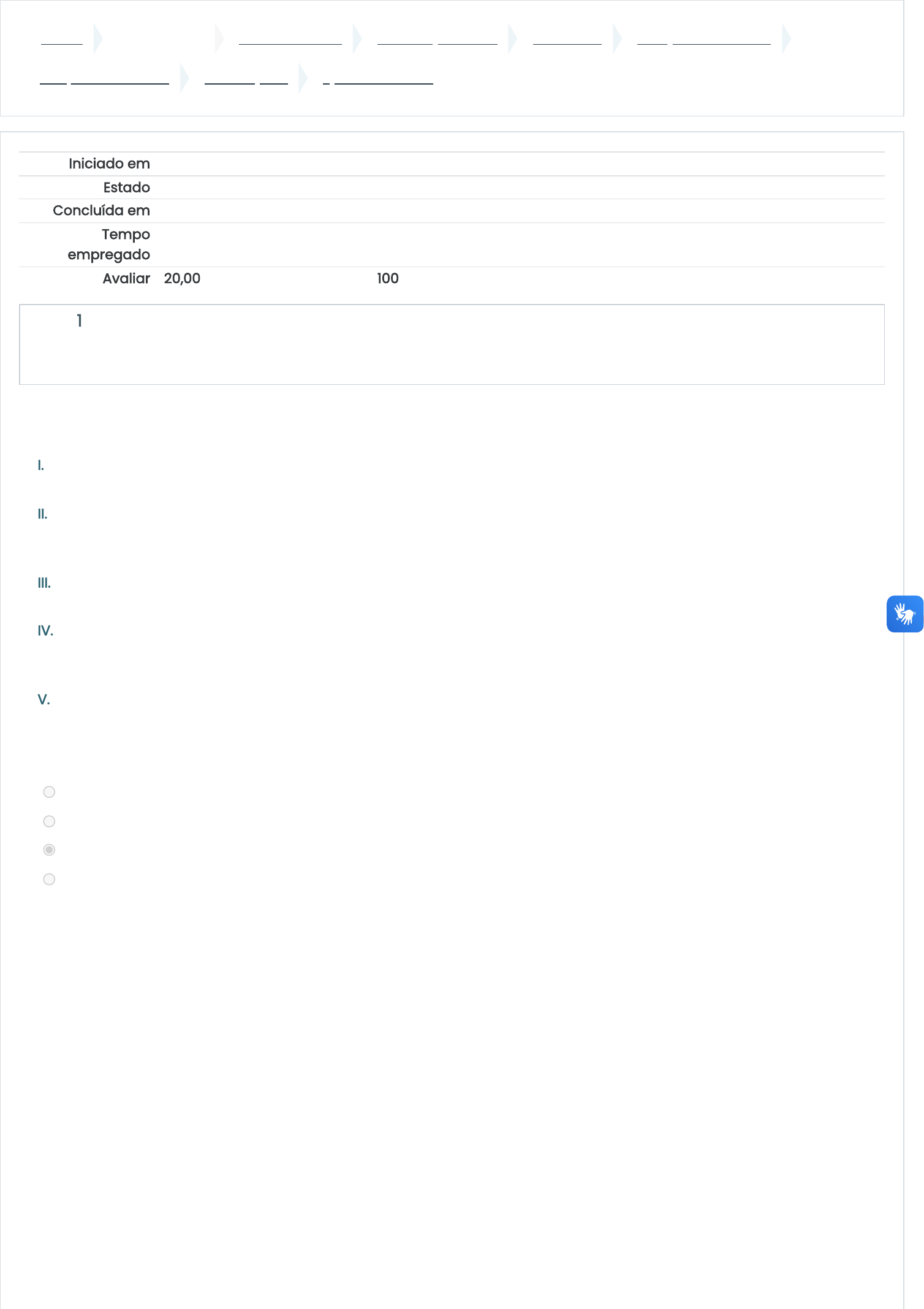 <p>Painel Meus cursos CURSOS FUNEC Graduação - EAD Aluno EAD JUNÇÕES DE TURMA</p><p>Máquinas Elétricas AVALIAÇÕES QUESTIONÁRIO 2</p><p>Iniciado em Saturday, 28 Sep 2024, 10:50</p><p>Estado Finalizada</p><p>Concluída em Saturday, 28 Sep 2024, 10:57</p><p>Tempo</p><p>empregado</p><p>7 minutos 6 segundos</p><p>Avaliar 20,00 de um máximo de 20,00(100%)</p><p>Questão 1</p><p>Completo</p><p>Atingiu 2,00 de 2,00</p><p>Considere as afirmativas a seguir sobre as máquinas de indução:</p><p>I. Em funcionamento normal, os campos magnéticos do rotor e do estator giram juntos na velocidade síncrona, porém</p><p>o rotor gira em uma velocidade menor.</p><p>II. Durante a partida, um motor de indução opera com velocidade menor do que a velocidade síncrona.</p><p>Gradativamente, o motor vai aumentando a velocidade até alcançar a velocidade síncrona, sem escorregamento,</p><p>onde opera com o conjugado máximo.</p><p>III. Em um motor de indução de rotor bobinado, ao aumentar a resistência elétrica do rotor, o conjugado máximo é</p><p>atingido em uma velocidade de rotação menor, porém o valor do conjugado máximo não se altera.</p><p>IV. Um gerador de indução operando em paralelo com um sistema de potência não necessita ser acionado</p><p>continuamente com velocidade fixa. Enquanto a rotação da máquina for superior à velocidade síncrona do sistema ao</p><p>qual está ligado, este dispositivo irá operar como gerador.</p><p>V. A tensão a vazio de um gerador de indução é controlada pelo ajuste da corrente do circuito de campo.</p><p>Conclui-se que:</p><p>Escolha uma opção:</p><p>a. Apenas as afirmativas II e IV estão corretas;</p><p>b. Apenas as afirmativas I e III estão corretas;</p><p>c. Apenas as afirmativas I, III e IV estão corretas;</p><p>d. Todas as afirmativas estão INCORRETAS;</p><p>https://ava.funec.br/my/</p><p>https://ava.funec.br/course/index.php?categoryid=10</p><p>https://ava.funec.br/course/index.php?categoryid=17</p><p>https://ava.funec.br/course/index.php?categoryid=19</p><p>https://ava.funec.br/course/index.php?categoryid=77</p><p>https://ava.funec.br/course/view.php?id=1994</p><p>https://ava.funec.br/course/view.php?id=1994#section-5</p><p>https://ava.funec.br/mod/quiz/view.php?id=23249</p><p>Questão 2</p><p>Completo</p><p>Atingiu 2,00 de 2,00</p><p>Um motor de indução de 380 V, 10 HP, 60 Hz, quatro polos e ligado em Y, conforme a figura a seguir, tem as seguintes</p><p>impedâncias em ohms por fase, referidas ao circuito do estator:</p><p>R = 0,540 Ω; R = 0,488 Ω</p><p>X = 2,093 Ω; X = 3,209 Ω; X = 51,12Ω</p><p>Marque a opção que representa, respectivamente, o conjugado máximo e o conjugado de partida do motor:</p><p>Escolha uma opção:</p><p>a. Τ = 170,4 N.m; Τ = 104,2 N.m</p><p>b. Τ = 80,3 N.m; Τ = 80,3 N.m</p><p>c. Τ = 61,5 N.m; Τ = 12,2 N.m</p><p>d. Τ = 33,7 N.m; Τ = 6,7 N.m</p><p>1 2</p><p>1 2 M</p><p>ind máx. ind partida</p><p>ind máx. ind partida</p><p>ind máx. ind partida</p><p>ind máx. ind partida</p><p>Questão 3</p><p>Completo</p><p>Atingiu 2,00 de 2,00</p><p>Questão 4</p><p>Completo</p><p>Atingiu 2,00 de 2,00</p><p>Considere as afirmativas a seguir sobre os MOTORES MONOFÁSICOS:</p><p>I. O motor universal é uma extensão imediata do motor CC série e, portanto, pode funcionar tanto com uma fonte de</p><p>tensão CC como uma fonte de tensão CA.</p><p>II. Um motor de indução monofásico não possui conjugado de partida, no entanto, quando o rotor começa a girar em</p><p>um dos sentidos surgirá um conjugado líquido que tende a frear e girar o rotor no sentido contrário ao movimento.</p><p>III. Um motor de indução monofásico com enrolamento de fase dividida possui um enrolamento auxiliar posicionado</p><p>com um distanciamento angular de 90° do enrolamento principal. Dessa forma, com uma corrente adiantada devido a</p><p>uma maior relação resistência/reatância em relação ao enrolamento principal, haverá a rotação do campo</p><p>magnético e surgirá um conjugado de partida.</p><p>IV. Nos motores de indução monofásicos com dois capacitores, um capacitor de valor menor estará presente no</p><p>circuito do enrolamento auxiliar apenas durante a partida. Quando o motor atinge certa velocidade de operação, a</p><p>chave centrífuga abre e apenas o capacitor permanente com maior valor de capacitância é mantido no circuito</p><p>auxiliar.</p><p>V. Os motores de indução monofásicos de polos sombreados produzem menos conjugado de partida do que qualquer</p><p>outro tipo de partida para motor de indução. Neste tipo de motor o sentido de rotação pode ser invertido simplesmente</p><p>trocando as ligações da bobina de sombreamento.</p><p>Conclui-se que:</p><p>Escolha uma opção:</p><p>a. Apenas as afirmativas I e III estão corretas</p><p>b. Apenas as afirmativas I, II, IV e V estão corretas</p><p>c. Apenas as afirmativas II e IV estão corretas</p><p>d. Apenas as afirmativas III e V estão corretas</p><p>Assinale a alternativa INCORRETA sobre os motores e geradores CC:</p><p>Escolha uma opção:</p><p>a. Um motor CC série o conjugado é proporcional ao quadrado de sua corrente de armadura. Como resultado, este</p><p>tipo de motor fornece mais conjugado por ampère do que qualquer outro motor CC.</p><p>b. Um gerador CC série a vazio possui tensões em um nível bem baixo, dado somente pelo fluxo residual presente</p><p>na máquina. A medida que a corrente aumente, a tensão induzida internamente eleva-se rapidamente.</p><p>c. Uma desvantagem do motor CC composto cumulativo é que quando o conjugado vai a zero, a velocidade de</p><p>rotação do motor CC série tende ao infinito.</p><p>d. Em um gerador CC composto cumulativo na configuração hipercomposto, a tensão de terminal de plena carga</p><p>é maior do que a tensão de terminal a vazio, devido ao reforço produzido no fluxo pelo enrolamento série.</p><p>Questão 5</p><p>Completo</p><p>Atingiu 2,00 de 2,00</p><p>Analise