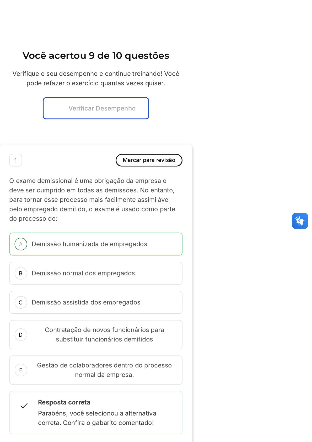 <p>Você acertou 9 de 10 questões</p><p>Verifique o seu desempenho e continue treinando! Você</p><p>pode refazer o exercício quantas vezes quiser.</p><p>Verificar Desempenho</p><p>A</p><p>B</p><p>C</p><p>D</p><p>E</p><p>1 Marcar para revisão</p><p>O exame demissional é uma obrigação da empresa e</p><p>deve ser cumprido em todas as demissões. No entanto,</p><p>para tornar esse processo mais facilmente assimilável</p><p>pelo empregado demitido, o exame é usado como parte</p><p>do processo de:</p><p>Demissão humanizada de empregados</p><p>Demissão normal dos empregados.</p><p>Demissão assistida dos empregados</p><p>Contratação de novos funcionários para</p><p>substituir funcionários demitidos</p><p>Gestão de colaboradores dentro do processo</p><p>normal da empresa.</p><p>Resposta correta</p><p>Parabéns, você selecionou a alternativa</p><p>correta. Confira o gabarito comentado!</p><p>A</p><p>B</p><p>Gabarito Comentado</p><p>O exame demissional é uma etapa importante do</p><p>processo de demissão, pois garante que o</p><p>empregado está saindo da empresa em boas</p><p>condições de saúde. A alternativa correta é a</p><p>"Demissão humanizada de empregados". Esse termo</p><p>se refere a um processo de demissão que busca</p><p>minimizar o impacto emocional e psicológico no</p><p>empregado demitido, tornando a situação mais</p><p>compreensível e menos traumática. O exame</p><p>demissional é uma parte desse processo, pois</p><p>demonstra a preocupação da empresa com o bem-</p><p>estar do empregado, mesmo no momento da</p><p>demissão.</p><p>2 Marcar para revisão</p><p>Josué e Marcos são funcionários da sociedade</p><p>empresária Empreendimento Seguro Ltda., especializada</p><p>em consultoria em Segurança do Trabalho e prevenção</p><p>de acidentes. No ambiente de trabalho de ambos,</p><p>também ficam outros 10 funcionários, havendo placas de</p><p>proibição de fumar, o que era frisado na contratação de</p><p>cada empregado. O superior hierárquico de todos esses</p><p>funcionários dividiu as atribuições de cada um, cabendo</p><p>a Marcos a elaboração da estatística de acidentes</p><p>ocorridos nos últimos dois anos, tarefa a ser executada</p><p>em quatro dias. Ao final do prazo, ao entrar na sala, o</p><p>chefe viu Josué fumando um cigarro. Em seguida, ao</p><p>questionar Marcos sobre a tarefa, teve como resposta</p><p>que ele não a tinha executado porque não gostava de</p><p>fazer estatísticas. Diante do caso, assinale a afirmativa</p><p>correta.</p><p>Ambos praticaram ato de indisciplina</p><p>Ambos praticaram ato de insubordinação</p><p>C</p><p>D</p><p>E</p><p>Josué e Marcos são passíveis de serem</p><p>dispensados por justa causa, respectivamente</p><p>por atos de indisciplina e insubordinação</p><p>A conduta de ambos não encontra tipificação</p><p>legal passível de dispensa por justa causa</p><p>Apenas Josué é passível de ser dispensado por</p><p>justa causa</p><p>Resposta correta</p><p>Parabéns, você selecionou a alternativa</p><p>correta. Confira o gabarito comentado!</p><p>Gabarito Comentado</p><p>Na situação apresentada, Josué e Marcos</p><p>cometeram infrações diferentes. Josué, ao fumar no</p><p>ambiente de trabalho, onde é expressamente</p><p>proibido, cometeu um ato de indisciplina, pois</p><p>desobedeceu a uma regra estabelecida pela</p><p>empresa. Já Marcos, ao se recusar a realizar a tarefa</p><p>que lhe foi atribuída, cometeu um ato de</p><p>insubordinação, pois desobedeceu a uma ordem</p><p>direta de seu superior. Portanto, ambos são passíveis</p><p>de serem dispensados por justa causa,</p><p>respectivamente por atos de indisciplina e</p><p>insubordinação.</p><p>3 Marcar para revisão</p><p>De acordo com a Consolidação das Leis do Trabalho -</p><p>CLT, o empregado poderá considerar rescindido o</p><p>contrato de trabalho e pleitear a devida indenização</p><p>quando:</p><p>A</p><p>B</p><p>C</p><p>D</p><p>E</p><p>Correr perigo manifesto de mal considerável.</p><p>Houver desídia no desempenho de suas</p><p>respectivas funções.</p><p>Ocorrer incontinência de conduta ou mau</p><p>procedimento.</p><p>Praticar ato de improbidade administrativa.</p><p>Faltar por período superior a 20 dias.</p><p>Resposta correta</p><p>Parabéns, você selecionou a alternativa</p><p>correta. Confira o gabarito comentado!</p><p>Gabarito Comentado</p><p>De acordo com a Consolidação das Leis do Trabalho</p><p>- CLT, o empregado tem o direito de considerar</p><p>rescindido o contrato de trabalho e pleitear a devida</p><p>indenização quando corre perigo manifesto de mal</p><p>considerável. Isso significa que, se o empregado</p><p>estiver em uma situação de risco evidente que possa</p><p>causar danos significativos, ele tem o direito de</p><p>encerrar o contrato de trabalho e solicitar a</p><p>indenização correspondente. Portanto, a alternativa</p><p>correta é a 'A': Correr perigo manifesto de mal</p><p>considerável.</p><p>4 Marcar para revisão</p><p>De acordo com a Consolidação das Leis do Trabalho, na</p><p>despedida por justa causa, o empregado tem assegurado</p><p>A</p><p>B</p><p>C</p><p>D</p><p>E</p><p>O pagamento do 13º (décimo terceiro) salário</p><p>proporcional.</p><p>O direito à liberação do fundo de garantia do</p><p>tempo de serviço, sem o acréscimo de 40%</p><p>(quarenta por cento).</p><p>A indenização de férias vencidas acrescidas de</p><p>1/3 (um terço), quando completado o período</p><p>aquisitivo.</p><p>O aviso prévio indenizado, no prazo mínimo.</p><p>O saldo salarial e as férias proporcionais</p><p>acrescidas de 1/3 (um terço).</p><p>Resposta correta</p><p>Parabéns, você selecionou a alternativa</p><p>correta. Confira o gabarito comentado!</p><p>Gabarito Comentado</p><p>De acordo com a Consolidação das Leis do Trabalho,</p><p>na despedida por justa causa, o empregado tem</p><p>direito à indenização de férias vencidas acrescidas</p><p>de 1/3 (um terço), 