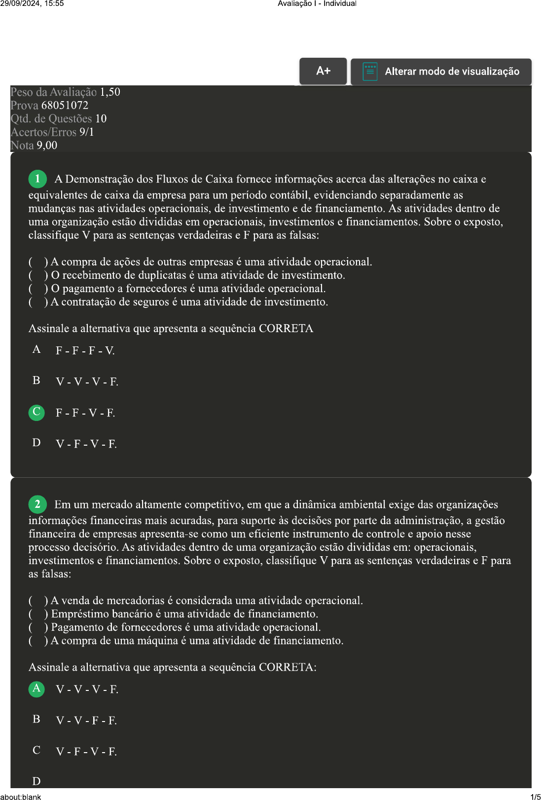 <p>29/09/2024, 15:55 Avaliação Individual A+ Alterar modo de visualização Peso da Avaliação 1,50 Prova 68051072 Qtd. de Questões 10 Acertos/Erros 9/1 Nota 9,00 1 A Demonstração dos Fluxos de Caixa fornece informações acerca das alterações no caixa e equivalentes de caixa da empresa para um período contábil, evidenciando separadamente as mudanças nas atividades operacionais, de investimento e de financiamento. As atividades dentro de uma organização estão divididas em operacionais, investimentos e financiamentos. Sobre exposto, classifique V para as sentenças verdadeiras e F para as falsas: ( ) A compra de ações de outras empresas é uma atividade operacional. ( ) O recebimento de duplicatas é uma atividade de investimento. ( ) O pagamento a fornecedores é uma atividade operacional. ( ) A contratação de seguros é uma atividade de investimento. Assinale a alternativa que apresenta a sequência CORRETA A F F F - V. B C D 2 Em um mercado altamente competitivo, em que a dinâmica ambiental exige das organizações informações financeiras mais acuradas, para suporte às decisões por parte da administração, a gestão financeira de empresas apresenta-se como um eficiente instrumento de controle e apoio nesse processo decisório. As atividades dentro de uma organização estão divididas em: operacionais, investimentos e financiamentos. Sobre exposto, classifique V para as sentenças verdadeiras e F para as falsas: ( ) A venda de mercadorias é considerada uma atividade operacional. ( ) Empréstimo bancário é uma atividade de financiamento. ( ) Pagamento de fornecedores é uma atividade operacional. ( ) A compra de uma máquina é uma atividade de financiamento. Assinale a alternativa que apresenta a sequência CORRETA: A B C D about:blank 1/5</p><p>29/09/2024, 15:55 Avaliação Individual F F V V. 3 A dependência financeira da empresa com capital externo pode ser medida através da comparação dos valores aplicados por terceiros com relação ao Patrimônio Líquido. Esse índice pode demonstrar a vulnerabilidade da empresa com relação aos cenários internos e externos. Sobre índice que demonstra essa situação, assinale a alternativa CORRETA: A Participação de capitais de terceiros. B Imobilização do Patrimônio Líquido. C Imobilização dos recursos não correntes. D Composição do endividamento. Revisar Conteúdo do Livro 4 Conforme Assaf Neto (2005, p. 325), "capacidades diferenciadoras são entendidas como estratégias adotadas que permitem às empresas atuarem com um nível de diferenciação em relação a seus concorrentes de mercado, assumindo uma vantagem competitiva e maior agregação de valor a seus proprietários". Diante dessa visão, autor aponta as capacidades diferenciadoras com base em: relações de negócio, conhecimento do negócio, qualidade e inovação. Sobre esse assunto, analise as sentenças a seguir: I- Uma visão de toda a empresa, levando em consideração sua sinergia, permite ao gestor visualizar suas oportunidades para que se possa elaborar planos estratégicos de agregação de valor ao produto ou serviço ofertado ao mercado. II- Fidelização dos clientes, satisfação dos empregados e financiamentos podem ser uma via para se diferenciar perante mercado. III- A necessidade do consumidor permite à empresa estipular seu preço diante do produto ou serviço oferecido, podendo desconsiderar preço que seu cliente está disposto a pagar. IV- A inovação em produtos e serviços gera um custo desnecessário para a empresa. Manter produto no mesmo modelo ofertado desde começo de sua comercialização é único meio de manter as vendas em alta. Assinale a alternativa CORRETA: FONTE: ASSAF NETO, Alexandre. Finanças corporativas e valor. 2. ed. São Paulo: Atlas, 2005. A As sentenças I e II estão corretas. B As sentenças II e IV estão corretas. C As sentenças I e III estão corretas. D As sentenças III e IV estão corretas. 5 Para Assaf Neto (2005, p. 189), conceito de gestão baseado em valor envolve a mensuração do valor econômico agregado (VEA) como a principal referência para se avaliar desempenho da about:blank 2/5</p><p>29/09/2024, 15:55 Avaliação Individual empresa". O VEA considera os custos da estrutura e capital investido. Assinale a alternativa CORRETA que apresenta uma ação considerada pelo VEA para maximização dos lucros: FONTE: ASSAF NETO, Alexandre. Finanças corporativas e valor. 2. ed. São Paulo: Atlas, 2005. Evitar investimentos em que gestor não identifique um resultado operacional líquido que seja acima dos custos dos encargos gerados pelo investimento. B Investir em ativos em que não estejam gerando retorno desejado como forma de alavancar seus lucros. C Investir em projetos em que se apresenta uma baixa viabilidade para retorno de divisas. D Baixar custo de produção com venda de ativos e redução da produção, desconsiderando a necessidade do mercado. 6 O surgimento do Valor Econômico Agregado EVA foi uma grande solução para os níveis de governança corporativa nas companhias de capital aberto, já que essas empresas necessitam evidenciar em suas demonstrações contábeis a criação de valor para acionista. Sobre EVA, analise as sentenças a seguir: I- O EVA demonstra os custos financeiros do capital próprio e de terceiros. II- O EVA mensura lucro após Imposto de Renda. III-O EVA calcula lucro antes do Imposto de Renda e CSLL. Agora, assinale a alternativa CORRETA: A Somente a sentença II está correta. B As sentenças II e III estão corretas. As sentenças I e II estão corretas. D As sentenças I e III estão corretas. 7 O estudo de finanças compreende registro e a análise da vida econômica das organizações, metas a serem atingidas em determinado prazo, gerência das fontes de renda e dos investimentos destinados a gerar recursos que a sustentem. O segmento de serviços é que mais cresce dentro de uma economia globalizada. A formação mais comum é de admin