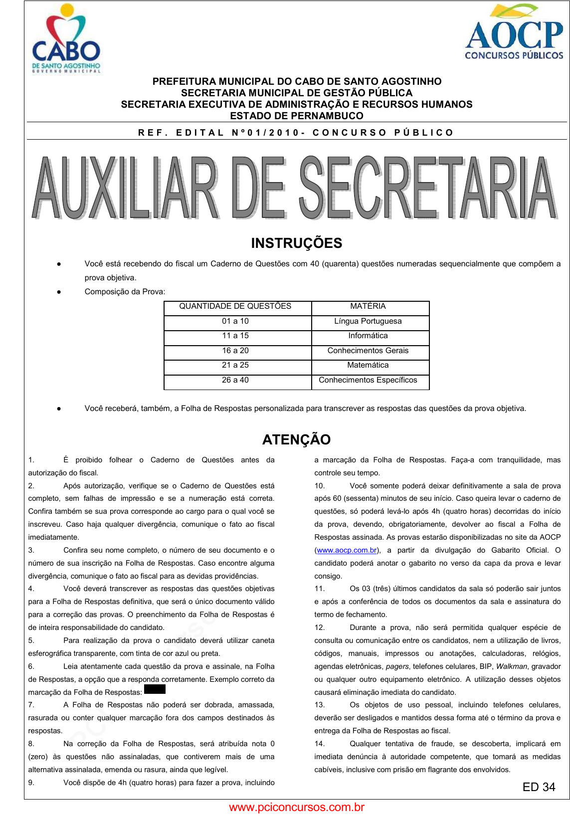 <p>pcimarkpci MDAwMDowMDAwOjAwMDA6MDAwMDowMDAwOmZmZmY6YWFlZTo3ODg0:U3VuLCAyMiBTZXAgMjAyNCAxNjoyNDoyNSAtMDMwMA==</p><p>www.pciconcursos.com.br</p><p>PREFEITURA MUNICIPAL DO CABO DE SANTO AGOSTINHO</p><p>SECRETARIA MUNICIPAL DE GESTÃO PÚBLICA</p><p>SECRETARIA EXECUTIVA DE ADMINISTRAÇÃO E RECURSOS HU MANOS</p><p>ESTADO DE PERNAMBUCO</p><p>R E F . E D I T A L N º 0 1 / 2 0 1 0 - C O N C U R S O P Ú B L I C O</p><p>INSTRUÇÕES</p><p>● Você está recebendo do fiscal um Caderno de Questões com 40 (quarenta) questões numeradas sequencialmente que compõem a</p><p>prova objetiva.</p><p>● Composição da Prova:</p><p>QUANTIDADE DE QUESTÕES MATÉRIA</p><p>01 a 10 Língua Portuguesa</p><p>11 a 15 Informática</p><p>16 a 20 Conhecimentos Gerais</p><p>21 a 25 Matemática</p><p>26 a 40 Conhecimentos Específicos</p><p>● Você receberá, também, a Folha de Respostas personalizada para transcrever as respostas das questões da prova objetiva.</p><p>ATENÇÃO</p><p>1. É proibido folhear o Caderno de Questões antes da</p><p>autorização do fiscal.</p><p>2. Após autorização, verifique se o Caderno de Questões está</p><p>completo, sem falhas de impressão e se a numeração está correta.</p><p>Confira também se sua prova corresponde ao cargo para o qual você se</p><p>inscreveu. Caso haja qualquer divergência, comunique o fato ao fiscal</p><p>imediatamente.</p><p>3. Confira seu nome completo, o número de seu documento e o</p><p>número de sua inscrição na Folha de Respostas. Caso encontre alguma</p><p>divergência, comunique o fato ao fiscal para as devidas providências.</p><p>4. Você deverá transcrever as respostas das questões objetivas</p><p>para a Folha de Respostas definitiva, que será o único documento válido</p><p>para a correção das provas. O preenchimento da Folha de Respostas é</p><p>de inteira responsabilidade do candidato.</p><p>5. Para realização da prova o candidato deverá utilizar caneta</p><p>esferográfica transparente, com tinta de cor azul ou preta.</p><p>6. Leia atentamente cada questão da prova e assinale, na Folha</p><p>de Respostas, a opção que a responda corretamente. Exemplo correto da</p><p>marcação da Folha de Respostas:</p><p>7. A Folha de Respostas não poderá ser dobrada, amassada,</p><p>rasurada ou conter qualquer marcação fora dos campos destinados às</p><p>respostas.</p><p>8. Na correção da Folha de Respostas, será atribuída nota 0</p><p>(zero) às questões não assinaladas, que contiverem mais de uma</p><p>alternativa assinalada, emenda ou rasura, ainda que legível.</p><p>9. Você dispõe de 4h (quatro horas) para fazer a prova, incluindo</p><p>a marcação da Folha de Respostas. Faça-a com tranquilidade, mas</p><p>controle seu tempo.</p><p>10. Você somente poderá deixar definitivamente a sala de prova</p><p>após 60 (sessenta) minutos de seu início. Caso queira levar o caderno de</p><p>questões, só poderá levá-lo após 4h (quatro horas) decorridas do início</p><p>da prova, devendo, obrigatoriamente, devolver ao fiscal a Folha de</p><p>Respostas assinada. As provas estarão disponibilizadas no site da AOCP</p><p>(www.aocp.com.br), a partir da divulgação do Gabarito Oficial. O</p><p>candidato poderá anotar o gabarito no verso da capa da prova e levar</p><p>consigo.</p><p>11. Os 03 (três) últimos candidatos da sala só poderão sair juntos</p><p>e após a conferência de todos os documentos da sala e assinatura do</p><p>termo de fechamento.</p><p>12. Durante a prova, não será permitida qualquer espécie de</p><p>consulta ou comunicação entre os candidatos, nem a utilização de livros,</p><p>códigos, manuais, impressos ou anotações, calculadoras, relógios,</p><p>agendas eletrônicas, pagers, telefones celulares, BIP, Walkman, gravador</p><p>ou qualquer outro equipamento eletrônico. A utilização desses objetos</p><p>causará eliminação imediata do candidato.</p><p>13. Os objetos de uso pessoal, incluindo telefones celulares,</p><p>deverão ser desligados e mantidos dessa forma até o término da prova e</p><p>entrega da Folha de Respostas ao fiscal.</p><p>14. Qualquer tentativa de fraude, se descoberta, implicará em</p><p>imediata denúncia à autoridade competente, que tomará as medidas</p><p>cabíveis, inclusive com prisão em flagrante dos envolvidos.</p><p>ED 34</p><p>www.pciconcursos.com.br</p><p>pcimarkpci MDAwMDowMDAwOjAwMDA6MDAwMDowMDAwOmZmZmY6YWFlZTo3ODg0:U3VuLCAyMiBTZXAgMjAyNCAxNjoyNDoyNSAtMDMwMA==</p><p>www.pciconcursos.com.br</p><p>CARGO: AUXILIAR DE SECRETARIA</p><p>- 2 -</p><p>FOLHA PARA ANOTAÇÃO DAS RESPOSTAS DO CANDIDATO</p><p>QUESTÃO 01 02 03 04 05 06 07 08 09 10 11 12 13 14 15 16 17 18 19 20</p><p>RESP.</p><p>QUESTÃO 21 22 23 24 25 26 27 28 29 30 31 32 33 34 35 36 37 38 39 40</p><p>RESP.</p><p>www.pciconcursos.com.br</p><p>pcimarkpci MDAwMDowMDAwOjAwMDA6MDAwMDowMDAwOmZmZmY6YWFlZTo3ODg0:U3VuLCAyMiBTZXAgMjAyNCAxNjoyNDoyNSAtMDMwMA==</p><p>www.pciconcursos.com.br</p><p>CARGO: AUXILIAR DE SECRETARIA</p><p>- 3 -</p><p>LÍNGUA PORTUGUESA</p><p>TEXTO 1</p><p>Escovar os dentes corretamente pode prevenir doenças</p><p>cardíacas.</p><p>Bactérias causadoras de gengivite podem entram na</p><p>corrente sanguínea.</p><p>Alerta é dado por estudo escocês publicado no</p><p>'British Medical Journal'.</p><p>Uma pesquisa escocesa publicada no British</p><p>Medical Journal, revista especializada em medicina,</p><p>aponta que a saúde da boca está diretamente</p><p>relacionada com a saúde geral do paciente. De</p><p>acordo com o estudo feito com quase 12 mil</p><p>pessoas, quem não escova os dentes, ou os escova</p><p>apenas uma vez por dia, tem mais chance de ter</p><p>problemas cardiovasculares.</p><p>O professor de odontologia Eduardo Rollo Duarte</p><p>explica qual a relação entre a boca e o coração.</p><p>"Pessoas que não escovam pelo menos duas vezes</p><p>por dia tem 75% mais chances de terem problemas</p><p>cardiovasculares. Muito provavelmente porque</p><p>quem não e