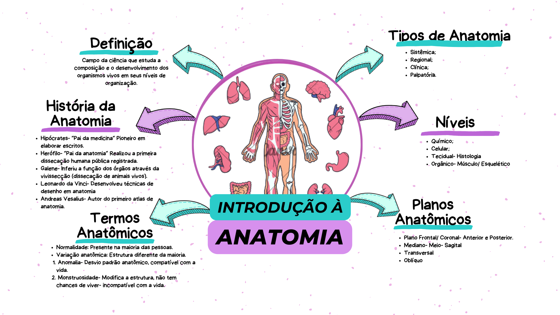 <p>Tipos de Anatomia Definição Sistêmica; Campo da ciência que estuda a Regional; composição e desenvolvimento dos Clínica; organismos vivos em seus níveis de Palpatória. organização. História da Anatomia Níveis Hipócrates- "Pai da medicina" Pioneiro em elaborar escritos. Celular; Herófilo- "Pai da anatomia" Realizou a primeira Tecidual- Histologia dissecação humana pública registrada. Orgânico- Músculo/ Esquelético Galene- Inferiu a função dos órgãos através da (dissecação de animais vivos). Leonardo da Vinci- Desenvolveu técnicas de desenho em anatomia Andreas Vesalius- Autor do primeiro atlas de anatomia. INTRODUÇÃO À Planos Termos Anatômicos Anatômicos ANATOMIA Plano Frontal/ Coronal- Anterior e Posterior. Normalidade: Presente na majoria das pessoas. Mediano- Meio- Sagital Variação Estrutura diferente da Transversal 1. Anomalia- Desvio padrão anatômico, compatível com a Oblíquo vida. 2. Monstruosidade- Modifica a estrutura, não tem chances de viver- incompatível com a vida.</p>