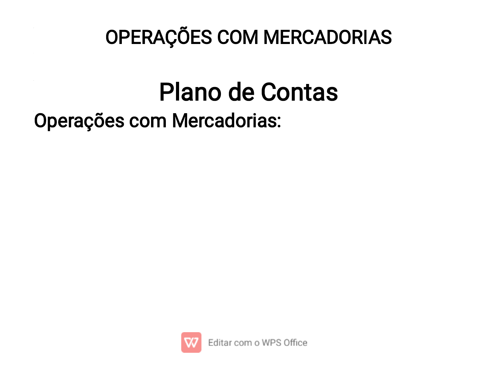 <p>OPERAÇÕES COM MERCADORIAS</p><p>Plano de Contas</p><p>Operações com Mercadorias:</p><p>Inventario Permanente.</p><p>Critérios de Avaliação de Estoques.</p><p>Deduções de vendas.</p><p>Impostos incidentes sobre compras e vendas.</p><p>Operações financeiras.</p><p>Folha de Pagamento.</p><p>Operações com Ativos Imobilizados.</p><p>Grupos de contas do Balanço Patrimonial e DRE</p><p>ProfªMe.Geysa Medeiros Olimpio</p><p>OPERAÇÕES COM MERCADORIAS</p><p>ProfªMe.Geysa Medeiros Olimpio</p><p>FIGURA 01 : MERCADORIAS</p><p>FIGURA 02 : INVENTÁRIO 02</p><p>Fonte:https://www.google.com.br/search?biw=1025&bih=476&tbm</p><p>Fonte:https://www.google.com.br/search?biw=1025&bih=476&tbm</p><p>Conteúdo Programático :�</p><p>a) Entender a definição de Mercadorias </p><p>b) Tipos de Inventário : Inventário Periódico</p><p>e Inventário Permanente</p><p>Relação do Inventário com o registro</p><p>c) Relação do Inventário com o registro</p><p>na contabilidade na contabilidade </p><p>ProfªMe.Geysa Medeiros Olimpio</p><p>Conhecer a utilização</p><p>dos inventários e seus</p><p>critérios de avaliação;</p><p>Aplicar a aprendizagem dos</p><p>tipos de inventário com a</p><p>contabilidade nas empresas.</p><p>Compreender as transações</p><p>comerciais</p><p>OBJETIVOS DA</p><p>DISCIPLINA</p><p>OPERAÇÕES COM MERCADORIAS</p><p>Operações com Mercadorias ��</p><p>�</p><p>• Transações comerciais</p><p>ProfªMe.Geysa Medeiros Olimpio</p><p> Compra: obtenção de</p><p>propriedade</p><p> Venda: transferência de</p><p>propriedade (tradição)</p><p>◘</p><p>◘</p><p>◘</p><p>Comércio: compra e vende mercadorias</p><p>Indústria: adquire insumos, transforma-os em produtos</p><p>e os vende</p><p>Serviços: disponibiliza, presta e comercializa serviços</p><p>Inventário: Conceito e Finalidades�</p><p>ProfªMe.Geysa Medeiros Olimpio</p><p>FIGURA 03 : INVENTÁRIO 03</p><p>Fonte:https://www.google.com.br/search?biw=1025&bih=476&tbm</p><p>FIGURA 04 : INVENTÁRIO 04</p><p>FIGURA 05:INVENTÁRIO 05</p><p>Tipos de Inventário �</p><p>ProfªMe.Geysa Medeiros Olimpio</p><p>INVENTÁRIO</p><p>PERMANENTE</p><p>√ “ N o s i s t e m a d e</p><p>Inventário Periódico, o</p><p>controle de estoque será</p><p>re a l izado at ravé s da</p><p>consulta das úl t imas</p><p>notas f iscais de compra</p><p>no f ina l do e xe rcício</p><p>socia l , obse r vando o</p><p>critério do PEPS”.</p><p>INVENTÁRIO</p><p>PERIÓDICO</p><p>√</p><p>“No sistema de Inventário</p><p>Permanente , o controle de</p><p>estoque será feito mediante</p><p>consulta às respectivas</p><p>Fichas, com critérios</p><p>adotados pela empresa(PEPS,</p><p>Média Ponderada Móvel e</p><p>UEPS)”, em períodos</p><p>determinados pela empresa</p><p>(mensal,semestral ou anual).</p><p>Conforme RIBEIRO (2017):</p><p>ProfªMe.Geysa Medeiros Olimpio</p><p>Métodos de</p><p>contabilização</p><p> Conta Mista Mercadorias (CMM)</p><p> Conta “Mercadorias” com função desdobrada</p><p>CMV = EI + CL - EF</p><p>RCM = V - CMV</p><p> Inventário periódico</p><p>ProfªMe.Geysa Medeiros Olimpio</p><p> Inventário periódico</p><p>ProfªMe.Geysa Medeiros Olimpio</p><p> Inventário periódico</p><p>EMPRESAS COMERCIAIS :</p><p>C u s t o d a Me r c a d o r i a V e n d i d a ( C MV )</p><p>( + ) E s t o q u e i n i c i a l</p><p>( + ) c o mp r a s d e me r c a d o r i a s</p><p>( + ) A d i ç õ e s s o b r e c o mp r a s</p><p>( - ) E x c l u s õ e s s o b r e c o mp r a s</p><p>( - ) E s t o q u e f i n a l</p><p>Figura 01: Cálculo do CMV</p><p>Fonte: RIBEIRO, Osni Moura. Contabilidade Básica</p><p>EMPRESAS COMERCIAIS :</p><p>OPERAÇÕES COM COMPRAS</p><p>DE MERCADORIAS:</p><p>Compras à vista</p><p>D - 4.1.01.007 Compras de Mercadoria 2.500,00</p><p>C - 1.1.01.001 Caixa 2.500,00</p><p>Compra de mercadoria a prazo</p><p>D - 4.1.01.007 Compras de Mercadorias 2.500,00</p><p>C - 2.2.01.001 Fornecedores 2.500,00</p><p>EMPRESAS COMERCIAIS :</p><p>O estoque f inal foi apurado por meio de contagem física</p><p>no final do período no valor de R$ 3.500,00.</p><p>Empresa Comercio Alfa Ltda - 31 de Janeiro de 20x2</p><p>Fonte: RIBEIRO, Osni Moura. Contabilidade Básica</p><p>Figura 02: DRE</p><p>EMPRESAS COMERCIAIS :</p><p>APURAÇÃO</p><p>Com o sistema de inventário periódico, tornam-se necessários os</p><p>seguintes procedimentos contábeis, no que tange às mercadorias:</p><p>a) Transferir estoque inicial para CMV (valor do estoque no</p><p>balanço inicial)</p><p>D - 3.1.01.001 CMV</p><p>C - 1.1.04.001 Estoque de Mercadorias</p><p>CMV = EI + C – EF</p><p>RCM = V - CMV</p><p>EMPRESAS COMERCIAIS :</p><p>LANÇAMENTOS CONTÁBEIS</p><p>b) Transferir compras e fretes para o CMV</p><p>D - 3.1.01.001 CMV</p><p>C - 3.3.01.002 Compras</p><p>C - 3.3.01.005 Fretes sobre Compras</p><p>c) Transferir adições sobre compras para CMV</p><p>D - 3.1.01.001 CMV</p><p>C - 3.3.01.003 Adições sobre Compras</p><p>EMPRESAS COMERCIAIS :</p><p>LANÇAMENTOS CONTÁBEIS</p><p>CONTABILIZAÇÃO DO RCM</p><p>a) Transferir o valor das vendas para o RCM (Resultado</p><p>conta mercadoria)</p><p>D - 3.1.01.001 Vendas de Mercadorias</p><p>C - 3.1.01.002 RCM</p><p>RCM = V - CMV</p><p>EMPRESAS COMERCIAIS :</p><p>LANÇAMENTOS CONTÁBEIS</p><p>CONTABILIZAÇÃO DO RCM</p><p>b) Transferir o valor do RCM (Resultado conta mercadoria)</p><p>para o CMV.</p><p>D - 3.1.01.002 RCM</p><p>C - 3.1.01.001 CMV</p><p>RCM = V - CMV</p><p>EMPRESAS COMERCIAIS :</p><p>LANÇAMENTOS CONTÁBEIS</p><p>CONTABILIZAÇÃO DO RCM</p><p>c) Resultado do período:</p><p>D - 3.1.01.002 RCM</p><p>C - 2.1.01.001 Lucro Bruto</p><p>OU</p><p>D - 2.1.01.002 Prejuízo sobre vendas</p><p>C - 3.1.01.002 RCM</p><p>RCM = V - CMV</p><p>Critérios de Avaliação dos Estoques �</p><p>ProfªMe.Geysa Medeiros Olimpio</p><p></p><p></p><p></p><p></p><p>O inventário periódico é permitido também pela legislação do imposto de renda</p><p>É o mais usado pelas empresas de pequeno porte: EPP e ME.<