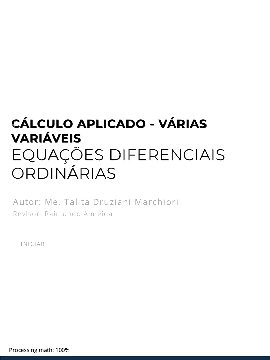 <p>23/04/2023, 21:52 Ead.br</p><p>https://ambienteacademico.com.br/mod/url/view.php?id=760622 1/30</p><p>CÁLCULO APLICADO - VÁRIASCÁLCULO APLICADO - VÁRIAS</p><p>VARIÁVEISVARIÁVEIS</p><p>EQUAÇÕES DIFERENCIAISEQUAÇÕES DIFERENCIAIS</p><p>ORDINÁRIASORDINÁRIAS</p><p>Autor: Me. Talita Druziani Marchiori</p><p>Revisor : Ra imundo A lmeida</p><p>IN IC IAR</p><p>Processing math: 100%</p><p>23/04/2023, 21:52 Ead.br</p><p>https://ambienteacademico.com.br/mod/url/view.php?id=760622 2/30</p><p>introdução</p><p>Introdução</p><p>Nesta unidade iremos trabalhar com equações diferenciais ordinárias, ou</p><p>seja, com equações que envolvem derivadas simples de uma única variável</p><p>independente.</p><p>Começaremos nos familiarizando com os conceitos de uma equação</p><p>diferencial. Depois, vamos de�nir quais equações representam a classe das</p><p>equações separáveis, equações lineares de 1ª ordem e equações homogêneas</p><p>com coe�cientes constantes de 2ª ordem.</p><p>Como veremos, equações homogêneas de 2ª ordem são um caso particular</p><p>de equações lineares de 2ª ordem, logo sua resolução pode ser realizado por</p><p>um método similar a resolução de equações lineares de 1ª ordem.</p><p>Esperamos que você aproveite ao máximo este conteúdo. Resolva os</p><p>exemplos e exercícios e não esqueça de perguntar suas dúvidas. Bons</p><p>estudos!</p><p>Processing math: 100%</p><p>23/04/2023, 21:52 Ead.br</p><p>https://ambienteacademico.com.br/mod/url/view.php?id=760622 3/30</p><p>Até o momento, dada uma função y = f(x) sabemos determinar sua derivada</p><p>em relação a x, que é também uma função, e denotamos por</p><p>dy</p><p>dx = f′(x). Por</p><p>exemplo, se y = ex</p><p>2</p><p>a regra da cadeia nos diz que</p><p>dy</p><p>dx = 2x ex</p><p>2</p><p>= 2xy. Nesta</p><p>unidade, vamos ter uma equação da forma</p><p>dy</p><p>dx = 2xy e vamos desejar encontrar</p><p>qual função f(x) a satisfaça.</p><p>Toda equação que possui derivadas de uma ou mais variáveis dependentes,</p><p>em relação a uma ou mais variáveis independentes é denominada equação</p><p>diferencial. Quando a equação diferencial envolve somente derivadas com</p><p>relação a uma única variável independente, ela é classi�cada como uma</p><p>equação diferencial ordinária. Muitas vezes, para simpli�car notação,</p><p>denotamos as equações diferenciais ordinárias por EDO.</p><p>As equações,</p><p>1.</p><p>dy</p><p>dt − 5y = 1;</p><p>2. (y − x) dx + 4x dy = 0;</p><p>Introdução às EquaçõesIntrodução às Equações</p><p>Diferenciais Ordinárias.Diferenciais Ordinárias.</p><p>Processing math: 100%</p><p>23/04/2023, 21:52 Ead.br</p><p>https://ambienteacademico.com.br/mod/url/view.php?id=760622 4/30</p><p>3.</p><p>du</p><p>dx −</p><p>dv</p><p>dx = x;</p><p>4.</p><p>d2y</p><p>dx2 − 2</p><p>dy</p><p>dx + 6y = 0</p><p>são exemplos de equações diferenciais ordinárias.</p><p>A ordem de uma EDO é de�nida como a ordem da derivada de maior ordem.</p><p>Logo,</p><p>dy</p><p>dt − 5y = 1 é de primeira ordem e</p><p>d2y</p><p>dx2 − 2</p><p>dy</p><p>dx + 6y = 0 é de segunda ordem.</p><p>Uma EDO é chamada de linear se pode escrevê-la da forma:</p><p>an(x)</p><p>dny</p><p>dxn</p><p>+ a (n− 1 ) (x)</p><p>d (n− 1 )y</p><p>dx (n− 1 ) + . . . + a0(x) y = g(x)</p><p>onde os coe�cientes a0 , a1, . . . , an e g são funções que dependem somente</p><p>da variável independente x. Quando a EDO não é linear, chamamo-a de não-</p><p>linear.</p><p>Por exemplo, x2</p><p>d2y</p><p>dx2 − 3x</p><p>dy</p><p>dx + 4y = 0 é uma equação diferencial ordinária linear</p><p>de segunda ordem linear onde a2(x) = x2, a1(x) = − 3x , a0(x) = 4 e g(x) = 0. Já a</p><p>equação diferencial ordinária de terceira ordem</p><p>d3y</p><p>dx3 + 2ex</p><p>d2y</p><p>dx2 + y</p><p>dy</p><p>dx = 0 é não-</p><p>linear pois o coe�ciente a1 = y é uma função da variável dependente y.</p><p>Qualquer função f de�nida em um intervalo I, que quando substituída na</p><p>EDO, reduz a equação a uma identidade é uma solução para EDO no intervalo</p><p>I. Então, pelo que vimos acima, f(x) = ex2 + 2 e g(x) = ex2 − 10 são soluções para</p><p>a equação</p><p>dy</p><p>dx = 2xy no intervalo (−∞, ∞).</p><p>Observe que y(x) = ex</p><p>2</p><p>+ C, onde C é uma constante qualquer também é uma</p><p>solução para</p><p>dy</p><p>dx = 2xy no intervalo (−∞, ∞). As soluções f e g, mencionadas no</p><p>parágrafo acima, são ditas soluções particulares. Já y é conhecida como</p><p>solução geral, pois abrange todas as soluções da equação diferencial. Com</p><p>isso, vemos que uma equação diferencial pode possuir mais que uma solução</p><p>e que estas soluções se diferem apenas por uma constante.</p><p>Processing math: 100%</p><p>23/04/2023, 21:52 Ead.br</p><p>https://ambienteacademico.com.br/mod/url/view.php?id=760622 5/30</p><p>Chamamos de problema de valor inicial todo problema composto por uma</p><p>equação diferencial e o valor da função procurada em um determinado</p><p>ponto. Este ponto é denominado valor inicial. Por exemplo,</p><p>dy</p><p>dx = 2xy ; y(1) = e</p><p>é um problema de valor inicial com valor inicial igual a 1. Como acabamos de</p><p>ver, y(x) = ex</p><p>2</p><p>+ C é uma solução da equação</p><p>dy</p><p>dx = 2xy, onde C é uma constante</p><p>qualquer. Porém, como neste caso, temos a condição de y(1) = e, isso implica</p><p>que, C = 0. Então, a solução deste problema é dada pela função y(x) = ex2</p><p>.</p><p>Como temos um valor determinado no enunciado do problema, temos que a</p><p>solução de um problema de valor inicial é única, caso exista.</p><p>Processing math: 100%</p><p>23/04/2023, 21:52 Ead.br</p><p>https://ambienteacademico.com.br/mod/url/view.php?id=760622 6/30</p><p>reflita</p><p>Re�ita</p><p>Frequentemente, desejamos descrever situações através de</p