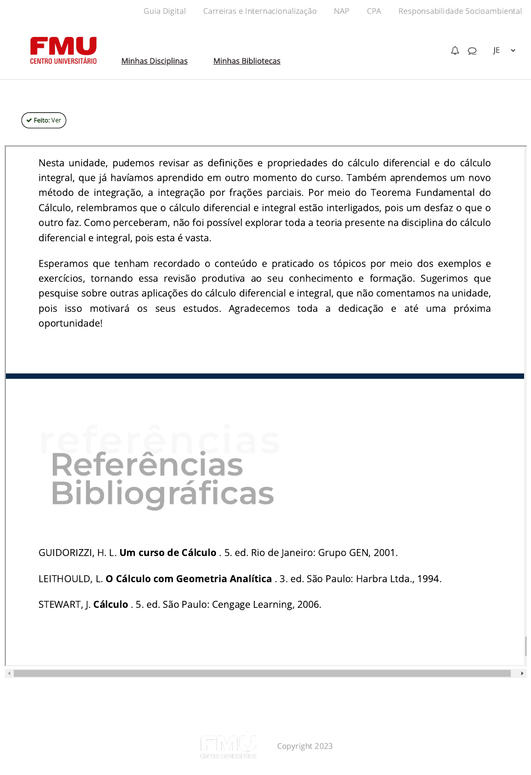 <p>13/03/2023, 21:12 231GGR0551A: Unidade 1</p><p>https://ambienteacademico.com.br/mod/url/view.php?id=760586 1/2</p><p>Nesta unidade, pudemos revisar as de�nições e propriedades do cálculo diferencial e do cálculo</p><p>integral, que já havíamos aprendido em outro momento do curso. Também aprendemos um novo</p><p>método de integração, a integração por frações parciais. Por meio do Teorema Fundamental do</p><p>Cálculo, relembramos que o cálculo diferencial e integral estão interligados, pois um desfaz o que o</p><p>outro faz. Como perceberam, não foi possível explorar toda a teoria presente na disciplina do cálculo</p><p>diferencial e integral, pois esta é vasta.</p><p>Esperamos que tenham recordado o conteúdo e praticado os tópicos por meio dos exemplos e</p><p>exercícios, tornando essa revisão produtiva ao seu conhecimento e formação. Sugerimos que</p><p>pesquise sobre outras aplicações do cálculo diferencial e integral, que não comentamos na unidade,</p><p>pois isso motivará os seus estudos. Agradecemos toda a dedicação e até uma próxima</p><p>oportunidade!</p><p>referências</p><p>Referências</p><p>Bibliográ�cas</p><p>GUIDORIZZI, H. L. Um curso de Cálculo . 5. ed. Rio de Janeiro: Grupo GEN, 2001.</p><p>LEITHOULD, L. O Cálculo com Geometria Analítica . 3. ed. São Paulo: Harbra Ltda., 1994.</p><p>STEWART, J. Cálculo . 5. ed. São Paulo: Cengage Learning, 2006.</p><p>Copyright 2023</p><p> Feito: Ver</p><p>Guia Digital Carreiras e Internacionalização NAP CPA Responsabilidade Socioambiental</p><p>Minhas Disciplinas Minhas Bibliotecas</p><p> JE </p><p>https://ambienteacademico.com.br/</p><p>https://codely-fmu-content.s3.amazonaws.com/Moodle/GuiaDigital/Guia+digital/index.html</p><p>https://carreiras.fmu.br/</p><p>https://codely-fmu-content.s3.amazonaws.com/Moodle/NAP/inicial/nap/fmu/index.html</p><p>https://codely-fmu-content.s3.amazonaws.com/Moodle/CPA/landing_CPA/index.html</p><p>https://portal.fmu.br/sustentabilidade</p><p>https://ambienteacademico.com.br/</p><p>https://ambienteacademico.com.br/</p><p>https://ambienteacademico.com.br/course/view.php?id=236</p><p>13/03/2023, 21:12 231GGR0551A: Unidade 1</p><p>https://ambienteacademico.com.br/mod/url/view.php?id=760586 2/2</p><p>Guia Digital Carreiras e Internacionalização NAP CPA Responsabilidade Socioambiental</p><p>Minhas Disciplinas Minhas Bibliotecas</p><p> JE </p><p>https://codely-fmu-content.s3.amazonaws.com/Moodle/GuiaDigital/Guia+digital/index.html</p><p>https://carreiras.fmu.br/</p><p>https://codely-fmu-content.s3.amazonaws.com/Moodle/NAP/inicial/nap/fmu/index.html</p><p>https://codely-fmu-content.s3.amazonaws.com/Moodle/CPA/landing_CPA/index.html</p><p>https://portal.fmu.br/sustentabilidade</p><p>https://ambienteacademico.com.br/</p><p>https://ambienteacademico.com.br/</p><p>https://ambienteacademico.com.br/course/view.php?id=236</p>