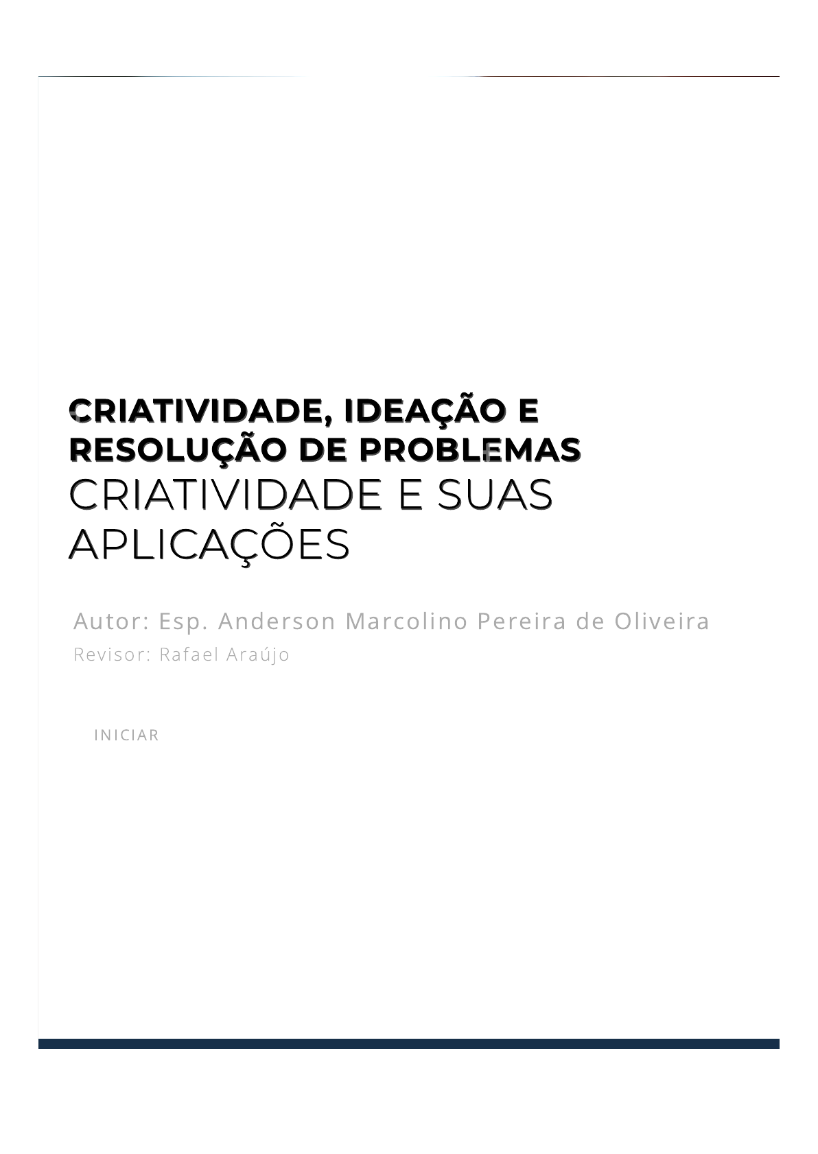<p>17/10/22, 20:46 Ead.br</p><p>https://ambienteacademico.com.br/course/view.php?id=18302 1/35</p><p>CRIATIVIDADE, IDEAÇÃO ECRIATIVIDADE, IDEAÇÃO E</p><p>RESOLUÇÃO DE PROBLEMASRESOLUÇÃO DE PROBLEMAS</p><p>CRIATIVIDADE E SUASCRIATIVIDADE E SUAS</p><p>APLICAÇÕESAPLICAÇÕES</p><p>Autor: Esp. Anderson Marcolino Pereira de Oliveira</p><p>Revisor : Rafae l Araújo</p><p>IN IC IAR</p><p>17/10/22, 20:46 Ead.br</p><p>https://ambienteacademico.com.br/course/view.php?id=18302 2/35</p><p>introdução</p><p>Introdução</p><p>Caro estudante, vamos iniciar agora uma jornada nos princípios da</p><p>criatividade, veri�cando como ela impacta a produção de conteúdo no mundo</p><p>globalizado atual e como o estudo sistematizado do assunto vem contribuindo</p><p>para que as organizações obtenham sucesso, baseadas na elaboração de um</p><p>insumo fundamental nos dias de hoje: inovação.</p><p>A disciplina irá apresentar os princípios e as de�nições de criatividade,</p><p>especialmente diferenciando-os das de�nições de inovação, conceitos que se</p><p>assemelham em certos pontos, mas que são diferentes em sua essência.</p><p>Também faz parte do escopo descrever o processo criativo, identi�cando como</p><p>os grandes mestres da criatividade produzem seus inventos.</p><p>Em seguida, apresentaremos as aplicações das teorias da criatividade para</p><p>solucionar problemas e como os resultados podem ser melhorados conforme</p><p>o uso de soluções inovadoras. Por �m, apresentaremos as aplicações das</p><p>técnicas de promoção da criatividade, para impulsionar o desenvolvimento do</p><p>potencial empreendedor das pessoas, e o impacto que esses</p><p>empreendimentos causam na economia.</p><p>Como diria Steve Jobs (1955-2011), uma das mentes mais criativas do século</p><p>20, a “Criatividade é a arte de conectar ideias”.</p><p>Vamos conectar as ideias juntos?</p><p>17/10/22, 20:46 Ead.br</p><p>https://ambienteacademico.com.br/course/view.php?id=18302 3/35</p><p>O mercado global está em constante transformação. Isso é resultado do</p><p>impacto causado pela 4ª Revolução Industrial, também conhecida como “Era da</p><p>informação”. Partindo desse contexto, o conhecimento e a informação são,</p><p>sim, os ativos mais relevantes neste processo de reformulação para atender às</p><p>demandas de um mercado cada vez mais exigente com a qualidade dos</p><p>produtos e conhecedor de suas vontades e necessidades. O consumo de</p><p>produtos oriundos diretamente do sistema produtivo atual tende a se</p><p>extinguir. Você não ouviu errado. No futuro, todos seremos capazes de</p><p>comprar produtos feitos exclusivamente para nós.</p><p>Entretanto, para atender à necessidade desesperada de criar novos produtos e</p><p>novas soluções, é preciso uma das características mais importantes da psique</p><p>humana: a criatividade! Apesar de parecer ser um tema recente, a capacidade</p><p>de criar já era estudada muito antes de qualquer desenvolvimento industrial,</p><p>remetendo-nos aos tempos antigos, em que os �lósofos já divagavam sobre o</p><p>assunto. Naquela época, especulava-se que a criatividade estaria associada a</p><p>um dom, algo que seria inato ao ser com a capacidade de criar.</p><p>Criatividade – De�niçõesCriatividade – De�nições</p><p>17/10/22, 20:46 Ead.br</p><p>https://ambienteacademico.com.br/course/view.php?id=18302 4/35</p><p>Os estudos recentes ampliaram o conceito de criatividade, desconstruindo a</p><p>ideia de algo divino para algo mais palpável, em que todos nós possuímos a</p><p>capacidade de inventar, reinventar e inovar. Porém, tais quais as demais</p><p>competências que adquirimos, precisamos nos desenvolver para construir um</p><p>ambiente propício para acordar nosso potencial criativo.</p><p>As grandes mentes da humanidade possuem algumas características em</p><p>comum que as diferem das outras, aumentando consideravelmente seu</p><p>potencial criativo: um repertório diverso e recursos para acessá-los sempre</p><p>que possível, como um quebra-cabeças: montar e desmontar as peças faz com</p><p>que a construção seja mais rápida, acessando novos métodos para construí-lo</p><p>mais e�cazmente. Fazendo e refazendo, aprendemos a fazer melhor, mais</p><p>rápido e, o fator mais importante no mundo corporativo atual, de maneira</p><p>mais barata.</p><p>Em resumo, a criatividade é uma habilidade inata ao ser humano que está</p><p>intimamente ligada à nossa capacidade de resolver nossos dilemas de maneira</p><p>inventiva e inovadora. Como qualquer habilidade, pode ser ensinada, treinada</p><p>e praticada para inspirar a produção de soluções, no intuito de nos tornarmos</p><p>mais criativos.</p><p>História da Criatividade</p><p>De�nir com clareza o que é criatividade não é uma das tarefas mais simples,</p><p>visto que toda de�nição restringe a abrangência de uma determinada coisa,</p><p>resumindo demais e empobrecendo seu signi�cado. Podemos nos debruçar</p><p>sobre trabalhos de muitos estudiosos acerca do assunto, mas várias polêmicas</p><p>ainda residirão em nossas cabeças, visto que muitas das de�nições são, até</p><p>certo ponto, controversas. Não é de hoje que os estudos sobre a criatividade</p><p>vêm sendo tema recorrente na vida de �lósofos, psicólogos, sociólogos e, mais</p><p>recentemente, estudiosos sobre as relações humanas e as organizações, e tem</p><p>sido proposto que a criatividade está associada à capacidade cognitiva do ser,</p><p>mesmo que ainda não haja convergência de todos sobre essa possibilidade</p><p>(SOUZA, 2014).</p><p>17/10/22, 20:46 Ead.br</p><p>https://ambienteacademico.com.br/course/view.php?id=18302 5/35</p><p>Diante desse cenário, apresentaremos alguns dos contextos históricos sobre o</p><p>tema, para construirmos as nossas próprias de�nições sobre o que é</p><p>criatividade (SOUZA, 2014).</p><p>Grécia antiga</p><p>