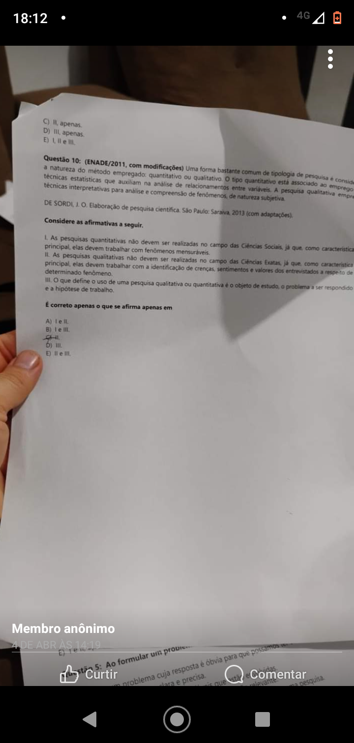 <p>C) D) Questão 10: (ENADE/2011, com modificações) Uma forma bastante comum de tipologia de pesquisa é conside a natureza do método quantitativo ou tipo quantitativo está associado ao emprego técnicas estatísticas que auxiliam na de relacionamentos entre A pesquisa qualitativa técnicas interpretativas para e compreensão de de natureza DE Elaboração de pesquisa São 2013 (com adaptações). Considere as afirmativas a seguir. 1. As pesquisas quantitativas não devem ser realizadas no campo das Sociais, já que como caracteristica elas devem trabalhar com As pesquisas qualitativas não devem ser realizadas no campo das Ciências já que, como caracteristica de elas devem trabalhar com a identificação de sentimentos e valores dos entrevistados a respeito determinado o que define uso de uma pesquisa qualitativa ou quantitativa é objeto de problema a ser respondido e a hipótese de correto apenas o que se afirma apenas em A) IL B) D) III. E) III. Membro anônimo DE ABR ÀS 14 19 Curtir 5: formular problema um cuja Jara resposta e precisa. obvia que para que Comentar possamos Y</p>
