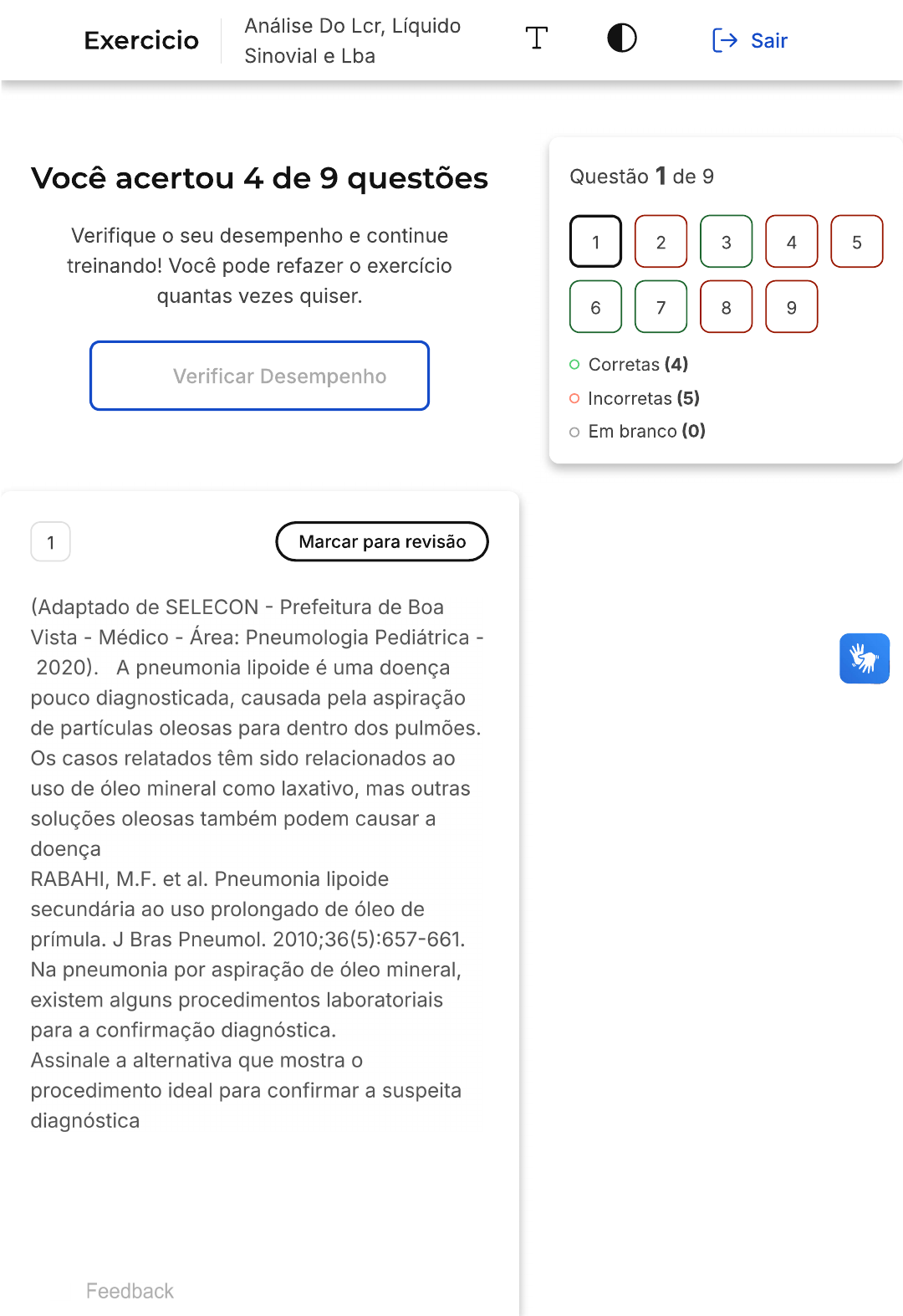 <p>Análise Do Lcr, Líquido Exercicio T Sair Sinovial e Lba Você acertou 4 de 9 questões Questão 1 de 9 Verifique o seu desempenho e continue 1 2 3 4 5 treinando! Você pode refazer o exercício quantas vezes quiser. 6 7 8 9 Corretas (4) Verificar Desempenho Incorretas (5) Em branco (0) 1 Marcar para revisão (Adaptado de SELECON - Prefeitura de Boa Vista Médico - Área: Pneumologia Pediátrica 2020). A pneumonia lipoide é uma doença pouco diagnosticada, causada pela aspiração de partículas oleosas para dentro dos pulmões. Os casos relatados têm sido relacionados ao uso de óleo mineral como laxativo, mas outras soluções oleosas também podem causar a doença RABAHI, M.F. et al. Pneumonia lipoide secundária ao uso prolongado de óleo de prímula. J Bras Pneumol. 2010;36(5):657-661. Na pneumonia por aspiração de óleo mineral, existem alguns procedimentos laboratoriais para a confirmação diagnóstica. Assinale a alternativa que mostra o procedimento ideal para confirmar a suspeita diagnóstica Feedback</p><p>Aspecto macroscópico do LBA que A apresenta uma coloração transparente Broncoscopia para coleta do lavado B broncoalveolar e avaliação apenas da citometria global e específica Broncoscopia para coleta do lavado broncoalveolar e avaliação C citoquímicas pela coloração com Sudan Broncoscopia para coleta do lavado D broncoalveolar e avaliação citoquímica pela coloração com Pearls Exame de imagem do paciente e E aspecto macroscópico do LBA com avaliação apenas da citometria global Resposta correta Parabéns, você selecionou a alternativa correta. Confira o gabarito comentado! Gabarito Comentado A pneumonia lipoide, causada pela aspiração de partículas oleosas para dentro dos pulmões, é uma doença que muitas vezes é tratada com antibioticoterapia sem resposta, devido à dificuldade de diagnóstico. Para confirmar a suspeita diagnóstica, o procedimento ideal é a broncoscopia para coleta do lavado broncoalveolar e avaliação citoquímicas pela coloração com Sudan. Este procedimento permite a demonstração</p><p>das partículas de óleo no lavado broncoalveolar com coloração específica para gorduras. A contagem da citologia global e específica e a coloração de Pearls, que é utilizada para demonstrar a presença de sais férricos, pouco auxiliam na definição do diagnóstico. exame de imagem, por sua vez, permitirá o diagnóstico de pneumonia, mas não mostrará a causa, não confirmando assim a suspeita diagnóstica. 2 Marcar para revisão (Adaptado de NC-UFPR - 2019) No líquido sinovial, um dos exames mais importantes é a identificação microscópica de cristais, usados no diagnóstico de artrite. Em casos de Osteoartrite, podem ser encontrados cristais de: A Urato monossódico B Pirofosfato de cálcio C Colesterol D Hidroxiapatita E Oxalato de cálcio X Resposta incorreta</p><p>Opa! A alternativa correta é a letra D. Confira gabarito comentado! Gabarito Comentado A Osteoartrite, também conhecida como artrose, é caracterizada pelo desgaste da cartilagem articular, onde é comum a presença de cristais de hidroxiapatita no líquido sinovial. É importante destacar que os cristais de urato monossódico são geralmente observados em pacientes com Gota, e os cristais de pirofosfato de cálcio são encontrados em pacientes com diagnóstico de pseudogota. A presença de cristais de colesterol está associada a patologias extracelulares, enquanto os cristais de oxalato de cálcio são comumente vistos em pacientes que passam por diálise renal. Portanto, a alternativa correta é a "D", que menciona os cristais de hidroxiapatita, comumente encontrados em casos de Osteoartrite. 3 Marcar para revisão (Adaptado de Instituto Ludus - Prefeitura de Presidente Dutra - MA/ 2012) O líquido sinovial é um ultrafiltrado do plasma, enriquecido com moléculas de alto peso molecular, ricas em sacarídeos, sendo a mais importante, o hialuronato, produzido pelas células sinoviais (sinoviócitos tipo B fibroblastos-like). A formação do líquido sinovial ocorre de forma idêntica ao dos outros fluidos intersticiais. O fluxo de líquido plasmático atravessa a parede capilar condicionado pela diferença de pressão nesta e no meio exterior, segundo a lei de</p><p>Starling ou gradiente de pressão coloidosmótica. líquido sinovial apresenta várias funções, a seguir são listadas algumas funções desse líquido. Assinale a alternativa que contenha as duas funções do líquido sinovial. Permitir a articulação os movimentos A de deslizar ou escorregar e evitar artrose B Evitar artrose C Evitar artrose e nutrir a articulação D Evitar artrose e lubrificar a articulação E Lubrificar e nutrir a cartilagem sinovial Resposta correta Parabéns, você selecionou a alternativa correta. Confira o gabarito comentado! Gabarito Comentado líquido sinovial, um ultrafiltrado do plasma enriquecido com moléculas de alto peso molecular, como o hialuronato, desempenha várias funções essenciais para o bom funcionamento das articulações. Entre essas funções, duas se destacam: a lubrificação e a nutrição da cartilagem sinovial. A lubrificação é fundamental para minimizar o atrito entre as articulações, permitindo movimentos suaves e sem dor. Já a nutrição é</p><p>responsável por fornecer os nutrientes necessários para a manutenção e saúde da cartilagem sinovial. Portanto, a alternativa que corretamente identifica essas duas funções é a alternativa E: "Lubrificar e nutrir a cartilagem sinovial". 4 Marcar para revisão (Adaptado de EEAR - Aeronáutica - EAGS/2021). O líquido cefalorraquidiano pode ser obtido através de punção lombar, punção cisternal e punção cervical lateral por cânulas ventriculares. Em geral, as amostras são divididas em três tubos. Marque a alternativa que indica a sequência correta dessa distribuição. Estudos químicos e imunológicos, A exame microbiológico, contagem celular e diferencial. Exame m