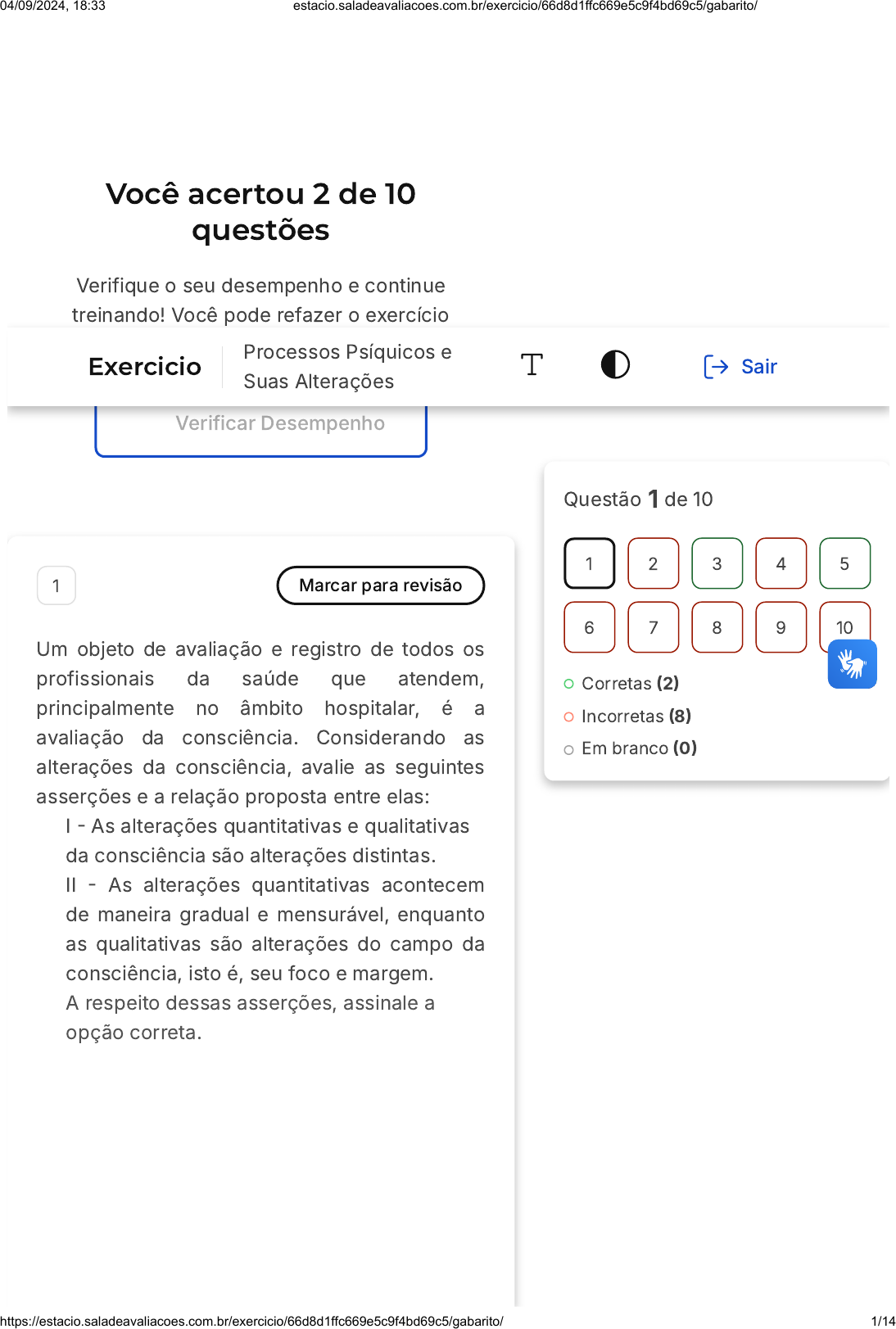 <p>Você acertou 2 de 10</p><p>questões</p><p>Verifique o seu desempenho e continue</p><p>treinando! Você pode refazer o exercício</p><p>quantas vezes quiser.</p><p>Verificar Desempenho</p><p>1 Marcar para revisão</p><p>Um objeto de avaliação e registro de todos os</p><p>profissionais da saúde que atendem,</p><p>principalmente no âmbito hospitalar, é a</p><p>avaliação da consciência. Considerando as</p><p>alterações da consciência, avalie as seguintes</p><p>asserções e a relação proposta entre elas:</p><p>I � As alterações quantitativas e qualitativas</p><p>da consciência são alterações distintas.</p><p>II � As alterações quantitativas acontecem</p><p>de maneira gradual e mensurável, enquanto</p><p>as qualitativas são alterações do campo da</p><p>consciência, isto é, seu foco e margem.</p><p>A respeito dessas asserções, assinale a</p><p>opção correta.</p><p>Questão 1 de 10</p><p>Corretas �2�</p><p>Incorretas �8�</p><p>Em branco �0�</p><p>1 2 3 4 5</p><p>6 7 8 9 10</p><p>Exercicio</p><p>Processos Psíquicos e</p><p>Suas Alterações</p><p>Sair</p><p>04/09/2024, 18:33 estacio.saladeavaliacoes.com.br/exercicio/66d8d1ffc669e5c9f4bd69c5/gabarito/</p><p>https://estacio.saladeavaliacoes.com.br/exercicio/66d8d1ffc669e5c9f4bd69c5/gabarito/ 1/14</p><p>A</p><p>B</p><p>C</p><p>D</p><p>E</p><p>As asserções I e II são proposições</p><p>verdadeiras, mas a II não é uma</p><p>justificativa da I.</p><p>A asserção I é uma proposição</p><p>verdadeira, e a II é uma proposição</p><p>falsa.</p><p>A asserção I é uma proposição falsa, e</p><p>a II é uma proposição verdadeira.</p><p>As asserções I e II são proposições</p><p>verdadeiras, e a II é uma justificativa</p><p>da I.</p><p>As asserções I e II são proposições</p><p>falsas.</p><p>Resposta incorreta</p><p>Opa! A alternativa correta é a letra</p><p>D. Confira o gabarito comentado!</p><p>Gabarito Comentado</p><p>A asserção I afirma que as alterações</p><p>quantitativas e qualitativas da consciência</p><p>são distintas, o que é verdadeiro. As</p><p>alterações quantitativas referem-se a</p><p>mudanças na quantidade de consciência,</p><p>como estar mais ou menos consciente,</p><p>enquanto as alterações qualitativas</p><p>referem-se a mudanças na natureza da</p><p>consciência, como alterações no foco ou</p><p>na margem da consciência. A asserção II,</p><p>que é uma justificativa da I, explica essas</p><p>diferenças de maneira mais detalhada,</p><p>afirmando que as alterações quantitativas</p><p>ocorrem de maneira gradual e mensurável,</p><p>04/09/2024, 18:33 estacio.saladeavaliacoes.com.br/exercicio/66d8d1ffc669e5c9f4bd69c5/gabarito/</p><p>https://estacio.saladeavaliacoes.com.br/exercicio/66d8d1ffc669e5c9f4bd69c5/gabarito/ 2/14</p><p>A</p><p>B</p><p>C</p><p>enquanto as qualitativas são alterações do</p><p>campo da consciência. Portanto, ambas as</p><p>asserções são verdadeiras e a II justifica a</p><p>I, o que torna a alternativa D a resposta</p><p>correta.</p><p>2 Marcar para revisão</p><p>O juízo é um elemento do pensamento que está</p><p>relacionado à capacidade que alguém tem de</p><p>julgar alguma coisa com eficiência de modo</p><p>subjetivo e cultural. Desta maneira, pode-se</p><p>afirmar que:</p><p>I � A característica principal do juízo</p><p>delirante é a função egossintônica, de modo</p><p>que as crenças são admissíveis aos valores</p><p>do sujeito.</p><p>PORQUE</p><p>II � Nos delírios, as ideias prevalentes não</p><p>são admissíveis para os valores do sujeito</p><p>que está alucinando.</p><p>A respeito dessas asserções, assinale a opção</p><p>correta.</p><p>As asserções I e II são proposições</p><p>verdadeiras, mas a II não é uma</p><p>justificativa da I.</p><p>A asserção I é uma proposição</p><p>verdadeira, e a II é uma proposição</p><p>falsa.</p><p>A asserção I é uma proposição falsa, e</p><p>a II é uma proposição verdadeira.</p><p>04/09/2024, 18:33 estacio.saladeavaliacoes.com.br/exercicio/66d8d1ffc669e5c9f4bd69c5/gabarito/</p><p>https://estacio.saladeavaliacoes.com.br/exercicio/66d8d1ffc669e5c9f4bd69c5/gabarito/ 3/14</p><p>D</p><p>E</p><p>As asserções I e II são proposições</p><p>verdadeiras, e a II é uma justificativa</p><p>da I.</p><p>As asserções I e II são proposições</p><p>falsas.</p><p>Resposta incorreta</p><p>Opa! A alternativa correta é a letra</p><p>A. Confira o gabarito comentado!</p><p>Gabarito Comentado</p><p>As asserções I e II são ambas verdadeiras.</p><p>A asserção I afirma que o juízo delirante é</p><p>egossintônico, ou seja, as crenças são</p><p>admissíveis aos valores do sujeito. Isso</p><p>significa que, no contexto de um delírio, o</p><p>indivíduo acredita firmemente em suas</p><p>percepções, mesmo que estas sejam</p><p>distorcidas ou não correspondam à</p><p>realidade. A asserção II, por sua vez, afirma</p><p>que, nos delírios, as ideias prevalentes não</p><p>são admissíveis para os valores do sujeito</p><p>que está alucinando. Isso pode ser</p><p>interpretado como a ideia de que o sujeito</p><p>não consegue reconhecer a irracionalidade</p><p>de suas crenças delirantes. No entanto, a</p><p>asserção II não justifica a I, pois são</p><p>conceitos que se referem a aspectos</p><p>diferentes do fenômeno delirante: a</p><p>admissibilidade das crenças delirantes para</p><p>o sujeito �I) e a inadmissibilidade das ideias</p><p>prevalentes para o sujeito que está</p><p>alucinando �II�. Portanto, embora ambas as</p><p>asserções sejam verdadeiras, uma não</p><p>justifica a outra.</p><p>04/09/2024, 18:33 estacio.saladeavaliacoes.com.br/exercicio/66d8d1ffc669e5c9f4bd69c5/gabarito/</p><p>https://estacio.saladeavaliacoes.com.br/exercicio/66d8d1ffc669e5c9f4bd69c5/gabarito/ 4/14</p><p>A</p><p>B</p><p>C</p><p>D</p><p>E</p><p>3 Marcar para revisão</p><p>A sensopercepção é a forma como uma pessoa</p><p>recebe e percebe os 