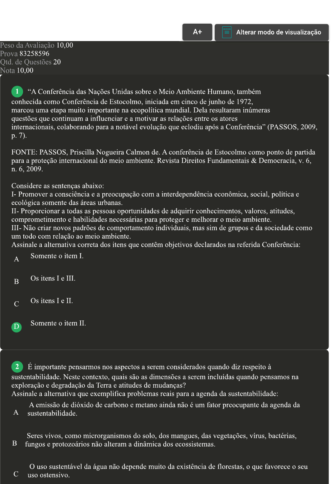 <p>A+ Alterar modo de visualização Peso da Avaliação 10,00 Prova 83258596 Qtd. de Questões 20 Nota 10,00 1 "A Conferência das Nações Unidas sobre Meio Ambiente Humano, também conhecida como Conferência de Estocolmo, iniciada em cinco de junho de 1972, marcou uma etapa muito importante na ecopolítica mundial. Dela resultaram inúmeras questões que continuam a influenciar e a motivar as relações entre os atores internacionais, colaborando para a notável evolução que eclodiu após a Conferência" (PASSOS, 2009, p. 7). FONTE: PASSOS, Priscilla Nogueira Calmon de. A conferência de Estocolmo como ponto de partida para a proteção internacional do meio ambiente. Revista Direitos Fundamentais & Democracia, 6, n. 6, 2009. Considere as sentenças abaixo: I- Promover a consciência e a preocupação com a interdependência econômica, social, política e ecológica somente das áreas urbanas. II- Proporcionar a todas as pessoas oportunidades de adquirir valores, atitudes, comprometimento e habilidades necessárias para proteger e melhorar meio ambiente. III- Não criar novos padrões de comportamento individuais, mas sim de grupos e da sociedade como um todo com relação ao meio ambiente. Assinale a alternativa correta dos itens que contêm objetivos declarados na referida Conferência: Somente item I. A Os itens I e III. B C Os itens I e II. Somente item II. D 2 É importante pensarmos nos aspectos a serem considerados quando diz respeito à sustentabilidade. Neste contexto, quais são as dimensões a serem incluídas quando pensamos na exploração e degradação da Terra e atitudes de mudanças? Assinale a alternativa que exemplifica problemas reais para a agenda da sustentabilidade: A emissão de dióxido de carbono e metano ainda não é um fator preocupante da agenda da A sustentabilidade. Seres vivos, como microrganismos do solo, dos mangues, das vegetações, vírus, bactérias, B fungos e protozoários não alteram a dinâmica dos ecossistemas. O uso sustentável da água não depende muito da existência de florestas, que favorece seu C uso ostensivo.</p><p>D Alteração da salinização dos oceanos e da composição química dos solos. 3 A análise do mercado é uma etapa de suma importância para a confecção do plano de negócios, uma vez que ela ajudará empreendedor.. Assinale a alternativa que completa corretamente a frase: A A estabelecer valor que poderá ser faturado. B A conhecer cliente e suas necessidades. C A definir ponto de equilíbrio financeiro. D A conhecer as condições financeiras da concorrência. 4 O ensino CTSA (Ciência, Tecnologia, Sociedade e Ambiente) surge como uma resposta ao aprofundamento de problemas ambientais na segunda metade do século XX e da tomada de consciência referente a questões éticas, à qualidade de vida da sociedade moderna e à necessidade de maior engajamento popular nas decisões de políticas públicas. A ciência e a tecnologia trouxeram várias frustrações, principalmente decorrentes da forte inclinação que os produtos tecnológicos e a pesquisa científica têm em relação às demandas de classes dominantes, com finalidades mercadológicas MORTIMER, 2002). FONTE: SANTOS, Wildson Luiz Pereira dos; MORTIMER, Eduardo Fleury. Uma análise de pressupostos teóricos da abordagem CTS no contexto da educação brasileira. Ensaio Pesquisa em educação em ciências, V. 2. n. 2, p. 1-23, 2002. Considere a relação entre a ciência e a tecnologia com as demandas da classe dominante e releia a última frase do trecho acima. Observe que a palavra "inclinação" está em destaque. Sob contexto desta frase, pode-se considerar que um exemplo de tal "inclinação" é: A prioridade concedida às pesquisas científicas e à produção de artefatos tecnológicos que A visam à lucratividade. A prioridade concedida às pesquisas científicas e à produção de artefatos tecnológicos que B visam à sustentabilidade. A prioridade concedida às pesquisas científicas e à produção de artefatos tecnológicos que visam C ao aumento da qualidade de vida. A prioridade concedida às pesquisas científicas e à produção de artefatos tecnológicos que D visam ao bem</p><p>5 A elaboração do plano de negócios visa criar uma oportunidade para empreendedor analisar todas as facetas da nova empresa e refletir sobre elas. Sobre os elementos que compõe plano de negócios, assinale V para verdadeiro e F para falso nas afirmações que seguem: A análise de mercado apresenta aspectos importantes sobre a clientela, a concorrência e os fornecedores. O planejamento financeiro visa diferenciar investimentos de despesas administrativas. O plano de marketing visa definir preço do serviço prestado ou da produção de determinado produto. Assinale a alternativa que apresenta a sequência correta de respostas: A V-V-V B F-V-V C V-F-V D F-V-F 6 A Educação Ambiental é constituída por conceitos que, muitas vezes, são usados de forma indiscriminada ou com significado incorreto. Um exemplo de confusão semântica existente dentro da área acontece com os conceitos de: preservação, conservação e recuperação. Com base nesta afirmação, assinale a alternativa que apresenta a definição correta do termo preservação. A Restabelecimento das características do ambiente original (de uma área que foi degradada). É a ação de proteger contra a destruição e qualquer forma de dano ou degradação um B ecossistema, uma área geográfica ou espécies animais e vegetais. É ressarcimento, para efeito de consertar ou atenuar dano causado à pessoa ou patrimônio, e, C no caso de dano ambiental, pode envolver a obrigação de recuperar ou reabilitar a área degradada. Uso apropriado do meio ambiente dentro dos limites capazes de manter sua qualidade e seu D equilíbrio em níveis aceitáveis. 7 "Um dos importantes argumentos de Beck é sua compreensão de que uma percepção "distorcida" dos riscos pode fazer com que sujeito, ao invés de ser