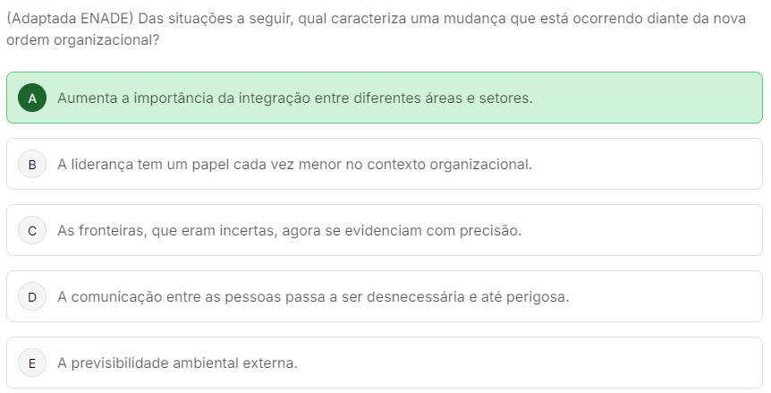 <p>(Adaptada ENADE) Das situações a seguir, qual caracteriza uma mudança que está ocorrendo diante da nova ordem organizacional? A Aumenta a importância da integração entre diferentes áreas e setores. B A liderança tem um papel cada vez menor no contexto organizacional. C As fronteiras, que eram incertas, agora se evidenciam com precisão. D A comunicação entre as pessoas passa a ser desnecessária e até perigosa. E A previsibilidade ambiental externa.</p>