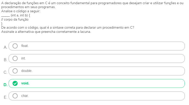 <p>A declaração de funções em C é um conceito fundamental para programadores que desejam criar e utilizar funções e ou procedimentos em seus programas. Analise código a seguir: (int a, int b) { // corpo da função } De acordo com qual é a sintaxe correta para declarar um procedimento em C? Assinale a alternativa que preencha corretamente a lacuna. A. B. int. C. double. D. void. E. char.</p>