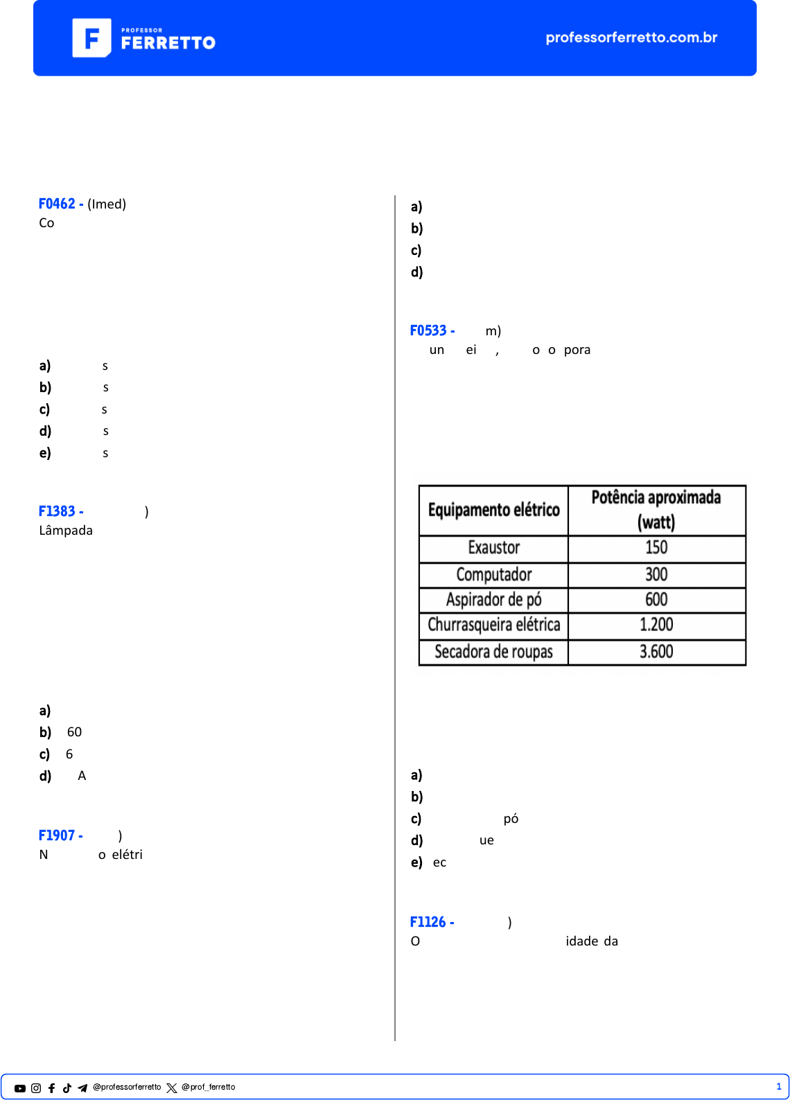 <p>Eletrodinâmica</p><p>Potência e Energia</p><p>F0462 - (Imed)</p><p>Considere uma bateria ideal de 12 V, na qual é ligada</p><p>uma lâmpada. Logo após ser ligada, a lâmpada a�nge um</p><p>brilho que não varia ao longo do tempo. Nesse estado, a</p><p>corrente elétrica que percorre a lâmpada é igual a 0,5 A.</p><p>Desprezando efeitos de dissipação nos fios condutores,</p><p>determine, respec�vamente, a resistência elétrica da</p><p>lâmpada e a potência dissipada por ela.</p><p>a) 32 Ohms e 12 Wa�s.</p><p>b) 12 Ohms e 12 Wa�s.</p><p>c) 24 Ohms e 6Wa�s.</p><p>d) 24 Ohms e 12 Wa�s.</p><p>e) 32 Ohms e 24 Wa�s.</p><p>F1383 - (Unicamp)</p><p>Lâmpadas de luz ultravioleta (UV) são indicadas para</p><p>higienização e esterilização de objetos e ambientes em</p><p>razão do seu potencial germicida.</p><p>Em outro processo de esterilização, uma lâmpada UV de</p><p>potência P = 60 W funciona sob uma diferença de</p><p>potencial elétrico U = 100 V. A potência elétrica pode ser</p><p>expressa também em kVA, sendo 1 kVA = 1000 V x 1 A =</p><p>1000 W. A corrente elétrica i do circuito que alimenta a</p><p>lâmpada é igual a</p><p>a) 0,36 A.</p><p>b) 0,60 A.</p><p>c) 1,6 A.</p><p>d) 3,6 A.</p><p>F1907 - (Ifmg)</p><p>No circuito elétrico das residências, há algumas chaves</p><p>disjuntoras de segurança que se desligam</p><p>automa�camente em caso de sobrecarga. Na cozinha de</p><p>uma casa pode ocorrer de funcionarem, ao mesmo</p><p>tempo, uma geladeira de 1.000 W, um forno de 2.100 W,</p><p>uma lâmpada de 50 W e um liquidificador de 150 W. Se</p><p>essa casa possui uma rede elétrica de 110 V, o disjuntor</p><p>da cozinha deve ser capaz de suportar uma corrente, em</p><p>amperes, de, no mínimo,</p><p>a) 15.</p><p>b) 30.</p><p>c) 45.</p><p>d) 60.</p><p>F0533 - (Enem)</p><p>Alguns peixes, como o poraquê, a enguia-elétrica da</p><p>Amazônia, podem produzir uma corrente elétrica quando</p><p>se encontram em perigo. Um poraquê de 1 metro de</p><p>comprimento, em perigo, produz uma corrente em torno</p><p>de 2 ampères e uma voltagem de 600 volts.</p><p>O quadro apresenta a potência aproximada de</p><p>equipamentos elétricos.</p><p>O equipamento elétrico que tem potência similar àquela</p><p>produzida por esse peixe em perigo é o(a):</p><p>a) exaustor.</p><p>b) computador.</p><p>c) aspirador de pó.</p><p>d) churrasqueira elétrica.</p><p>e) secadora de roupas.</p><p>F1126 - (Famerp)</p><p>O gráfico mostra a intensidade da corrente elétrica que</p><p>percorre o filamento de uma pequena lâmpada</p><p>incandescente em função da diferença de potencial</p><p>aplicada entre seus terminais.</p><p>1@professorferretto @prof_ferretto</p><p>A potência elétrica dissipada pelo filamento dessa</p><p>lâmpada, quando ele é percorrido por uma corrente</p><p>elétrica de intensidade 0,4 A, é</p><p>a) 5,00 W.</p><p>b) 0,68 W.</p><p>c) 3,20 W.</p><p>d) 0,20 W.</p><p>e) 0,80 W.</p><p>F1903 - (Cps)</p><p>A Companhia do Latão é um grupo de teatro influenciado</p><p>pela obra de Bertolt Brecht cujas peças cri�cam a</p><p>sociedade atual. Os cenários são simples e despojados e</p><p>dão margem à imaginação da plateia, fazendo-a cúmplice</p><p>dos atores e, em muitas ocasiões, parte do espetáculo.</p><p>Na criação da atmosfera cênica na peça Ópera dos Vivos,</p><p>a Companhia u�lizou 8 baldes plás�cos vermelhos, cada</p><p>um deles com uma lâmpada de 150 W em seu interior.</p><p>Se todas essas lâmpadas fossem man�das acesas durante</p><p>meia hora, ao longo da apresentação, a energia u�lizada</p><p>por elas seria, em wa�-hora,</p><p>a) 600.</p><p>b) 800.</p><p>c) 900.</p><p>d) 1.200.</p><p>e) 1.500.</p><p>F2061 - (Enem PPL)</p><p>A preocupação com a sustentabilidade faz com que se</p><p>procurem, cada vez mais, métodos eficientes para a</p><p>economia de energia elétrica. Um procedimento que se</p><p>pode adotar é a subs�tuição das lâmpadas</p><p>incandescentes por lâmpadas de LED nas residências.</p><p>Uma lâmpada incandescente, que opera 8 horas por dia,</p><p>foi subs�tuída por uma de LED. Elas apresentam 60 W e 8</p><p>W de potência nominal de consumo, respec�vamente.</p><p>A redução do consumo de energia elétrica, em quilowa�-</p><p>hora, ob�da durante trinta dias foi</p><p>a) 0,24.</p><p>b) 1,80.</p><p>c) 1,92.</p><p>d) 12,48.</p><p>e) 14,40.</p><p>F2045 - (Enem PPL)</p><p>Buscando conhecer as informações técnicas de um ferro</p><p>elétrico para avaliar o consumo de energia, um estudante</p><p>iden�fica algumas informações desse eletrodomés�co</p><p>fornecidas pelo fabricante, como mostra a figura.</p><p>2@professorferretto @prof_ferretto</p><p>Sabe-se que esse aparelho é u�lizado, em média, 30</p><p>minutos por dia, durante 30 dias.</p><p>Qual é o valor mais próximo do consumo mensal de</p><p>energia desse eletrodomés�co, em kWh?</p><p>a) 0,87</p><p>b) 1,73</p><p>c) 3,45</p><p>d) 11,3</p><p>e) 22,5</p><p>F2037 - (Enem PPL)</p><p>O uso de equipamentos elétricos custa dinheiro e libera</p><p>carbono na atmosfera. Entretanto, diferentes usinas de</p><p>energia apresentam custos econômicos e ambientais</p><p>dis�ntos. O gráfico mostra o custo, em centavo de real, e</p><p>a quan�dade de carbono liberado, dependendo da fonte</p><p>u�lizada para converter energia. Considera-se apenas o</p><p>custo da energia produzida depois de instalada a</p><p>infraestrutura necessária para sua produção.</p><p>Em relação aos custos associados às fontes energé�cas</p><p>apresentadas, a energia ob�da a par�r do vento é</p><p>a) mais cara que a energia nuclear e emite maior</p><p>quan�dade de carbono.</p><p>b) a segunda fonte mais cara e é livre de emissões de</p><p>carbono.</p><p>c) mais cara que a energia solar e ambas são livres de</p><p>emissões de carbono.</p><p>d) mais barata que as demais e emite grandes</p><p>quan�dades de carbono.</p><p>e) a fonte que gera ene