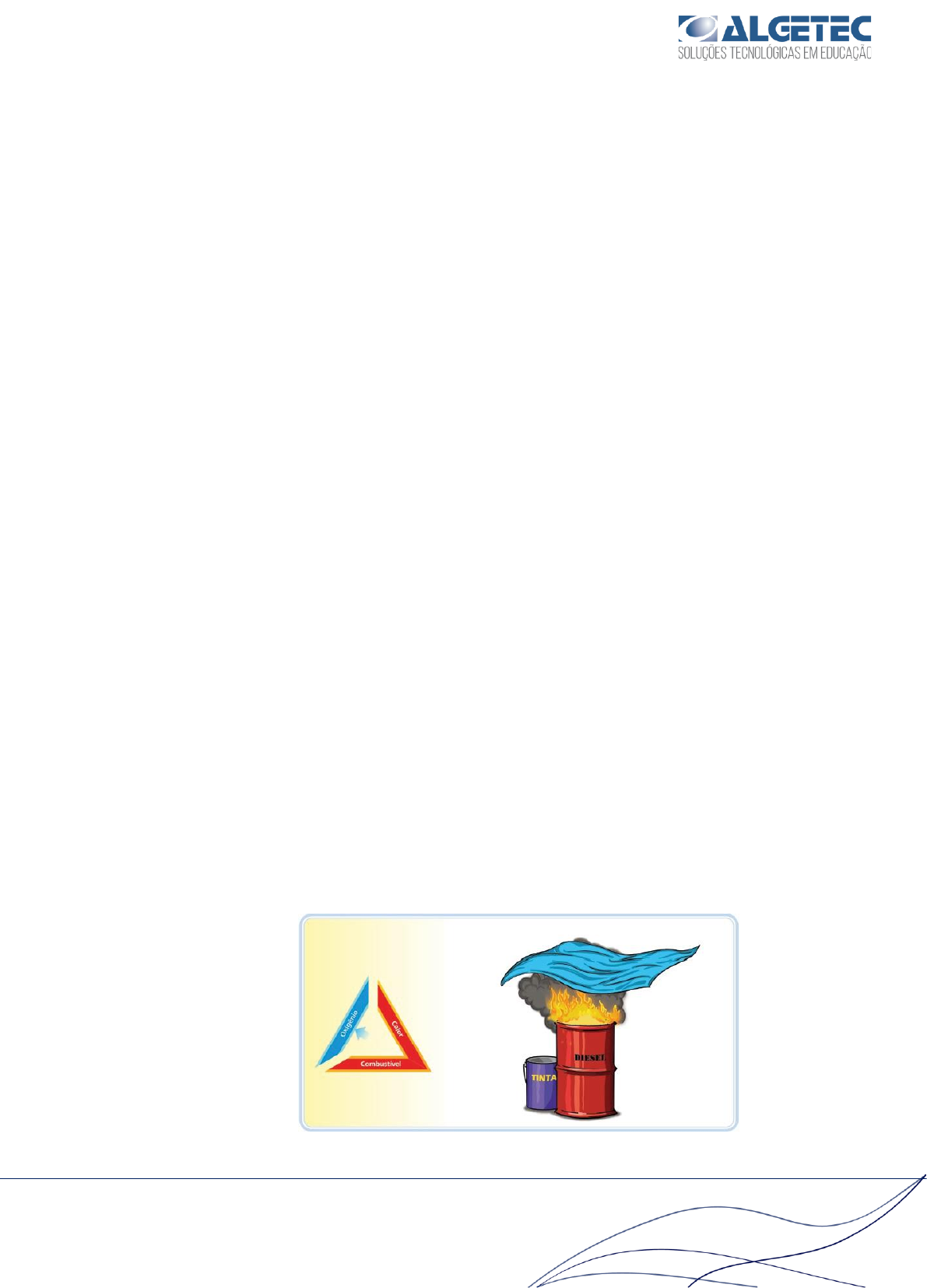 <p>1</p><p>ALGETEC – SOLUÇÕES TECNOLÓGICAS EM EDUCAÇÃO</p><p>CEP: 40260-215 Fone: 71 3272-3504</p><p>E-mail: contato@algetec.com.br | Site: www.algetec.com.br</p><p>LABORATÓRIO DE SEGURANÇA DO TRABALHO</p><p>COMBATE A INCÊNDIO</p><p>COMBATE A INCÊNDIO</p><p>1. INTRODUÇÃO</p><p>Este material complementa o simulador sobre Aterramento e é o primeiro</p><p>conceito abordado para que você possa entender os princípios de aterramento.</p><p>2. FORMAS DE APAGAR O FOGO</p><p>O fogo é um processo químico composto por 3 elementos: Calor, Combustível e</p><p>Oxigênio, que obedece rigorosamente às Leis das Proporções, ou seja, uma configuração</p><p>desordenada desses três elementos não produzirá o fogo. Se suprimimos desse</p><p>triângulo, um dos seus lados, o fogo é eliminado, podendo ser por três formas distintas:</p><p>• Abafamento: Retirada ou redução do teor do oxigênio no local da</p><p>combustão método mais eficaz no incêndio classe B. Pode ser utilizado</p><p>um cobertor ou algum objeto que abafe a combustão, o mais indicado é</p><p>usar extintores de espuma. Em casos de líquidos muito quentes é</p><p>necessário resfriamento posterior, para não ter reignição.</p><p>Figura 1 - Abafamento</p><p>mailto:contato@algetec.com.br</p><p>2</p><p>ALGETEC – SOLUÇÕES TECNOLÓGICAS EM EDUCAÇÃO</p><p>CEP: 40260-215 Fone: 71 3272-3504</p><p>E-mail: contato@algetec.com.br | Site: www.algetec.com.br</p><p>LABORATÓRIO DE SEGURANÇA DO TRABALHO</p><p>COMBATE A INCÊNDIO</p><p>• Isolamento: Nesse método é preciso desagregar o combustível do</p><p>processo de combustão com o objetivo do fogo não passar para áreas não</p><p>afetadas.</p><p>Figura 2 - Isolamento</p><p>• Resfriamento: Redução da temperatura da área afetada, evitando chegar</p><p>ao ponto de fulgor (menor temperatura em que um corpo aquecido se</p><p>inflama para presença de uma chama externa) do objeto.</p><p>Figura 3 - Resfriamento</p><p>mailto:contato@algetec.com.br</p><p>3</p><p>ALGETEC – SOLUÇÕES TECNOLÓGICAS EM EDUCAÇÃO</p><p>CEP: 40260-215 Fone: 71 3272-3504</p><p>E-mail: contato@algetec.com.br | Site: www.algetec.com.br</p><p>LABORATÓRIO DE SEGURANÇA DO TRABALHO</p><p>COMBATE A INCÊNDIO</p><p>3. CASOS DE CHOQUE ELÉTRICO</p><p>Existem cinco tipos de classificações para os diferentes tipos de incêndios, que</p><p>são explicados por classes. Cada extintor é aplicado para determinadas classificações.</p><p>São as classes de incêndio:</p><p>• Classe A: São materiais que queimam em superfícies e em profundidade,</p><p>como é o exemplo da madeira, papel e tecido. São caracterizados por</p><p>cinzas e brasa, deixados pelos resíduos;</p><p>• Classe B: São líquidos inflamáveis e queimam nas superfícies, por</p><p>exemplo: gás, gasolina, álcool e querosene. É caracterizado por não</p><p>deixar resíduos;</p><p>• Classe C: São produzidos por equipamentos elétricos e eletrônicos</p><p>energizados, como computador, lâmpadas e televisões, caracterizado</p><p>pelo alto risco e condução de energia;</p><p>• Classe D: São os metais pirofóricos, precisando de extintores específicos</p><p>para serem apagados. São exemplos de metais pirofóricos: pó de zinco,</p><p>sódio e magnésio. Queimam sempre em alta temperatura;</p><p>• Classe K: São líquidos usados mais comumente no ambiente de cozinha,</p><p>como óleo e gordura.</p><p>Figura 4 - Classes de Incêndio</p><p>mailto:contato@algetec.com.br</p><p>4</p><p>ALGETEC – SOLUÇÕES TECNOLÓGICAS EM EDUCAÇÃO</p><p>CEP: 40260-215 Fone: 71 3272-3504</p><p>E-mail: contato@algetec.com.br | Site: www.algetec.com.br</p><p>LABORATÓRIO DE SEGURANÇA DO TRABALHO</p><p>COMBATE A INCÊNDIO</p><p>4. EXTINTORES DE INCÊNDIO</p><p>São parelhos portáteis de utilização imediata para serem usados em princípios</p><p>de incêndios.</p><p>Quando instalados devem estar visíveis, desobstruídos e sinalizados. Os</p><p>extintores deverão ser retirados somente por 3 motivos: revisão, treinamentos e</p><p>incêndios. Os extintores recebem o nome do agente extintor que empregam, possuindo</p><p>em seu corpo rotulo de identificação.</p><p>Além de serem inspecionados semanalmente, para verificar visibilidade e</p><p>sinalização, mensalmente para visualizar se o bico ou a mangueira estão obstruídos,</p><p>observar a pressão do manômetro e observar se tem o lacre e o pino de segurança.</p><p>Verificar o peso do extintor de CO2 e do cilindro de gás comprimido semestralmente. Se</p><p>o peso do extintor estiver com 90% do especificado, é preciso ser recarregado.</p><p>Anualmente é preciso verificar se não há dano físico e ser recarregado. A cada 5 anos</p><p>deverá ser inspecionado por empresa especializada.</p><p>Os extintores mais comummente usados são:</p><p>• Água Pressurizada: Esse extintor atua no combate a incêndios de Classe</p><p>A (São materiais que queimam em superfícies e em profundidade, como</p><p>por exemplo a madeira, papel e tecido). A água é mantida nos extintores</p><p>por pressurização e é agente propelente ao gás carbónico. O fogo é</p><p>apagado principalmente por resfriamento. É fundamental que ele seja</p><p>aplicado sobre os elementos corretos, caso contrário, ele pode surtir o</p><p>efeito oposto e piorar ainda mais a situação. Como em equipamentos</p><p>elétricos (Classe C), por exemplo;</p><p>• PQS - Pó Químico Seco: Eles são indicados para combate de incêndios</p><p>Classe B (líquidos inflamáveis, como álcool e gasolina) e classe C</p><p>(equipamentos eletrônicos) por não ser condutor de eletricidade. Age</p><p>formando uma nuvem sobre a chama, excluindo o oxigênio, apagando o</p><p>fogo por abafamento;</p><p>mailto:contato@algetec.com.br</p><p>5</p><p>ALGETEC – SOLUÇÕES TECNOLÓGICAS EM EDUCAÇÃO</p><p>CEP: 40260-215 Fone: 71 3272-3504</p><p>E-mail: contato@algetec.com.br | Site: www.algetec.com.br</p><p>LABORATÓRIO DE SEGURAN