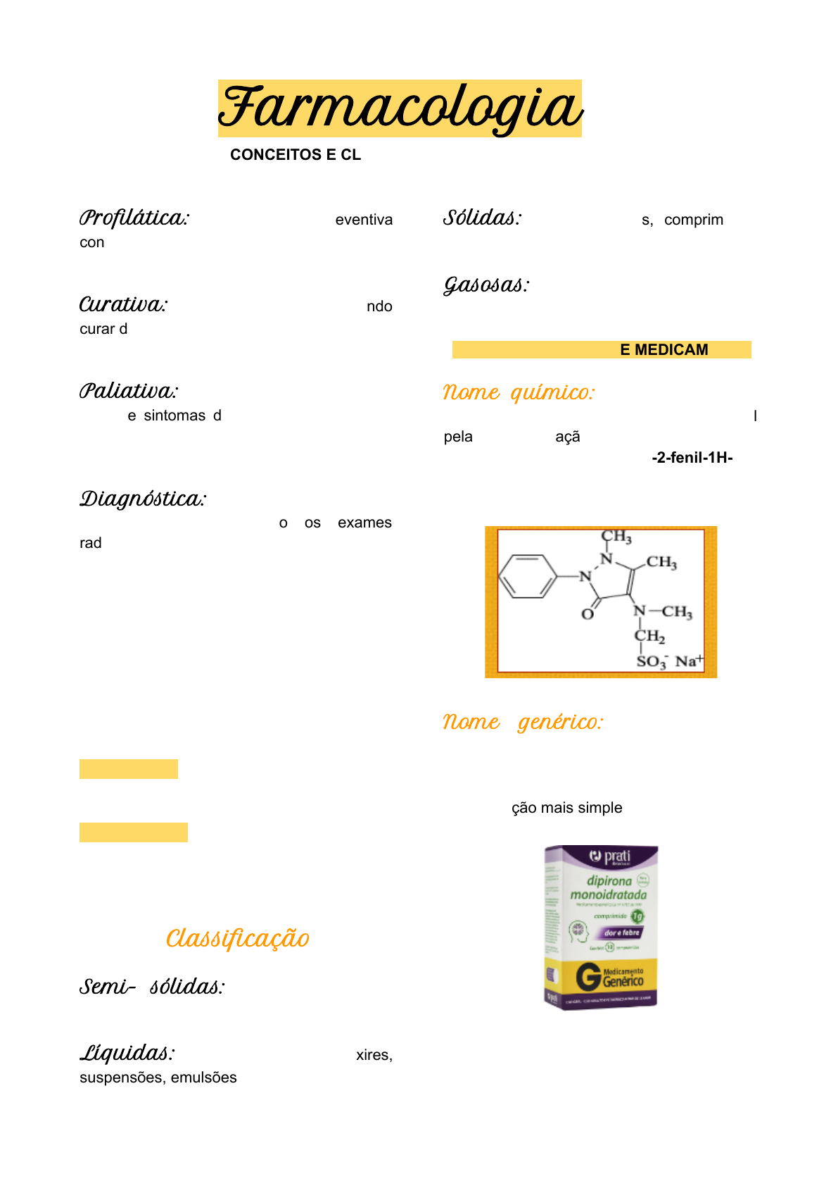 <p>Farmac�l�gia</p><p>CONCEITOS E CLASSES FARMACOLÓGICAS</p><p>Profilática: possui ação preventiva</p><p>contra doenças.</p><p>Exemplo: vacinas.</p><p>Curativa: possui ação curativa, podendo</p><p>curar doenças.</p><p>Exemplo: antibióticos.</p><p>Paliativa: possui capacidade de diminuir</p><p>sinais e sintomas das doenças, porém não</p><p>proporciona a cura.</p><p>Exemplo: antitérmicos e analgésicos.</p><p>Diagnóstica: favorece no diagnóstico</p><p>de doenças, esclarecendo os exames</p><p>radiográficos.</p><p>Exemplo: os contrastes. (A função do</p><p>contraste no corpo é aumentar a opacidade</p><p>das estruturas, restringindo a penetração da</p><p>radiação e, consequentemente, aumentando o</p><p>contraste entre as regiões adjacentes.)</p><p>FORMA FARMACÊUTICA DE UM</p><p>MEDICAMENTO</p><p>DEFINIÇÃO: Forma física do medicamento</p><p>para possibilitar o seu uso pelo paciente.</p><p>FINALIDADE: Facilita a administração do</p><p>princípio ativo e obtenção do melhor efeito</p><p>terapêutico.</p><p>Classificação</p><p>Semi- sólidas: géis, loções, pastas,</p><p>cremes e pomadas.</p><p>Líquidas: soluções, xaropes, elixires,</p><p>suspensões, emulsões, injetáveis e tinturas.</p><p>Sólidas: pós, granulados, comprimidos,</p><p>cápsulas, supositorios e óvulos.</p><p>Gas�sas: aerossóis (sprays).</p><p>EXEMPLO DE NOME DE MEDICAMENTO</p><p>N�me químico: indica a composição</p><p>química da substância ativa (responsável</p><p>pela ação terapêutica).</p><p>[(2,3-diidro-1,5-dimetil-3-oxo-2-fenil-1H-pir</p><p>azol-4-il)metilamino]</p><p>metanossulfonato sódico.</p><p>N�me genérico: como os nomes</p><p>químicos são geralmente muito longos e</p><p>complexos, as substâncias ativas recebem</p><p>também um nome genérico, que é uma</p><p>denominação mais simples e padronizada.</p><p>N�me c�mercial: é o nome que o</p><p>laboratório escolhe para o medicamento que</p><p>produz.</p><p>MEDICAMENTO DE REFERÊNCIA</p><p>Caracteriza-se como um medicamento</p><p>inovador, o primeiro e único a ser produzido</p><p>durante determinado período de tempo.</p><p>- Proteção Patentária junto ao Instituto</p><p>Nacional de Propriedade Industrial (INPI).</p><p>- Garantia de direitos exclusivos de</p><p>produção, exploração e comercialização do</p><p>seu produto, sem concorrência (por um</p><p>período de tempo determinado).</p><p>MEDICAMENTOS GENÉRICOS</p><p>O medicamento genérico é aquele que</p><p>contém o mesmo princípio ativo, na mesma</p><p>dose e forma farmacêutica, é administrado</p><p>pela mesma via e com a mesma posologia e</p><p>indicação terapêutica do medicamento de</p><p>referência. O medicamento genérico</p><p>apresenta eficácia e segurança equivalentes</p><p>à do medicamento de referência podendo,</p><p>com este, ser intercambiável.</p><p>TESTE DE BIOEQUIVALÊNCIA comprova</p><p>que o medicamento genérico apresenta a</p><p>mesma taxa e velocidade de absorção que o</p><p>medicamento de referência, garantindo assim</p><p>os mesmos perfis de segurança, eficácia e</p><p>qualidade.</p><p>Intercambiável: pode substituir o</p><p>medicamento de referência.</p><p>VANTAGENS:</p><p>- Costumam ser significativamente mais</p><p>baratos: os fabricantes de medicamentos</p><p>genéricos não necessitam realizar todas as</p><p>pesquisas que são realizadas, como no caso,</p><p>de quando se desenvolve um medicamento</p><p>inovador, visto que suas características são</p><p>as mesmas do medicamento de referência,</p><p>com o qual são comparados.</p><p>- Sem gastos com publicidade.</p><p>- RDC n. 84/2002 – Regulamento técnico</p><p>para genéricos.</p><p>MEDICAMENTOS SIMILARES</p><p>É aquele que contém o mesmo ou os</p><p>mesmos princípios ativos, apresenta mesma</p><p>concentração, forma farmacêutica, via de</p><p>administração, posologia e indicação</p><p>terapêutica, e que é equivalente ao</p><p>medicamento de referência, podendo diferir</p><p>somente em características relativas ao</p><p>tamanho e forma do produto, prazo de</p><p>validade, embalagem, rotulagem, devendo</p><p>sempre ser identificado por nome comercial</p><p>ou marca.</p><p>Produzidos após vencer a patente do</p><p>medicamento de referência.</p><p>Classificação de Vendas</p><p>Classes Farmac�lógicas</p><p>ANTIBIÓTICOS:</p><p>Antibióticos são medicamentos usados para</p><p>tratar infecções causadas por bactérias.</p><p>Podem ser classificados como: bactericida</p><p>ou bacteriostático.</p><p>- CLASSES “FAMÍLIAS” Beta-lactâmicos,</p><p>quinolonas, glicopeptídeos, oxazolidinonas,</p><p>aminoglicosídeos, macrolídeos, nitroimidazólicos,</p><p>lincosaminas, cloranfenicol, estreptograminas,</p><p>sulfonamidas,tetraciclinas e novos</p><p>antimicrobianos (polimixina, daptomicina).</p><p>Exemplos: azitromicina, vancomicina,</p><p>clavulin, meropenem, amoxacilina, neomicina,</p><p>polimixina B, benzetacil, penicilina,</p><p>eritromicina, gentamicina, cefalexina,</p><p>amicacina, oxacilina.</p><p>ANTIMICÓTICOS:</p><p>Podem apresentar diversas formas, são</p><p>aqueles responsáveis em combater</p><p>infecções causadas por fungos.</p><p>Exemplos: fluconazol, cetoconazol.</p><p>ANTIVIRAIS:</p><p>Grupo de medicamentos que combatem ou</p><p>controlam a evolução de doenças virais.</p><p>Exemplos: aciclovir, zovirax, tamiflu,</p><p>ganciclovir.</p><p>ANTIPARASITÁRIOS</p><p>Grupo de medicamentos que combatem ou</p><p>controlam doenças parasitárias ou</p><p>verminoses;</p><p>Exemplos: albendazol, mebendazol.</p><p>ANTI-HISTAMÍNICOS</p><p>Substância que inibe a histamina, um</p><p>aminoácido encontrado em alguns tipos de</p><p>tecidos, que causam as reações alérgicas.</p><p>Exemplos: loratadina , allegra, prometazina.</p><p>ANOTAÇÕES:</p><p>Anti - Inflamatóri�s não</p><p>ester�idais e</p><p>Pr�tet�res da Muc�sa Gástrica</p><p>ANTI-INFLAMATÓRIOS N/ ESTE:</p><p>Diminui o processo de inflama
