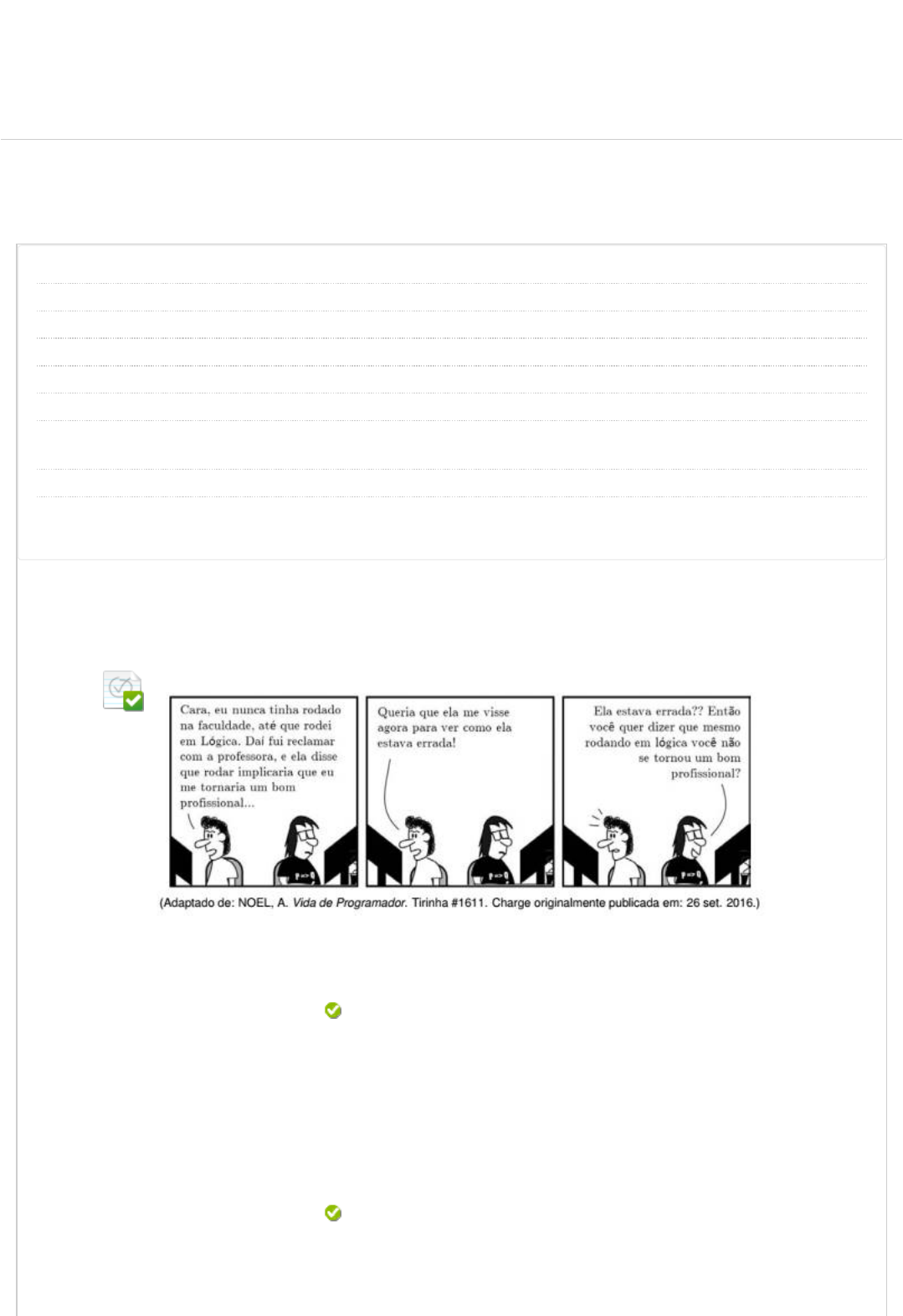 <p>Revisar envio do teste: QUESTIONÁRIO UNIDADE I</p><p>ESTUDOS DISCIPLINARES XII 6675-10_DP_CT_20_20242 CONTEÚDO</p><p>Usuário aretha.catania @aluno.unip.br</p><p>Curso ESTUDOS DISCIPLINARES XII</p><p>Teste QUESTIONÁRIO UNIDADE I</p><p>Iniciado 30/09/24 12:24</p><p>Enviado 30/09/24 12:27</p><p>Status Completada</p><p>Resultado da</p><p>tentativa</p><p>5 em 5 pontos</p><p>Tempo decorrido 3 minutos</p><p>Resultados exibidos Todas as respostas, Respostas enviadas, Respostas corretas, Comentários, Perguntas</p><p>respondidas incorretamente</p><p>Pergunta 1</p><p>Resposta Selecionada: e.</p><p>Respostas: a.</p><p>b.</p><p>c.</p><p>d.</p><p>e.</p><p>Comentário</p><p>da resposta:</p><p>(COPS-UEL/2019) Observe a imagem a seguir:</p><p>Assinale a alternativa que apresenta, corretamente, a regra lógica que fundamenta o efeito</p><p>cômico da tirinha.</p><p>P → Q é falsa se, e somente se, P é verdadeiro e Q é falso.</p><p>P → Q é verdadeira se, e somente se, P é verdadeiro.</p><p>P → Q é verdadeira se, e somente se, Q é verdadeiro.</p><p>P → Q é falsa se, e somente se, P é verdadeiro.</p><p>P → Q é falsa se, e somente se, P é falso ou Q é verdadeiro.</p><p>P → Q é falsa se, e somente se, P é verdadeiro e Q é falso.</p><p>Resposta: E</p><p>Comentário: A questão pede, apenas, a regra lógica que estabelece se</p><p>uma proposição composta condicional (do tipo P → Q) é verdadeira ou</p><p>CONTEÚDOS ACADÊMICOS BIBLIOTECAS MURAL DO ALUNO TUTORIAISUNIP EAD</p><p>0,5 em 0,5 pontos</p><p>http://company.blackboard.com/</p><p>https://ava.ead.unip.br/webapps/blackboard/execute/courseMain?course_id=_371308_1</p><p>https://ava.ead.unip.br/webapps/blackboard/content/listContent.jsp?course_id=_371308_1&content_id=_4232656_1&mode=reset</p><p>https://ava.ead.unip.br/webapps/portal/execute/tabs/tabAction?tab_tab_group_id=_25_1</p><p>https://ava.ead.unip.br/webapps/portal/execute/tabs/tabAction?tab_tab_group_id=_27_1</p><p>https://ava.ead.unip.br/webapps/portal/execute/tabs/tabAction?tab_tab_group_id=_47_1</p><p>https://ava.ead.unip.br/webapps/portal/execute/tabs/tabAction?tab_tab_group_id=_29_1</p><p>https://ava.ead.unip.br/webapps/portal/execute/tabs/tabAction?tab_tab_group_id=_10_1</p><p>https://ava.ead.unip.br/webapps/login/?action=logout</p><p>falsa. A única forma de termos a proposição falsa é com antecedente (P)</p><p>verdadeiro e consequente (Q) falso. Todas as outras combinações para as</p><p>proposições simples componentes tornam a proposição composta P → Q</p><p>verdadeira.</p><p>No quadrinho, a proposição da professora pode ser reescrita no formato</p><p>condicional como: “se você reprovar, então se tornará um bom</p><p>pro�ssional”. Para que ela esteja errada (ou seja, para que a proposição</p><p>dela seja falsa), o personagem não pode ter se tornado um bom</p><p>pro�ssional, já que o consequente precisa ser falso.</p><p>Pergunta 2</p><p>Resposta</p><p>Selecionada:</p><p>c.</p><p>Respostas: a.</p><p>b.</p><p>c.</p><p>d.</p><p>e.</p><p>Comentário da</p><p>resposta:</p><p>(IBFC/2019 - adaptada) Considere o seguinte quadro de referência de símbolos:</p><p>Dada a frase a seguir, com estrutura p ∧ q, selecione a alternativa que expresse</p><p>corretamente a sentença: ~p v~q.</p><p>“O dia se renova todo dia e eu envelheço cada dia, cada mês.”</p><p>O dia não se renova todo dia ou eu não envelheço cada dia, cada</p><p>mês.</p><p>O dia não se renova todo dia e eu não envelheço cada dia, cada</p><p>mês.</p><p>O dia não se renova todo dia e eu envelheço cada dia, cada mês.</p><p>O dia não se renova todo dia ou eu não envelheço cada dia, cada</p><p>mês.</p><p>O dia se renova todo dia ou eu envelheço cada dia, cada mês.</p><p>O dia se renova todo dia se, e somente se, eu envelheço cada dia,</p><p>cada mês.</p><p>Resposta: C</p><p>Comentário: Se temos estrutura p ∧ q para a sentença composta “O dia</p><p>se renova todo dia e eu envelheço cada dia, cada mês”, então temos as</p><p>seguintes proposições simples:</p><p>p: O dia se renova todo dia.</p><p>q: Eu envelheço cada dia, cada mês.</p><p>Para escrevermos ~p v~q, devemos negar cada uma das proposições</p><p>simples e uni-las pelo conectivo OU. Temos, portanto:</p><p>O dia não se renova todo dia ou eu não envelheço cada dia, cada mês.</p><p>0,5 em 0,5 pontos</p><p>Pergunta 3</p><p>Resposta</p><p>Selecionada:</p><p>c.</p><p>Respostas: a.</p><p>b.</p><p>c.</p><p>d.</p><p>e.</p><p>Comentário</p><p>da resposta:</p><p>(FUNDATEC/2019) Duas proposições quaisquer, “p” e “q”, formam uma proposição</p><p>composta por conjunção, tal que p ∧ q. Nessa situação, é correto a�rmar que o resultado</p><p>da proposição será:</p><p>Falso se pelo menos uma das duas proposições simples for falsa.</p><p>Falso para qualquer valor lógico das proposições simples.</p><p>Verdadeiro para qualquer valor lógico das proposições simples.</p><p>Falso se pelo menos uma das duas proposições simples for falsa.</p><p>Verdadeiro se pelo menos uma das duas proposições simples for</p><p>verdadeira.</p><p>Falso se a preposição “p” for verdadeira.</p><p>Resposta: C</p><p>Comentário: Na conjunção, temos proposições simples unidas entre si</p><p>pelo conectivo E (∧). A proposição composta p ∧ q será verdadeira</p><p>apenas se ambas as proposições simples componentes forem</p><p>verdadeiras. Portanto, basta que uma delas seja falsa, para que a</p><p>proposição composta também seja falsa.</p><p>Pergunta 4</p><p>Resposta Selecionada: d.</p><p>Respostas: a.</p><p>b.</p><p>c.</p><p>d.</p><p>e.</p><p>Comentário</p><p>da resposta:</p><p>Do ponto de vista da lógica formal, uma proposição pode ser de�nida como uma sentença</p><p>declarativa classi�cada como verdadeira ou falsa, assumindo um, e apenas um, desses dois</p><p>valores lógicos. Dessa forma, sentenças imperativas ou interrogativas não são</p><p>consideradas propos