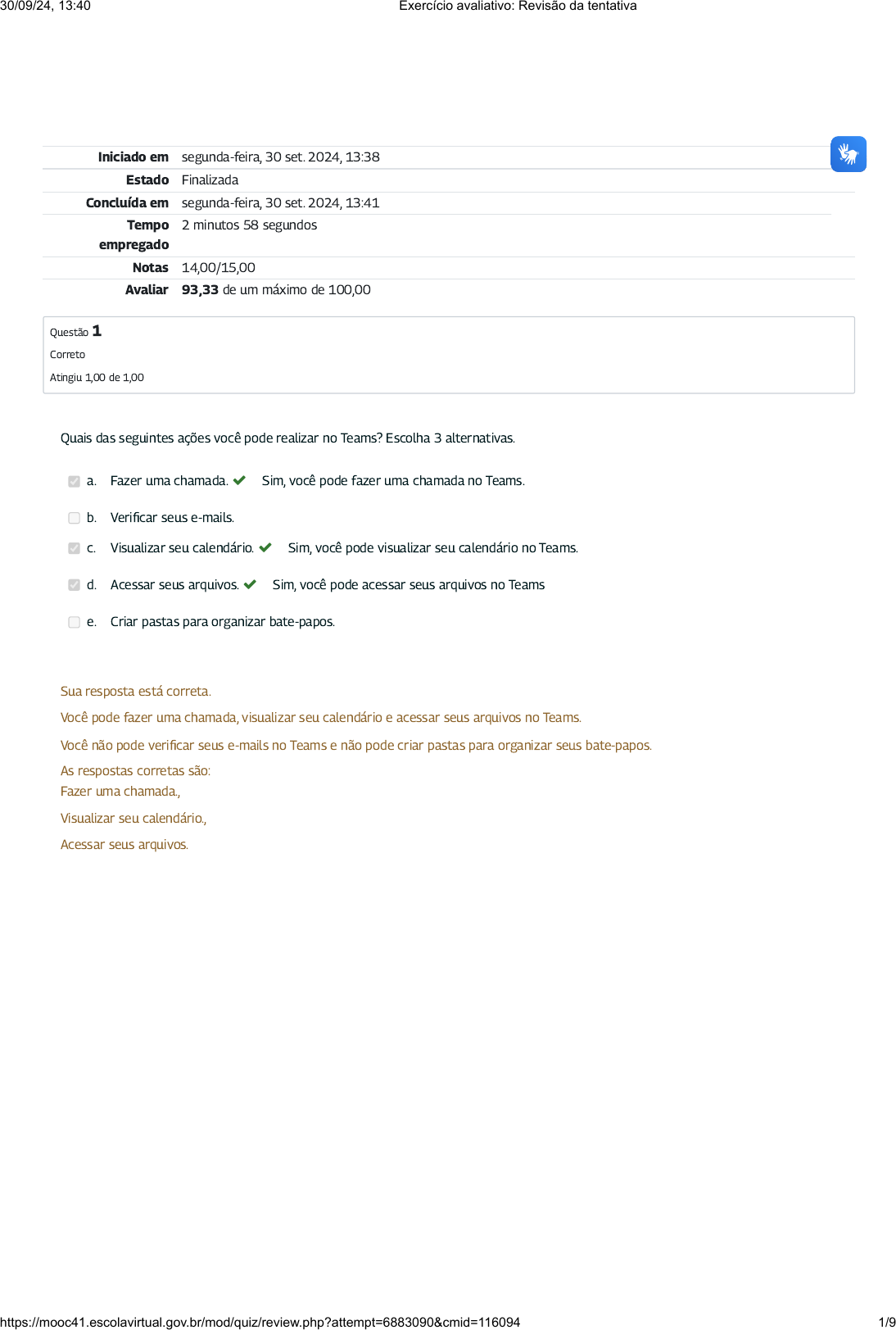 <p>Iniciado em segunda-feira, 30 set. 2024, 13:38</p><p>Estado Finalizada</p><p>Concluída em segunda-feira, 30 set. 2024, 13:41</p><p>Tempo</p><p>empregado</p><p>2 minutos 58 segundos</p><p>Notas 14,00/15,00</p><p>Avaliar 93,33 de um máximo de 100,00</p><p>Questão 1</p><p>Correto</p><p>Atingiu 1,00 de 1,00</p><p>Quais das seguintes ações você pode realizar no Teams? Escolha 3 alternativas.</p><p>a. Fazer uma chamada. Sim, você pode fazer uma chamada no Teams.</p><p>b. Veri�car seus e-mails.</p><p>c. Visualizar seu calendário. Sim, você pode visualizar seu calendário no Teams.</p><p>d. Acessar seus arquivos. Sim, você pode acessar seus arquivos no Teams</p><p>e. Criar pastas para organizar bate-papos.</p><p>Sua resposta está correta.</p><p>Você pode fazer uma chamada, visualizar seu calendário e acessar seus arquivos no Teams.</p><p>Você não pode veri�car seus e-mails no Teams e não pode criar pastas para organizar seus bate-papos.</p><p>As respostas corretas são:</p><p>Fazer uma chamada.,</p><p>Visualizar seu calendário.,</p><p>Acessar seus arquivos.</p><p>30/09/24, 13:40 Exercício avaliativo: Revisão da tentativa</p><p>https://mooc41.escolavirtual.gov.br/mod/quiz/review.php?attempt=6883090&cmid=116094 1/9</p><p>Questão 2</p><p>Correto</p><p>Atingiu 1,00 de 1,00</p><p>Questão 3</p><p>Correto</p><p>Atingiu 1,00 de 1,00</p><p>Quais das seguintes alternativas apresenta uma estratégia adequada para a formação de uma equipe no Teams?</p><p>a. É preciso utilizar um código de adesão</p><p>b. É preciso ter um canal de anúncios.</p><p>c. É preciso adicionar membros à equipe.</p><p>d. É preciso ter um canal geral. </p><p>Sua resposta está correta.</p><p>Quando você forma uma equipe no Teams, é preciso tem um canal geral.</p><p>O código de adesão e de anúncios não são necessários para formar uma equipe.</p><p>Você pode formar uma equipe sem qualquer membro.</p><p>A resposta correta é:</p><p>É preciso ter um canal geral.</p><p>Se você quiser adicionar membros a uma equipe do Microso� Teams, que opções você poderia utilizar? Selecione duas alternativas.</p><p>a. Gerenciar equipe. </p><p>b. Adicionar membro. </p><p>c. Editar equipe.</p><p>d. Permissões de membros.</p><p>Sua resposta está correta.</p><p>Você pode adicionar membros à equipe utilizando as opções 'Gerenciar equipe' e 'Adicionar membro'.</p><p>Não é possível adicionar membros à equipe utilizando a opção 'Editar equipe' ou 'Gerenciar permissões'.</p><p>As respostas corretas são:</p><p>Gerenciar equipe.,</p><p>Adicionar membro.</p><p>30/09/24, 13:40 Exercício avaliativo: Revisão da tentativa</p><p>https://mooc41.escolavirtual.gov.br/mod/quiz/review.php?attempt=6883090&cmid=116094 2/9</p><p>Questão 4</p><p>Correto</p><p>Atingiu 1,00 de 1,00</p><p>Questão 5</p><p>Correto</p><p>Atingiu 1,00 de 1,00</p><p>Como posso impedir que os membros de uma equipe adicionem canais à nossa equipe?</p><p>a. Use a opção 'Editar equipe'.</p><p>b. Torne a equipe privativa.</p><p>c. Use as con�gurações de administração. </p><p>d. Torne os canais privativos.</p><p>Sua resposta está correta.</p><p>Você pode utilizar as con�gurações de administração para impedir que os membros da equipe adicionem canais.</p><p>Com a opção de 'Editar equipes' não é possível impedir os membros da equipe de adicionar canais.</p><p>A con�guração de privacidade de uma equipe não afeta o acesso dos membros para criação de canais.</p><p>A resposta correta é:</p><p>Use as con�gurações de administração.</p><p>Qual é melhor maneira de iniciar um bate-papo com mais de uma pessoa adicional?</p><p>a. Criar uma nova Equipe e adicionar todos como membros..</p><p>b. Enviar o bate-papo para todos imediatamente. </p><p>c. Adicionar os participantes como contatos e selecioná-los na guia de contatos.</p><p>d. Abrir uma reunião no Teams e convidar as pessoas.</p><p>Sua resposta está correta.</p><p>A inclusão de várias pessoas em um único bate-papo é a maneira mais e�ciente de conversar com todas elas ao mesmo tempo.</p><p>Você pode formar uma equipe e se comunicar por meio de um canal, mas esta não é a melhor maneira de manter um bate-papo com</p><p>várias pessoas.</p><p>Embora você possa facilmente enviar um bate-papo para uma pessoa na guia de contatos, mas esta não é a melhor maneira de iniciar</p><p>um bate-papo com várias pessoas.</p><p>Ao abrir uma reunião você abre um bate-papo para a reunião e para todos os participantes dela, mas esta não é a melhor maneira de</p><p>iniciar um bate-papo com várias pessoas.</p><p>A resposta correta é:</p><p>Enviar o bate-papo para todos imediatamente.</p><p>30/09/24, 13:40 Exercício avaliativo: Revisão da tentativa</p><p>https://mooc41.escolavirtual.gov.br/mod/quiz/review.php?attempt=6883090&cmid=116094 3/9</p><p>Questão 6</p><p>Correto</p><p>Atingiu 1,00 de 1,00</p><p>Questão 7</p><p>Correto</p><p>Atingiu 1,00 de 1,00</p><p>Que informações você encontra quando veri�ca a presença ou o status de alguém no Teams?</p><p>a. Seu cargo na empresa.</p><p>b. Há quanto tempo ela está no Teams hoje.</p><p>c. Quando termina seu expediente.</p><p>d. Sua disponibilidade. </p><p>Sua resposta está correta.</p><p>A veri�cação da presença ou do status de alguém no Teams mostra sua disponibilidade.</p><p>A veri�cação da presença ou do status de alguém no Teams não mostra seu cargo na empresa.</p><p>A veri�cação da presença ou do status de alguém no Teams não mostra há quanto tempo a pessoa está no Teams no dia.</p><p>A veri�cação da presença ou do status de alguém no Teams não mostra quando a pessoa termina seu expediente.</p><p>A resposta correta é:</p><p>Sua disponibilidade.</p><p>Qual é a melhor maneira de chamar a atenção de alguém para um bate-papo direto no Teams?</p><p>a. Adicioná-los ao seu grupo de contatos.</p><p>b. Citá-los em um post ou enviar uma mensagem diretamente a eles. </p><p>c. 