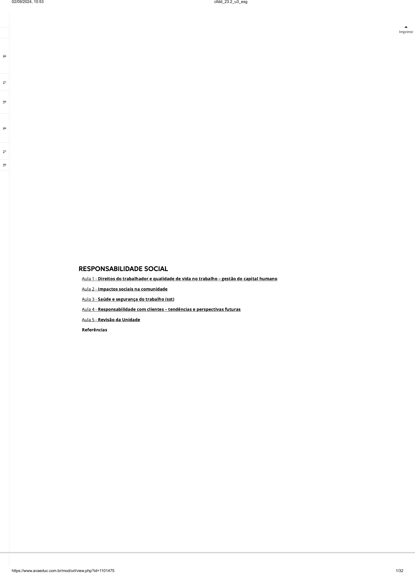 <p>Imprimir</p><p>RESPONSABILIDADE SOCIAL</p><p>Aula 1 - Direitos do trabalhador e qualidade de vida no trabalho – gestão do capital humano</p><p>Aula 2 - Impactos sociais na comunidade</p><p>Aula 3 - Saúde e segurança do trabalho (sst)</p><p>Aula 4 - Responsabilidade com clientes – tendências e perspectivas futuras</p><p>Aula 5 - Revisão da Unidade</p><p>Referências</p><p>02/09/2024, 10:53 clldd_23.2_u3_esg</p><p>https://www.avaeduc.com.br/mod/url/view.php?id=1101475 1/32</p><p>INTRODUÇÃO</p><p>Estudante, a partir desta aula, o assunto terá como pauta a responsabilidade social como a tônica da sigla “S”</p><p>do ESG. Dentro desta perspectiva, as organizações que estão trilhando um caminho fundamentado nas</p><p>melhores práticas em ESG precisam olhar para dentro (para o seu ambiente de trabalho e como cuidam das</p><p>pessoas trabalhadoras) e para fora – para a comunidade local, para os seus clientes e fornecedores – para</p><p>re�etir sobre os impactos das suas ações em relação a estas partes interessadas. A responsabilidade é um</p><p>conceito essencial para que o ESG seja algo possível de se implementar na prática e conseguir ir além dos</p><p>discursos. Te desejo bons estudos!</p><p>RESPONSABILIDADE SOCIAL PARA DENTRO: SOBRE OS DIREITOS E DEVERES DO EMPREGADOR E</p><p>DO EMPREGADO</p><p>Estudante, com a �nalidade de explicar e fortalecer os seus conhecimentos sobre responsabilidade social e a</p><p>sua relevância para a implementação das melhores práticas em ESG pelas organizações, trataremos</p><p>inicialmente do esclarecimento do termo responsabilidade.</p><p>De acordo com algumas de�nições em consulta ao Dicionário de Sinônimos (2023), encontramos as seguintes</p><p>palavras:</p><p>Quadro 1 | Sinônimos para o termo responsabilidade</p><p>No sentido de “sensatez e forma de agir” No sentido de “dever e obrigação”</p><p>sensatez, seriedade, juízo, cabeça, consciência,</p><p>critério, re�exão, siso, tento, tino, razão, retidão,</p><p>discernimento, equilíbrio.</p><p>dever, obrigação, incumbência, encargo, tarefa,</p><p>compromisso, atribuição, comprometimento, cargo,</p><p>cuidado, conta, parte, supervisão, mão, mando.</p><p>Fonte: Dicionário de Sinônimos (n.d., n.p.).</p><p>Aula 1</p><p>DIREITOS DO TRABALHADOR E QUALIDADE DE VIDA NO</p><p>TRABALHO – GESTÃO DO CAPITAL HUMANO1</p><p>Estudante, a partir desta aula, o assunto terá como pauta a responsabilidade social como a tônica da</p><p>sigla “S” do ESG.</p><p></p><p>02/09/2024, 10:53 clldd_23.2_u3_esg</p><p>https://www.avaeduc.com.br/mod/url/view.php?id=1101475 2/32</p><p>https://www.sinonimos.com.br/responsabilidade/</p><p>É possível perceber que ser responsável possui conotações de “bom senso” e de “obrigações”. Ser responsável</p><p>é assumir para si e perante a sociedade que você responde pelos seus atos, ou seja, por tudo o que você</p><p>expressa e faz. Quando esta responsabilidade abrange não só a própria pessoa, mas também os efeitos</p><p>daquilo que ela faz em relação aos outros (pessoas e meio ambiente), estamos falando da responsabilidade</p><p>social.</p><p>Exempli�cando esta ideia inicial, imagine se você estivesse caminhando por uma avenida com um sanduíche</p><p>em mãos e ao desembrulhá-lo, jogasse o papel no chão. Seria de sua responsabilidade perceber o ato,</p><p>assumir um compromisso para corrigi-lo e procurar o modo correto de lidar com o descarte deste resíduo.</p><p>Imagine que ao �nal da caminhada você seguiu para um ônibus e ao subir, destratou o motorista e resolveu</p><p>se sentar em um assento reservado para uma pessoa idosa, já que estava vazio e você �caria em pé durante o</p><p>trajeto. Em todos esses casos, as suas ações afetam outras pessoas e o meio ambiente e são situações que</p><p>envolvem o bom senso e os deveres (obrigações), de acordo com as de�nições estudadas anteriormente, visto</p><p>que nos dois sentidos a responsabilidade está incutida no seu gesto.</p><p>Assim como nestes exemplos, e que espero, sinceramente, que sejam situações hipotéticas, caro estudante,</p><p>as organizações também possuem responsabilidade social que precisam acontecer “para dentro”, quando se</p><p>trata da responsabilidade para com o ambiente de trabalho e o zelo na condução das pessoas trabalhadoras e</p><p>“para fora”, quando a empresa precisa entender que é responsável pelos impactos que gera às comunidades</p><p>locais onde ela atua e na sua relação com clientes e fornecedores. Nas palavras de Soler e Palermo (2023, p.</p><p>33), o ESG faz um convite para que as empresas tenham “maior proximidade com os efeitos negativos de suas</p><p>próprias operações”, quando se trata de estarem fechadas em seu próprio mundo, interagindo muito pouco</p><p>com o mundo real e que sente os impactos das suas ações.</p><p>Nesta aula, em especial, discutiremos o assunto “para dentro”, ou seja, como as organizações devem tratar as</p><p>relações humanas do ponto de vista social e trabalhista e manter um clima sadio e favorável à boa qualidade</p><p>de vida no trabalho.</p><p>De nada adianta uma organização fazer um conjunto de esforços para cumprir metas ambientais e de gestão</p><p>(governança) se não aplica o mínimo de esforços para cuidar corretamente das pessoas com as quais ela tem</p><p>que contar para entregar seus produtos e serviços ao mercado, ou seja, seus funcionários.</p><p>É responsável socialmente a organização que entende que cumprir a legislação trabalhista, por exemplo, é</p><p>algo além da obrigação. A legislação social e trabalhista no Brasil tem como intenções a garantia de direitos e</p><p>proteção do trabalhador, que, há tempos, não eram reconhecidos tais como como o direito a se aposentar, a</p><p>ter boas condições de trabalho, não ter redução de salário, aviso prévio, repouso semanal remun