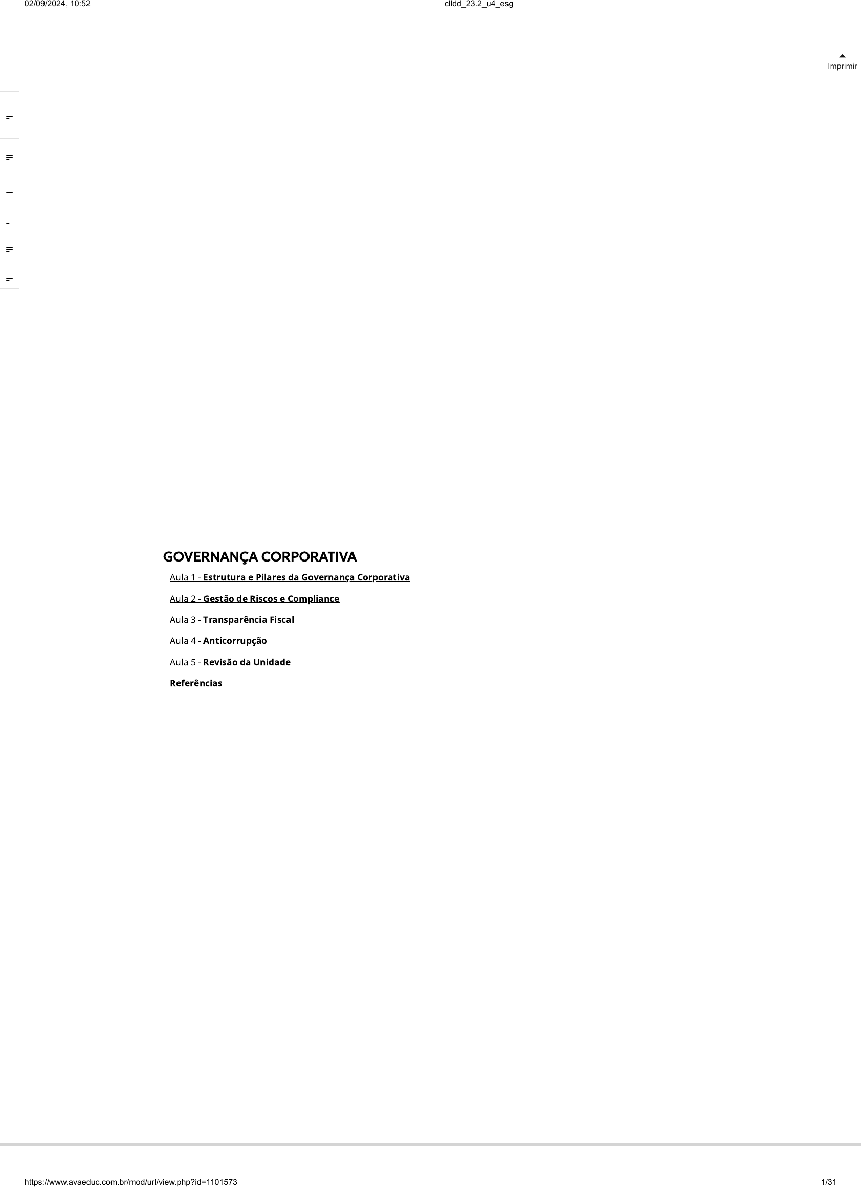 <p>Imprimir</p><p></p><p>GOVERNANÇA CORPORATIVA</p><p>Aula 1 - Estrutura e Pilares da Governança Corporativa</p><p>Aula 2 - Gestão de Riscos e Compliance</p><p>Aula 3 - Transparência Fiscal</p><p>Aula 4 - Anticorrupção</p><p>Aula 5 - Revisão da Unidade</p><p>Referências</p><p>02/09/2024, 10:52 clldd_23.2_u4_esg</p><p>https://www.avaeduc.com.br/mod/url/view.php?id=1101573 1/31</p><p>INTRODUÇÃO</p><p>Olá, estudante!</p><p>Nesta aula vamos explorar os fundamentos e os princípios que norteiam a governança corporativa, bem como</p><p>a sua importância no ambiente organizacional.</p><p>A governança corporativa é essencial para promover a transparência, a responsabilidade e a e�ciência nas</p><p>organizações. Ela abrange um conjunto de práticas, processos e estruturas que visam garantir uma gestão</p><p>sólida, equilibrando os interesses dos stakeholders e da sociedade como um todo.</p><p>Na virada do século 21, a temática da governança ganhou ainda mais relevância devido a escândalos</p><p>corporativos que abalaram empresas norte-americanas renomadas e esses eventos desencadearam intensas</p><p>discussões acerca da divulgação de informações �nanceiras e do papel desempenhado pelas empresas de</p><p>auditoria.</p><p>Portanto, é fundamental compreender como esses episódios históricos moldaram a evolução da governança</p><p>corporativa e como as práticas estabelecidas têm impacto direto nas estratégias e na gestão das organizações</p><p>modernas.</p><p>Ao longo desta aula, você terá a oportunidade de compreender os sistemas de governança e sua aplicação em</p><p>diferentes contextos, incluindo empresas públicas, privadas e organizações do terceiro setor. Por meio dessa</p><p>compreensão, você será capaz de analisar e avaliar a e�cácia dos mecanismos de governança em diversas</p><p>situações.</p><p>Prepare-se para explorar esses aspectos durante a aula, adquirindo conhecimentos valiosos para sua atuação</p><p>pro�ssional e contribuindo para uma cultura corporativa íntegra e bem-sucedida.</p><p>Bons estudos!</p><p>DESVENDANDO A GOVERNANÇA</p><p>A governança tem suas origens desde os primórdios da civilização humana, quando as sociedades começaram</p><p>a se organizar e estabelecer estruturas para tomar decisões coletivas e lidar com questões importantes. A</p><p>etimologia da palavra governança remonta à raiz grega kybernan e ao termo latino gubernare, ambos</p><p>Aula 1</p><p>ESTRUTURA E PILARES DA GOVERNANÇA CORPORATIVA</p><p>Nesta aula vamos explorar os fundamentos e os princípios que norteiam a governança corporativa,</p><p>bem como a sua importância no ambiente organizacional.</p><p></p><p>02/09/2024, 10:52 clldd_23.2_u4_esg</p><p>https://www.avaeduc.com.br/mod/url/view.php?id=1101573 2/31</p><p>relacionados à ideia de guiar, conduzir ou mostrar um caminho (ALENCASTRO; ALVES, 2017).</p><p>A governança é um conceito que está intrinsecamente ligado às práticas adotadas pelos diferentes agentes</p><p>que compõem a sociedade, sejam eles governos, organizações do terceiro setor ou empresas, com o</p><p>propósito de modi�car o ambiente em que estão inseridos (SILVEIRA, 2015). Trata-se, portanto, de um</p><p>conjunto de boas práticas que visa melhorar a situação da sociedade em geral, assim como dos acionistas,</p><p>colaboradores e demais envolvidos.</p><p>Entretanto, é importante entender a diferença entre governança e governabilidade para não causar confusão</p><p>sobre seus signi�cados. A governança estabelece as regras do jogo, de�ne os papéis e responsabilidades e</p><p>busca assegurar uma gestão ética, transparente e e�ciente. É voltada para a forma como uma organização é</p><p>conduzida, toma decisões e presta contas aos seus stakeholders, que são indivíduos, grupos ou entidades que</p><p>têm interesse ou são afetados pelas atividades, decisões e resultados de uma organização.</p><p>No setor público, o objetivo da governança é garantir a transparência, a e�ciência e a prestação de contas na</p><p>gestão dos recursos públicos. Isso inclui a de�nição de políticas claras, a separação entre as funções de</p><p>propriedade, controle e operação, e a criação de mecanismos de supervisão e controle.</p><p>Ao longo do tempo, com o crescimento das grandes corporações e a separação entre propriedade e</p><p>controle, tornou-se necessário estabelecer mecanismos para garantir a proteção dos interesses dos</p><p>acionistas. Isso levou ao surgimento de sistemas de governança corporativa, com o objetivo de assegurar</p><p>a transparência, a prestação de contas e a responsabilidade dos gestores perante os acionistas.</p><p>O sistema de governança é um conjunto de estruturas, processos, políticas e práticas que tem como objetivo</p><p>orientar e controlar as organizações (HÚNGARO, 2020). Ele estabelece as regras e os procedimentos para a</p><p>tomada de decisões, o monitoramento do desempenho e a prestação de contas e visa garantir que a</p><p>organização seja conduzida de forma ética, transparente e e�ciente.</p><p>Por outro lado, a governabilidade refere-se às condições e capacidades de um sistema político ou</p><p>organizacional para exercer a governança de maneira e�caz e está relacionada à estabilidade, legitimidade e</p><p>capacidade de resposta do sistema às demandas e necessidades da sociedade (HÚNGARO, 2020).</p><p>A governança tem se tornado um assunto cada vez mais relevante nos últimos anos, como resultado, passou</p><p>a ser aplicada não apenas em empresas privadas, mas também em instituições públicas e várias outras</p><p>formas de associações sociais.</p><p>Figura 1 | Governança no setor público</p><p>Fonte: Shutterstock.</p><p></p><p>02/09/2024, 10:52 clldd_23.2_u4_esg</p><p>https://www.avaeduc.com.br/mod/url/view.php?id=1101573 3/31</p><p>A governança no terceiro setor é aplicada a organizaçõ