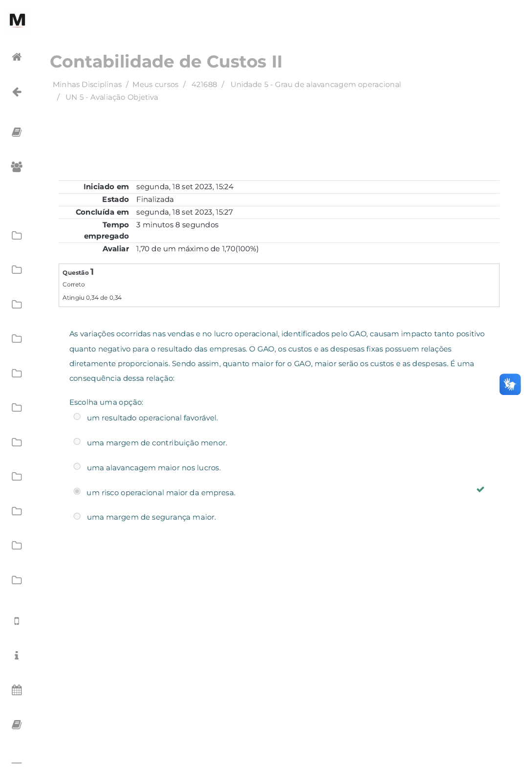 <p>Minhas Disciplinas / Meus cursos / 421688 / Unidade 5 - Grau de alavancagem operacional</p><p>/ UN 5 - Avaliação Objetiva</p><p>Contabilidade de Custos II</p><p>Iniciado em segunda, 18 set 2023, 15:24</p><p>Estado Finalizada</p><p>Concluída em segunda, 18 set 2023, 15:27</p><p>Tempo</p><p>empregado</p><p>3 minutos 8 segundos</p><p>Avaliar 1,70 de um máximo de 1,70(100%)</p><p>Questão 1</p><p>Correto</p><p>Atingiu 0,34 de 0,34</p><p>As variações ocorridas nas vendas e no lucro operacional, identi�cados pelo GAO, causam impacto tanto positivo</p><p>quanto negativo para o resultado das empresas. O GAO, os custos e as despesas �xas possuem relações</p><p>diretamente proporcionais. Sendo assim, quanto maior for o GAO, maior serão os custos e as despesas. É uma</p><p>consequência dessa relação:</p><p>Escolha uma opção:</p><p>um resultado operacional favorável.</p><p>uma margem de contribuição menor.</p><p>uma alavancagem maior nos lucros.</p><p>um risco operacional maior da empresa. </p><p>uma margem de segurança maior.</p><p></p><p></p><p></p><p></p><p></p><p></p><p></p><p></p><p></p><p></p><p></p><p></p><p></p><p></p><p></p><p></p><p></p><p></p><p></p><p></p><p>https://avap.multivix.edu.br/my/</p><p>https://avap.multivix.edu.br/course/view.php?id=23855</p><p>https://avap.multivix.edu.br/course/view.php?id=23855§ion=6</p><p>https://avap.multivix.edu.br/mod/quiz/view.php?id=1530002</p><p>https://avap.multivix.edu.br/my/</p><p>https://avap.multivix.edu.br/course/view.php?id=23855</p><p>https://avap.multivix.edu.br/user/index.php?id=23855</p><p>https://avap.multivix.edu.br/course/view.php?id=23855§ion=1</p><p>https://avap.multivix.edu.br/course/view.php?id=23855§ion=2</p><p>https://avap.multivix.edu.br/course/view.php?id=23855§ion=3</p><p>https://avap.multivix.edu.br/course/view.php?id=23855§ion=4</p><p>https://avap.multivix.edu.br/course/view.php?id=23855§ion=5</p><p>https://avap.multivix.edu.br/course/view.php?id=23855§ion=6</p><p>https://avap.multivix.edu.br/course/view.php?id=23855§ion=7</p><p>https://avap.multivix.edu.br/course/view.php?id=23855§ion=8</p><p>https://avap.multivix.edu.br/course/view.php?id=23855§ion=9</p><p>https://avap.multivix.edu.br/course/view.php?id=23855§ion=10</p><p>https://avap.multivix.edu.br/course/view.php?id=23855§ion=11</p><p>https://avap.multivix.edu.br/hooks/portal/</p><p>https://avap.multivix.edu.br/mod/page/view.php?id=1252%2F%22%20target%3D%22_blank</p><p>https://avap.multivix.edu.br/calendar/view.php/</p><p>https://avap.multivix.edu.br/local/staticpage/view.php?page=biblioteca</p><p>https://multivix.edu.br/office-365/</p><p>https://avap.multivix.edu.br/</p><p>Questão 2</p><p>Correto</p><p>Atingiu 0,34 de 0,34</p><p>Questão 3</p><p>Correto</p><p>Atingiu 0,34 de 0,34</p><p>Uma empresa resolveu fazer um comparativo do desempenho obtido em dois anos. Os custos variáveis e a</p><p>receita das vendas foram iguais em ambos os anos, assim como a margem de contribuição. O custo �xo total em</p><p>um dos anos foi maior. Isso signi�ca que neste ano:</p><p>Escolha uma opção:</p><p>o lucro operacional foi menor e o grau de alavancagem operacional foi maior. </p><p>a margem de contribuição não poderia ser a mesma.</p><p>houve descontrole nos custos �xos totais.</p><p>o lucro variou em função de uma gestão de vendas ine�ciente.</p><p>as vendas não foram signi�cativas para a empresa.</p><p>A alavancagem operacional está diretamente relacionada à produção e às vendas, exercendo in�uência direta no</p><p>lucro operacional de uma empresa.</p><p>Considerando o efeito que uma alavanca produz como ferramenta, a alavancagem operacional gera crescimento</p><p>na produção, nas vendas e nos lucros. Para uma empresa alavancar lucros, ela precisa:</p><p>Escolha uma opção:</p><p>ter despesas e custos �xos maiores do que as despesas e os custos totais. </p><p>aumentar o valor dos produtos de acordo com os custos referentes a cada produto.</p><p>controlar rigorosamente as despesas e os custos �xos, de modo a reduzi-los constantemente.</p><p>apresentar as despesas e os custos �xos menores do que as despesas e os custos totais.</p><p>equilibrar as despesas e os custos �xos com as despesas e os custos variáveis.</p><p></p><p></p><p></p><p></p><p></p><p></p><p></p><p></p><p></p><p></p><p></p><p></p><p></p><p></p><p></p><p></p><p></p><p></p><p></p><p></p><p>https://avap.multivix.edu.br/my/</p><p>https://avap.multivix.edu.br/course/view.php?id=23855</p><p>https://avap.multivix.edu.br/user/index.php?id=23855</p><p>https://avap.multivix.edu.br/course/view.php?id=23855§ion=1</p><p>https://avap.multivix.edu.br/course/view.php?id=23855§ion=2</p><p>https://avap.multivix.edu.br/course/view.php?id=23855§ion=3</p><p>https://avap.multivix.edu.br/course/view.php?id=23855§ion=4</p><p>https://avap.multivix.edu.br/course/view.php?id=23855§ion=5</p><p>https://avap.multivix.edu.br/course/view.php?id=23855§ion=6</p><p>https://avap.multivix.edu.br/course/view.php?id=23855§ion=7</p><p>https://avap.multivix.edu.br/course/view.php?id=23855§ion=8</p><p>https://avap.multivix.edu.br/course/view.php?id=23855§ion=9</p><p>https://avap.multivix.edu.br/course/view.php?id=23855§ion=10</p><p>https://avap.multivix.edu.br/course/view.php?id=23855§ion=11</p><p>https://avap.multivix.edu.br/hooks/portal/</p><p>https://avap.multivix.edu.br/mod/page/view.php?id=1252%2F%22%20target%3D%22_blank</p><p>https://avap.multivix.edu.br/calendar/view.php/</p><p>https://avap.multivix.edu.br/local/staticpage/view.php?page=biblioteca</p><p>https://multivix.edu.br/office-365/</p><p>https://avap.multivix.edu.br/</p><p>Questão 4</p><p>Correto</p><p>Atingiu 0,34 de 0,34</p><p>Questão 5</p><p>Correto</p><p>Atingiu 0,34 de 0,34</p><p>Os valores da empresa Perfeição Eletrodomésticos são os seguintes:</p><p>- Custos e despesas variáveis: R$ 31.000,00/unidade</p><p>- Custos e despesas �xas: R$ 966.000,00</p><p>- Unidades vendidas: 100</p><p>- Valor d