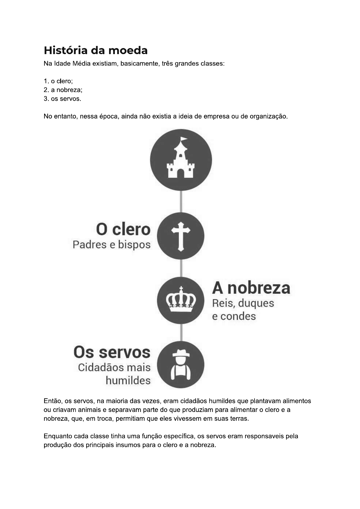 <p>História da moeda Na Idade Média existiam, basicamente, três grandes classes: 1. o clero; 2. a nobreza; 3. os servos. No entanto, nessa época, ainda não existia a ideia de empresa ou de organização. clero Padres e bispos t A nobreza Reis, duques e condes Os servos Cidadãos mais humildes Então, os servos, na maioria das vezes, eram cidadãos humildes que plantavam alimentos ou criavam animais e separavam parte do que produziam para alimentar o clero e a nobreza, que, em troca, permitiam que eles vivessem em suas terras Enquanto cada classe tinha uma função específica, os servos eram responsaveis pela produção dos principais insumos para o clero e a nobreza.</p><p>Nesse cenário, surgiu um acontecimento importante: a melhoria nos meios de transporte! Com o passar do tempo e com a melhoria nos meios de transporte, que possibilitavam maiores viagens, as pessoas começaram a trocar alguns dos insumos produzidos com outros reinos. Essas trocas foram primordiais para a fundação das primeiras cidades, como as conhecemos hoje, e ajudaram no conhecimento e na expansão do mundo.</p><p>Relação de trabalho dos servos na idade média</p><p>Inicialmente, este foi o principal meio de comercialização de mercadoria entre cidadãos, dado que até aquele momento não havia um meio de troca padronizado para todos. Ou seja, não existiam cédulas ou moedas. Escambo e negociociação de mercadorias Para que você compreenda esse processo, vamos analisar alguns casos. Caso 1 Enquanto o reino do duque Zé conseguia produzir apenas batatas, o reino vizinho, do conde Chico, tinha muito gado. Então, o duque Zé dava alguns quilos de batata em troca de algumas cabeças de gado do conde Chico. ? Caso 1</p><p>No entanto, com base neste exemplo, você deve estar se perguntando: como saber quantos quilos de batata deveriam ser trocados por uma cabeça de gado? Caso 1 Observa-se a equivalência das mercadorias! Assim, apesar de haver muita negociação no processo de escambo para que ambas as partes se sintam confortáveis em trocar mercadorias, não é possível estabelecer a equivalência exata das mercadorias em unidades de valor (como real, dólar ou euro, nos dias de hoje). Independentemente do tempo que se passe negociando termos, um lado sempre sairá com vantagem nas negociações que envolvem o escambo. Vejamos o segundo caso. 2 Caso 2</p><p>Vamos comparar o tempo gasto para cultivar batatas (por volta de 180 dias, dependendo do solo e do clima) e o tempo que leva a gestação de um bezerro (283 dias). Como é possível constatar, para se ter um bezerro, leva-se quase um ano, enquanto é possível produzir duas plantações de batata por ano. Caso 2 Você deve ter imaginado que o valor do bezerro deveria ser equivalente ao dobro do valor da plantação de batata, de modo que a troca seria justa. Porém note que bezerro se tornará vaca, produzirá leite por anos a fio e servirá como carne para alimentar dezenas de pessoas. Por essa e outras questões, o escambo foi substituído por ser um método falho de negociação. Desse modo, a criação de uma moeda única, que fosse aceita por todos, era essencial. Diante da necessidade da compra e venda de produtos, antes usados apenas como subsistência (para consumo próprio), a moeda que hoje conhecemos surgiu como um instrumento para melhorar a eficiência e a eficácia das trocas de produtos e serviços. Ao longo dos anos, o feudalismo deixou de existir, dando origem às nações com um poder centralizado e unificado. Dessa forma, o conceito de moeda foi expandido.</p><p>G REAIS RESERVE NOTE P REAIS FEDERAL G 100 B2 LB REAIS Hoje, há diversas maneiras de se trocar mercadorias com base em um equalizador financeiro aceito dentro do país, ou seja, uma moeda única em que todas as mercadorias ou os serviços se baseiam. No Brasil, essa moeda é o Real e, nos EUA, o Dólar. Além disso, com a chegada da internet, foi possível comprar e vender a partir de meios digitais que, instantaneamente, registram a entrada ou saída de dinheiro da conta, tornando todo o processo mais fácil, ágil, prático e seguro. Funções da moeda Observando os avanços históricos da moeda, apresentamos, a seguir, empresas que oferecem compra e venda a partir de meios digitais, registrando a entrada ou saída de dinheiro na conta de forma segura. Veja: amazon Amazon É uma empresa transnacional de tecnologia focada em comércio eletrônico, computação em nuvem, streaming digital e inteligência artificial. Fundada por Jeff Bezos em julho de 1994, tem sua sede localizada em Seattle, estado de Washington, nos EUA.</p><p>Netshoes Maior site de lifestyle esportivo da América Latina. É guiada pela inovação e conectividade, por isso é referência em serviço, entrega e qualidade. A marca tem mais de 10 milhões de nas redes sociais e é referência para o varejo digital há mais de 15 anos. AliExpress AliExpress É um serviço de varejo on-line fundado em 2010 e pertencente ao Alibaba Group. AliExpress é diferente da Amazon, pois atua apenas como uma plataforma de e-commerce e não vende os produtos diretamente para os consumidores.</p><p>No final do ano de 1999, a empresa Lojas Americanas iniciou a venda de mercadorias através da Internet, criando a controlada indireta Americanas.com. Estamos acostumados a pensar no dinheiro como algo que serve, basicamente, para comprar produtos: bens e/ou serviços. Produtos são bens (físicos, podemos ver e tocar) e/ou serviços (intangíveis, serviços prestados). Exemplos de bens: celular; comida; eletrodomésticos. Exemplos de serviços: cabelereiro; pedreiro; guia turístico. No entanto, a moeda possui três funções básicas: Instrumento de trocas Denominador comum monetário Reserva de valor A partir da compreensão das principais funções da moeda, é possível tomar decisões mais esclarecidas a respeito da gestão de recursos financeiros, seja de forma pessoal ou profissional. Entender a função que a moeda assu