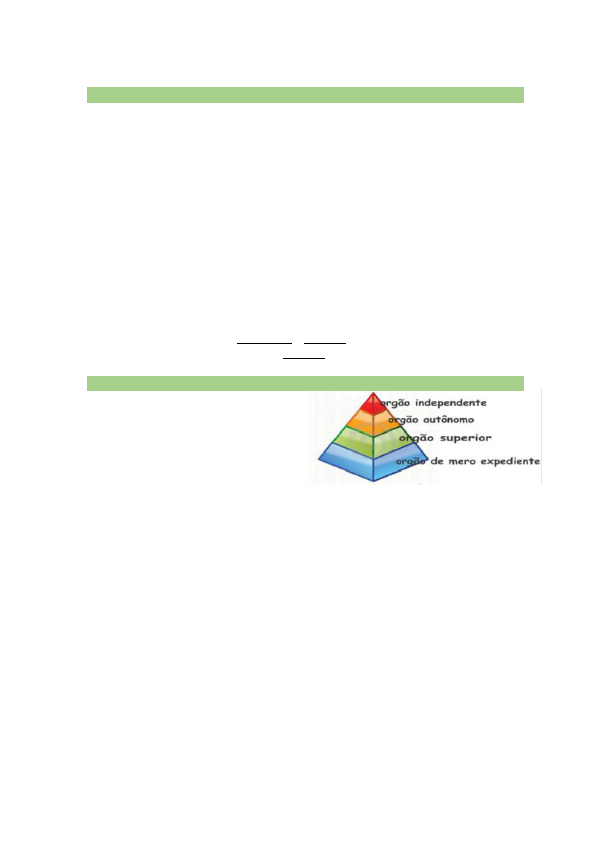 <p>Organização da Administração Pública</p><p>Desconcentração x Descentralização</p><p>Desconcentração:</p><p>✔ Fundada na Hierarquia;</p><p>✔ Distribuição interna de competência dentro de uma mesma pessoa jurídica;</p><p>Descentralização:</p><p>✔ A administração direta descentraliza para administração indireta.</p><p>✔ Fundada na Vinculação; (vinculação = obrigação; obrigação em não se desvincular dos</p><p>fins previstos por sua lei instituidora) Ex.: uma autarquia é obrigada a seguir as</p><p>diretrizes traçadas pela lei que a instituiu)</p><p>✔ Distribuição de competência para OUTRA pessoa jurídica;</p><p>✔ Pode ocorrer por Outorga ou Delegação:</p><p>● Outorga: transfere a Titularidade + Execução do serviço para PJ diversa do Estado;</p><p>● Delegação: transfere apenas a Execução; (a titularidade continua sendo do Estado);</p><p>Classificação dos Órgãos Públicos: (in al su su)</p><p>Órgãos Independentes:</p><p>✔ Situados no TOPO da pirâmide;</p><p>✔ São os órgãos originários da CF;</p><p>✔ Representam os 3 poderes;</p><p>✔ Não se subordinam a ninguém;</p><p>✔ Se sujeitam apenas a controle de outro poder (controle constitucional)</p><p>✔ Ex.: STF, STJ, CN, TRF;</p><p>Órgãos Autônomos:</p><p>✔ Situados no alto da estrutura organizacional da Administração;</p><p>✔ Fica abaixo dos Órgãos Independentes e subordinado a seus agentes;</p><p>✔ Possuem Autonomia Técnica, Administrativa e Financeira (TAF);</p><p>✔ Função: de direção, planejamento, supervisão e controle;</p><p>✔ Devem observar as diretrizes traçadas pelos órgãos independentes;</p><p>✔ Ex.: Ministérios; Secretarias; A.G.U.;</p><p>Órgãos Superiores:</p><p>✔ Não possuem autonomia administrativa, técnica e financeira;</p><p>✔ Subordinados aos órgãos independentes e autônomos;</p><p>✔ Possuem poder de decisão;</p><p>✔ Ex.: secretarias gerais; procuradorias administrativas; gabinetes; coordenadorias;</p><p>departamentos; divisões;</p><p>Órgãos Subalternos ou de Mero Expediente:</p><p>✔ Formam a base (chão) da pirâmide;</p><p>✔ Exercem atividades de rotina;</p><p>✔ Não possuem autonomia;</p><p>✔ São órgãos de execução;</p><p>✔ Ex.: Zeladorias; Portarias; Sessões de Expediente; Protocolo; de pessoal; de material;</p><p>Administração Indireta</p><p>Características comuns aos entes da Administração Indireta:</p><p>✔ Personalidade Jurídica Própria;</p><p>✔ Patrimônio Próprio;</p><p>✔ Autonomia Administrativa e Financeira;</p><p>✔ Precisa de lei específica prevendo sua criação (seja lei criadora ou autorizadora)</p><p>✔ É controlada pelo ente da Administração Direta quanto ao cumprimento das suas</p><p>atividades;</p><p>Fundações Públicas de Direito Privado:</p><p>✔ Pessoa Jurídica de Direito Privado;</p><p>✔ A sua criação é autorizada por lei específica;</p><p>✔ Sem fins lucrativos;</p><p>✔ Possuem autonomia administrativa; (não política)</p><p>✔ Funcionamento custeado pela União e outra fontes;</p><p>✔ Depende de registro;</p><p>✔ Lei complementar que define suas áreas de atuação</p><p>✔ Não visa lucro</p><p>✔ Regime estatutário</p><p>✔ Não podem se desvincular dos fins previstos em sua lei instituidora</p><p>Fundações Públicas de Direito Público:</p><p>✔ Pessoa Jurídica de Direito Público;</p><p>✔ A própria lei específica cria essas fundações;</p><p>✔ Não depende de registro para serem instituídas</p><p>✔ É uma espécie de Autarquia (fundação autárquica ou autarquia fundacional)</p><p>✔ Assumem regime jurídico próprio de autarquias;</p><p>✔ Nomeação de dirigentes: Não pode ser submetida à aprovação de assembleia</p><p>legislativa prevista em legislação estadual;</p><p>Autarquias:</p><p>✔ Únicos entes da administração indireta que são criados por lei (o demais a lei apenas</p><p>autoriza sua criação)</p><p>✔ Pessoa jurídica de direito público</p><p>✔ Destinada a executar funções típicas do estado</p><p>✔ Não visa lucro</p><p>✔ Capital 100% público</p><p>✔ Regime estatutário</p><p>✔ Exploração de atividades econômica</p><p>✔ Nomeação de dirigentes: Não pode ser submetida à aprovação de assembleia</p><p>legislativa prevista em legislação estadual;</p><p>Sociedades de Economia Mista</p><p>✔ Pessoa Jurídica de Direito Privado</p><p>✔ Sociedade anônima</p><p>✔ Visa lucro</p><p>✔ Capital misto sendo 50% público e 50% privado</p><p>✔ Regime CLT</p><p>✔ A sua criação é autorizada por lei específica;</p><p>✔ Depende de registro;</p><p>✔ Contrato por colaboração - particulares</p><p>✔ Contrato por delegação - execução</p><p>✔ Em regra, são criadas com finalidade econômica. Porém, eventualmente, podem</p><p>prestar serviços públicos</p><p>✔ Não podem se desvincular dos fins previstos em sua lei instituidora</p><p>✔ Regra para criar empresas subsidiárias: depende de autorização legislativa;</p><p>o Exceção: pode sem autorização desde que haja previsão para esse fim na</p><p>própria lei que instituiu a SEM;</p><p>✔ Nomeação de dirigentes: Não pode ser submetida à aprovação de assembleia</p><p>legislativa prevista em legislação estadual;</p><p>✔ Regime de Precatórios: é aplicável desde que o serviço seja próprio do estado e de</p><p>natureza não concorrencial;</p><p>Empresas Pública</p><p>✔ Pessoa jurídica de direito privado</p><p>✔ A sua criação é autorizada por lei específica;</p><p>✔ Depende de registro;</p><p>✔ Visa lucro</p><p>✔ Capital 100% publico</p><p>✔ Regime CLTs</p><p>✔ Não podem se desvincular dos fins previstos em sua lei instituidora</p><p>✔ Regra para criar empresas subsidiárias: depende de autorização legislativa;</p><p>o Exceção: pode sem autorização desde que haja previsão para esse fim na</p><p>própria lei que instituiu a empresa pública;</p